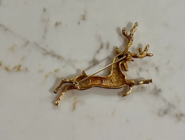 Add a touch of vintage holiday magic to your collection with this signed Hedy flying reindeer brooch. Crafted in shimmering gold-tone metal with textured detailing, this elegant reindeer features white enamel antlers and hooves and a collar of multicolor rhinestones in festive red, blue, and amber tones.