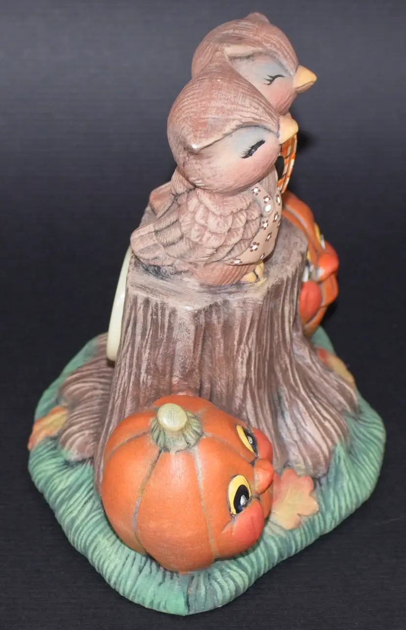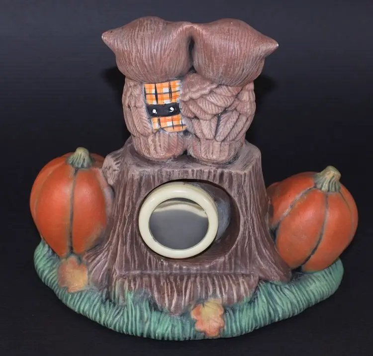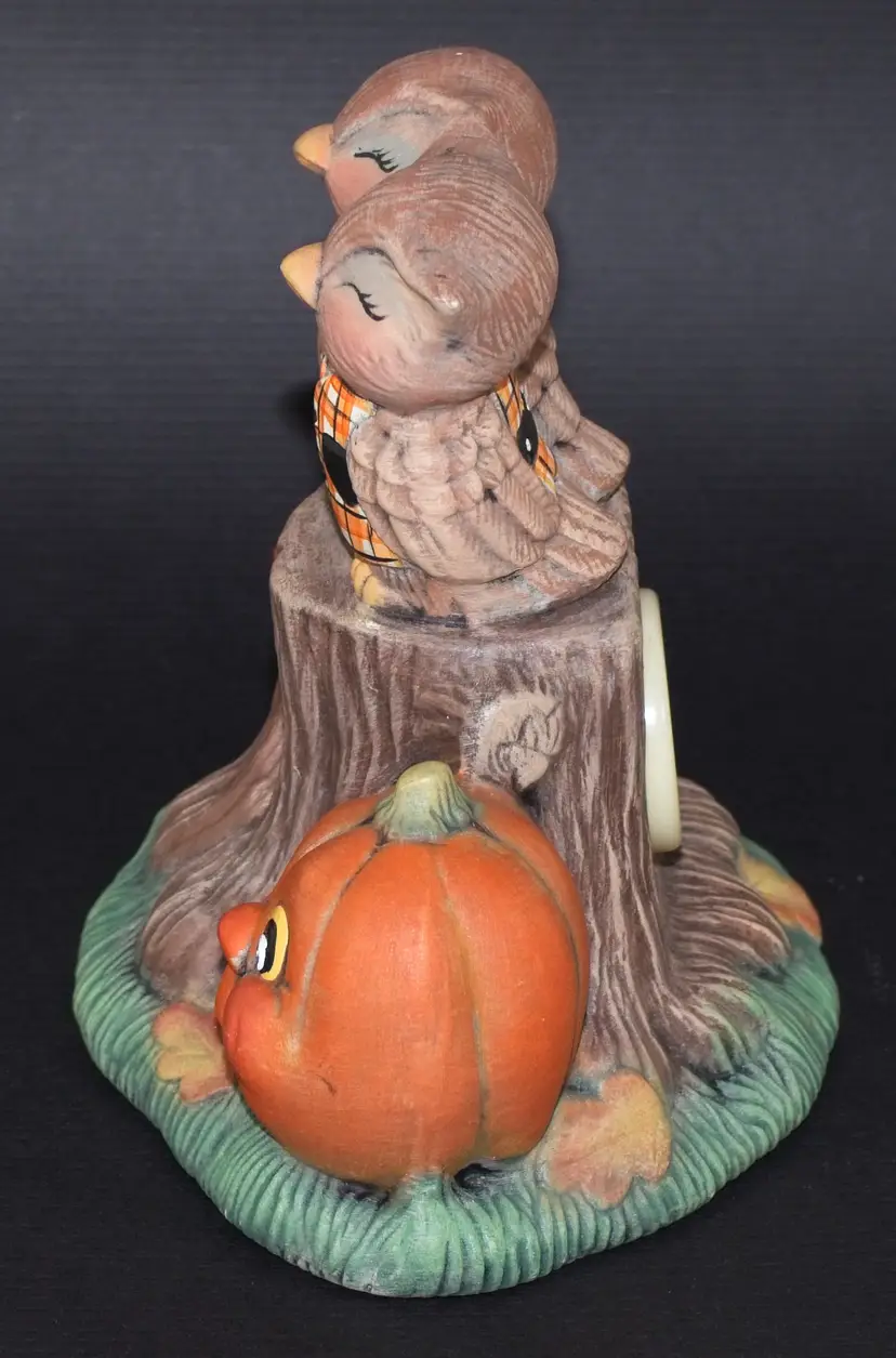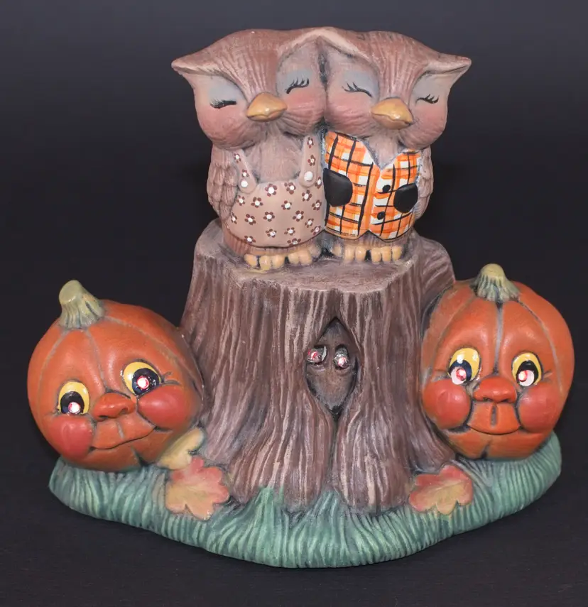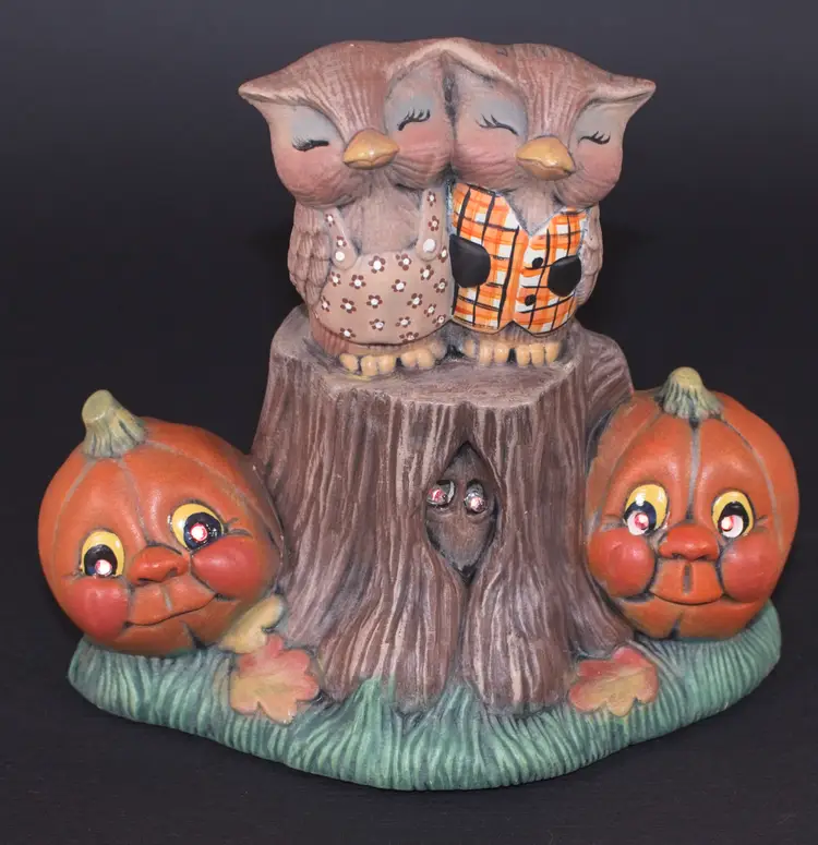Vintage Hobbyist Halloween Ceramic Flashing Lights Owl Pumpkin Sculpture Figurine Musical. Pumpkin Eyes and eyes in stump flash red and plays a spooky song. See attached video. In good condition. 6" wide x 4.5" deep x 6" tall.
