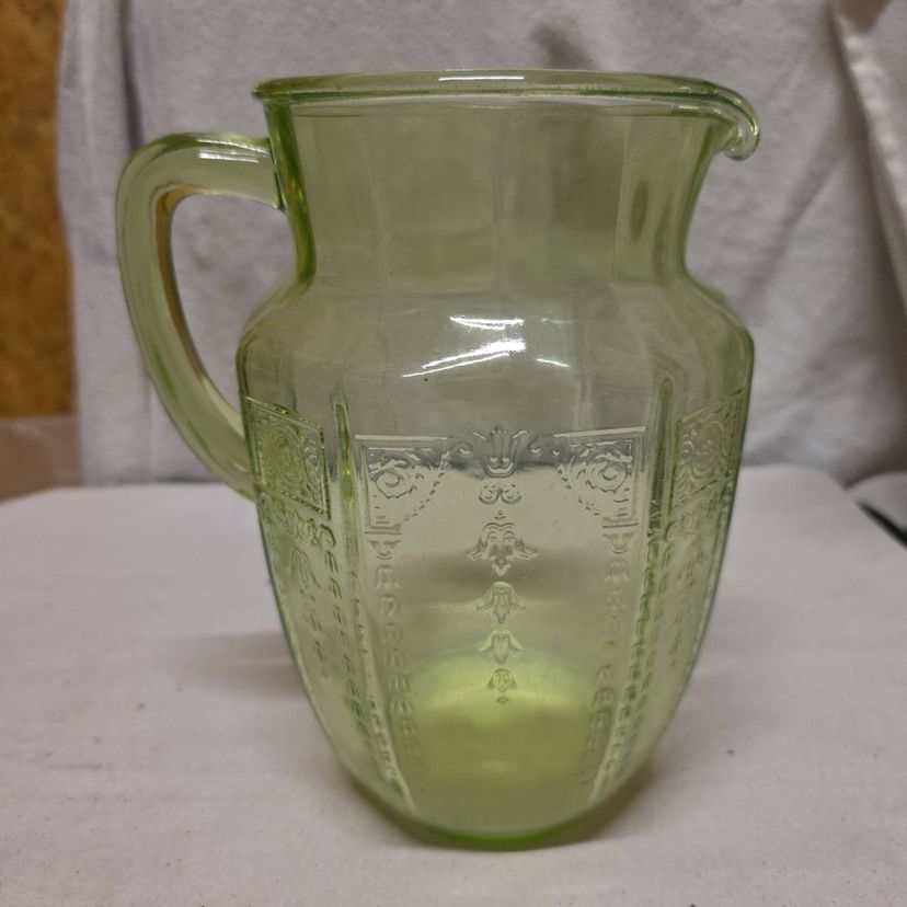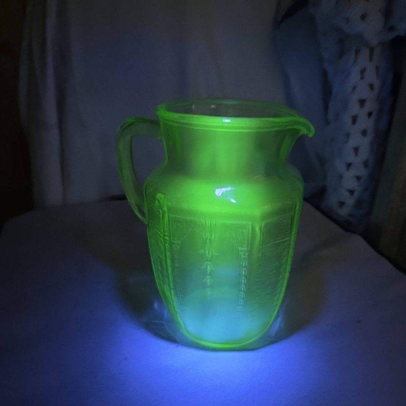 The Vintage Anchor Hocking Uranium Glass "Princess" Pattern 1930s 60 oz Pitcher is a unique and beautiful piece of glassware that glows under black light due to its uranium content. Handmade in Ohio by Anchor Hocking in the 1930s, this pitcher features a decorative all-over pattern with a flower theme, typical of the Great Depression era. With a capacity of 60 oz and a height of 8.5 inches, this pitcher is not only functional but also adds a touch of vintage charm to any table setting. Made with a shiny finish and refrigerator-safe, this rare find is a true collectible item for glassware and uranium enthusiasts.