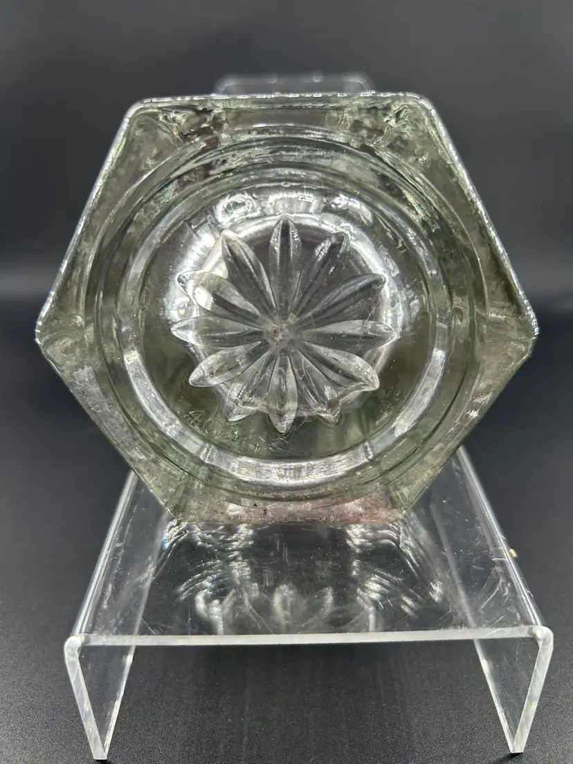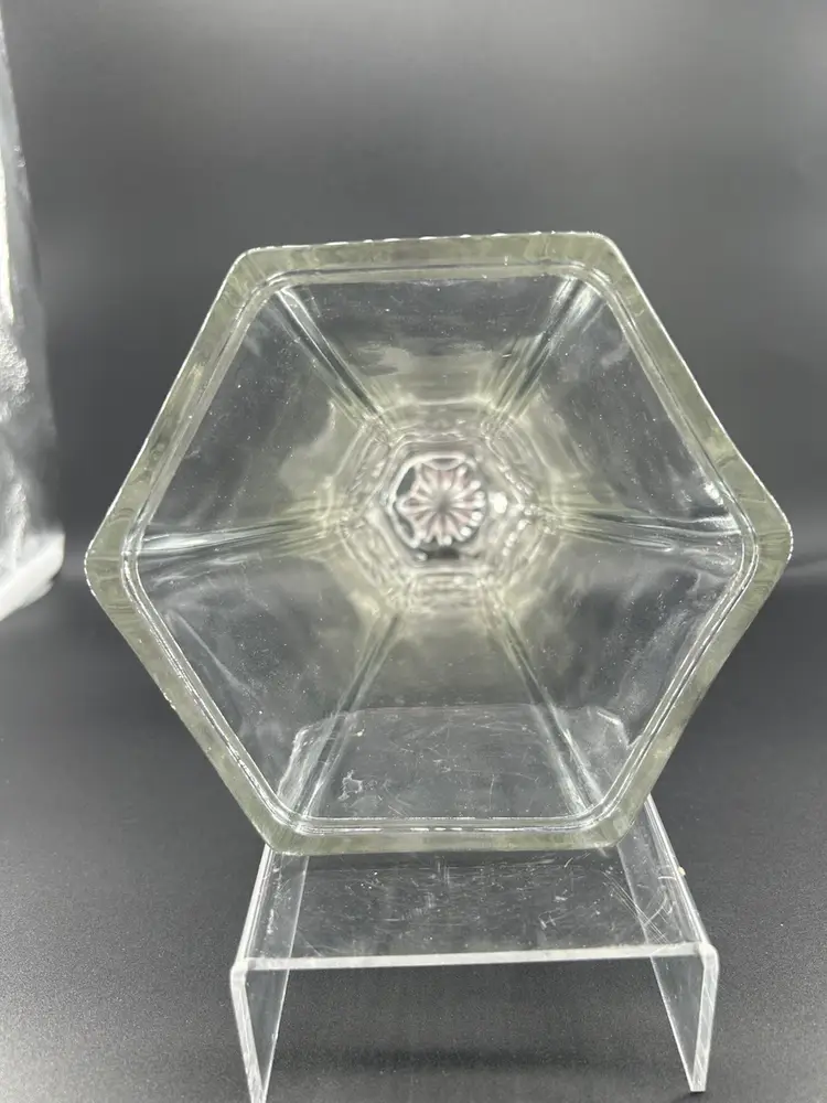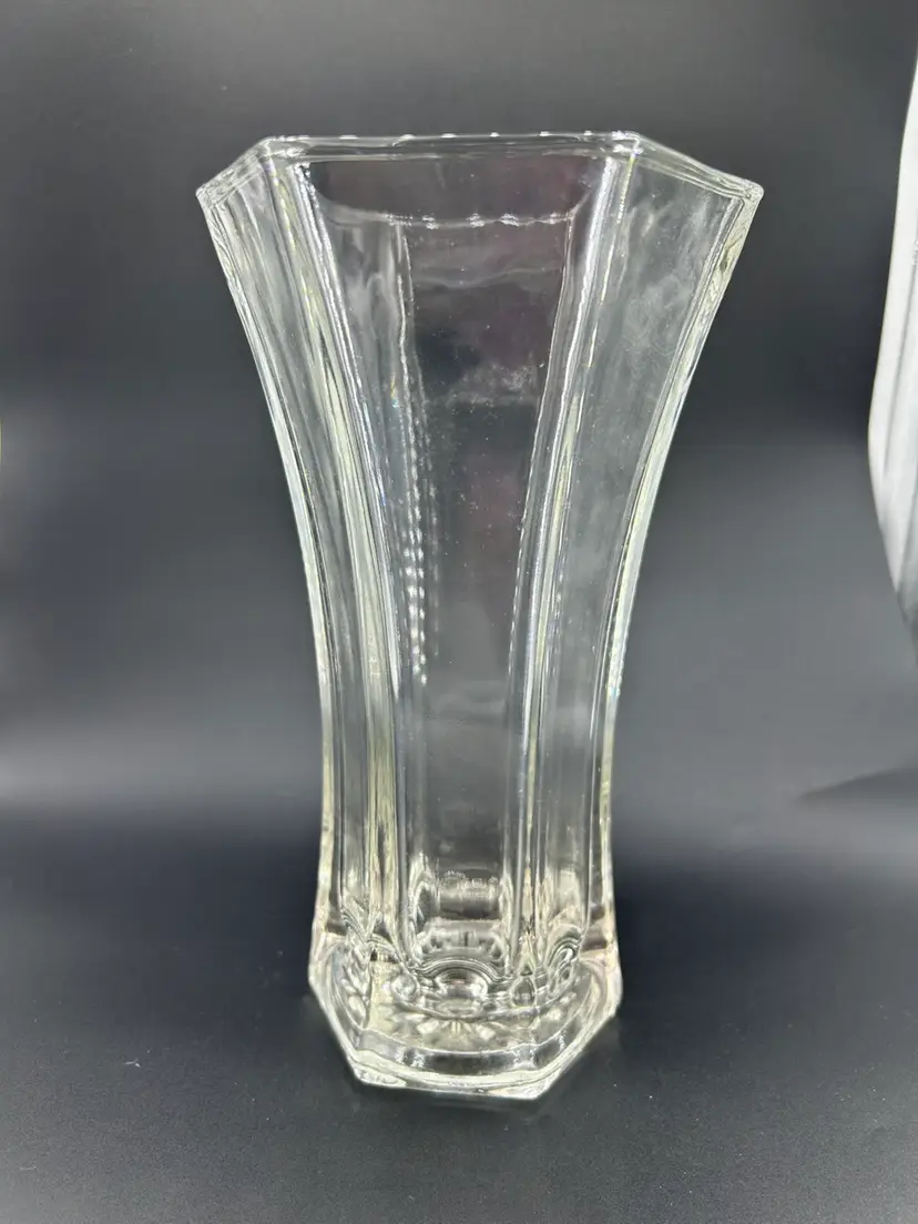 This is a vintage Hoosier glass 4041 clear glass vase with a 6-sided hexagon shape. It was made in the 70's. It stands 9 inches tall and 5 inches across. There are no chips or cracks.