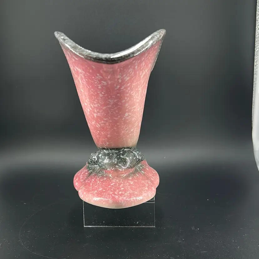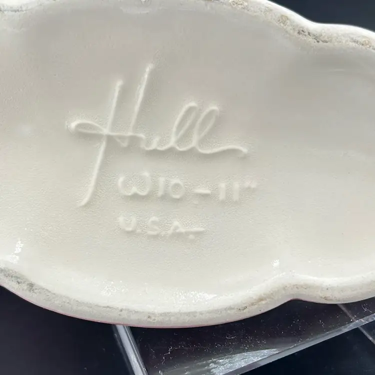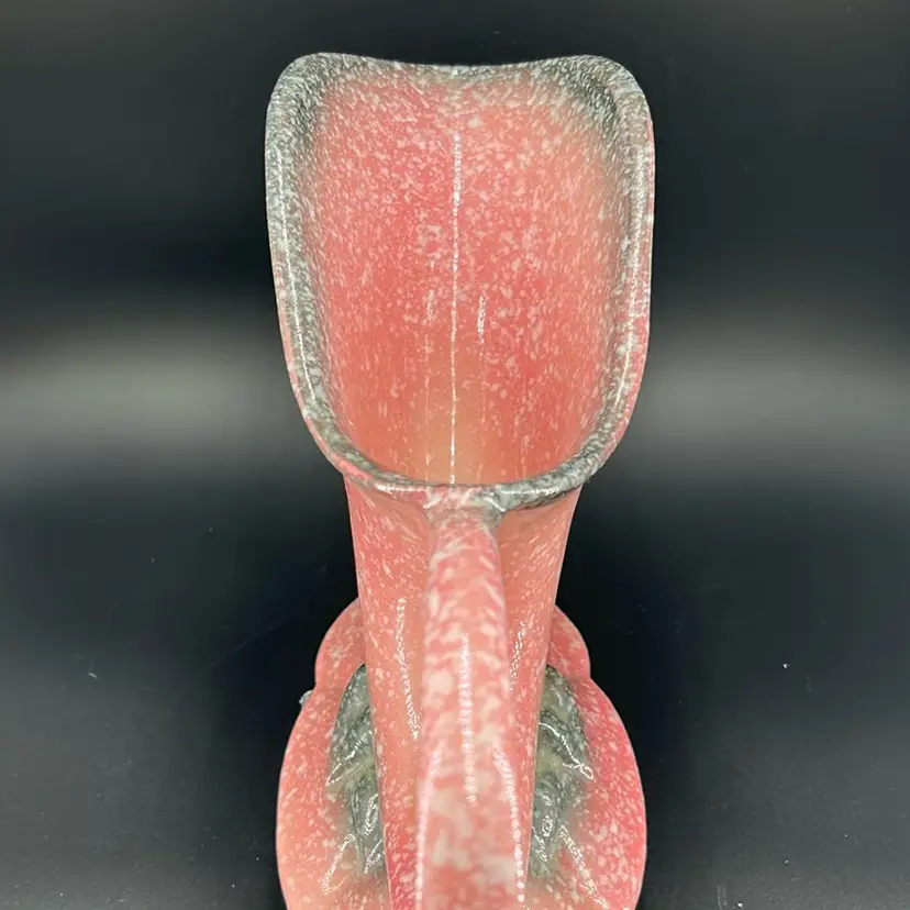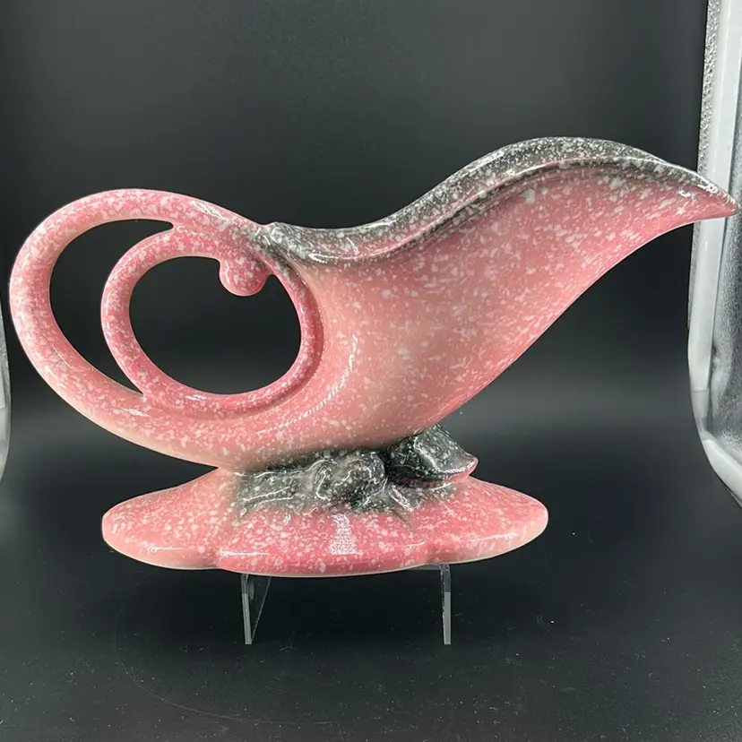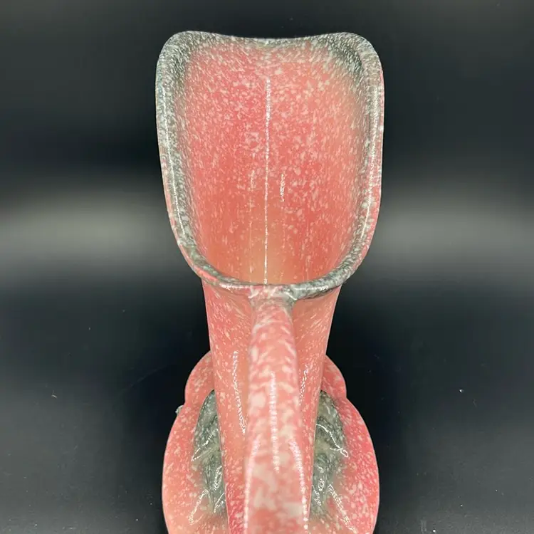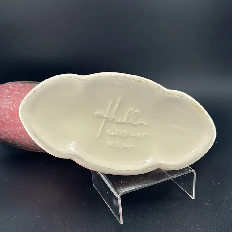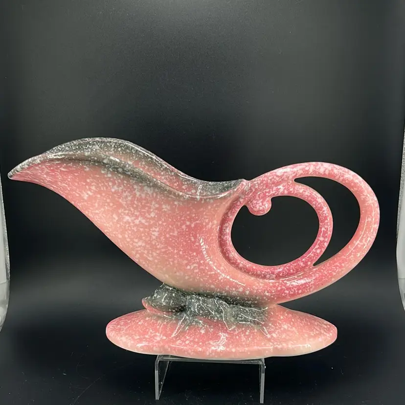 Made in the 1950’s, this pottery made by Hull. Can be used as either a planter or a vase. It has a grey and pink splatter design. It stands approximately 6 inches tall and 11 inches wide. Very nice piece. No chips or cracks.