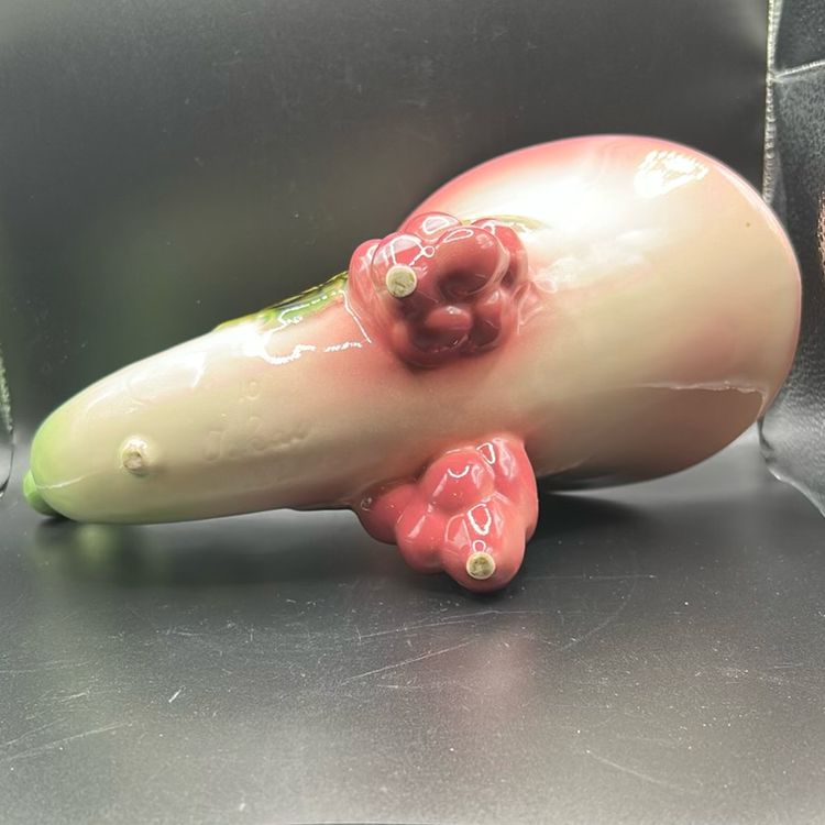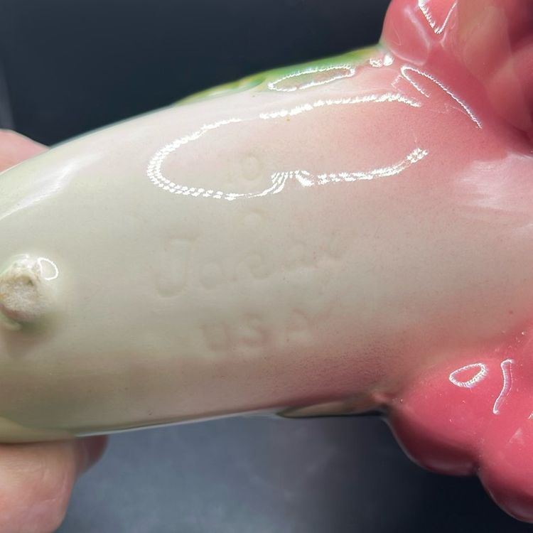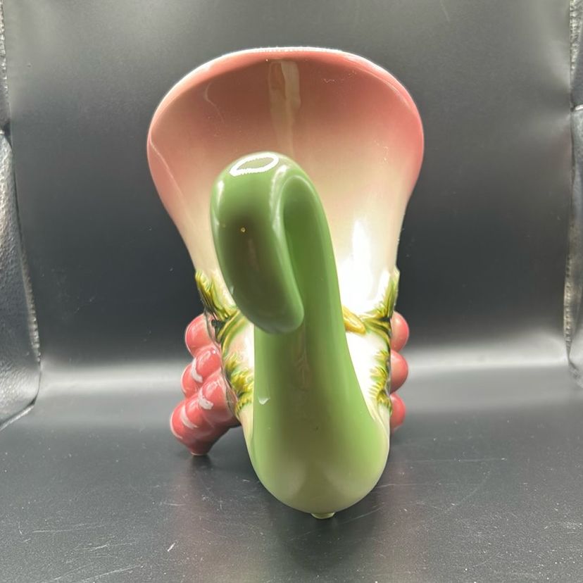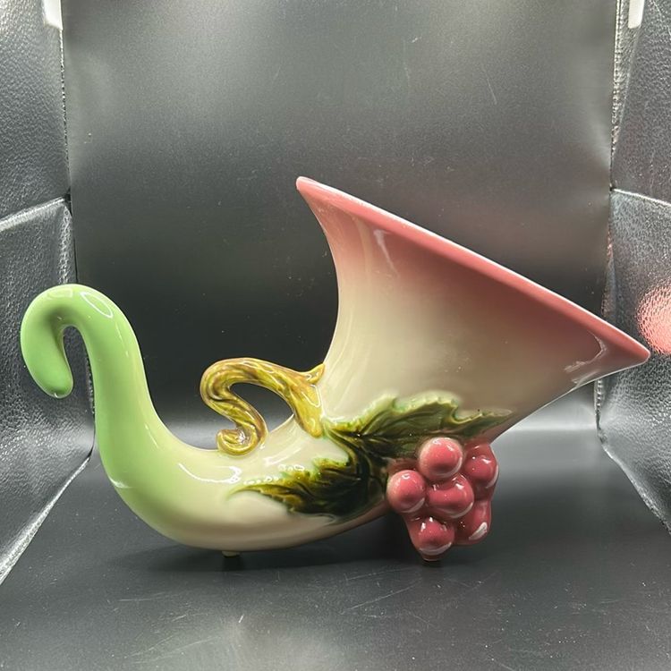 This item is a vintage Hull pottery Tokay cornucopia vase. It comes from the mid 20th century. It has a pink and green color scheme with a grapevine motif. It stands 7 1/2 inches tall and about 9 inches wide. There are no chips or cracks