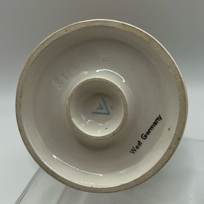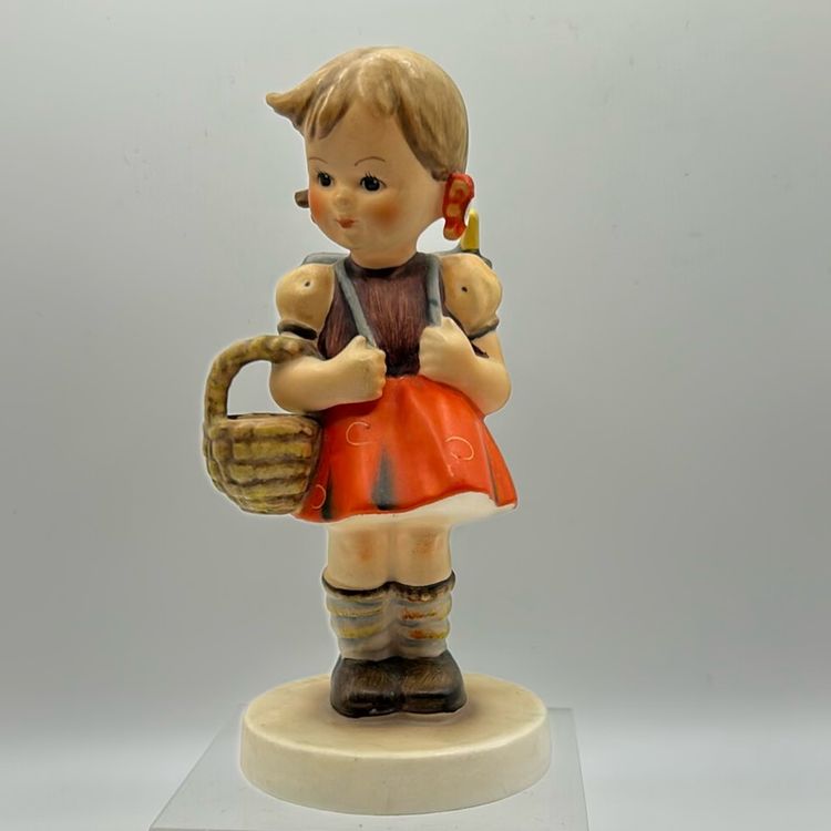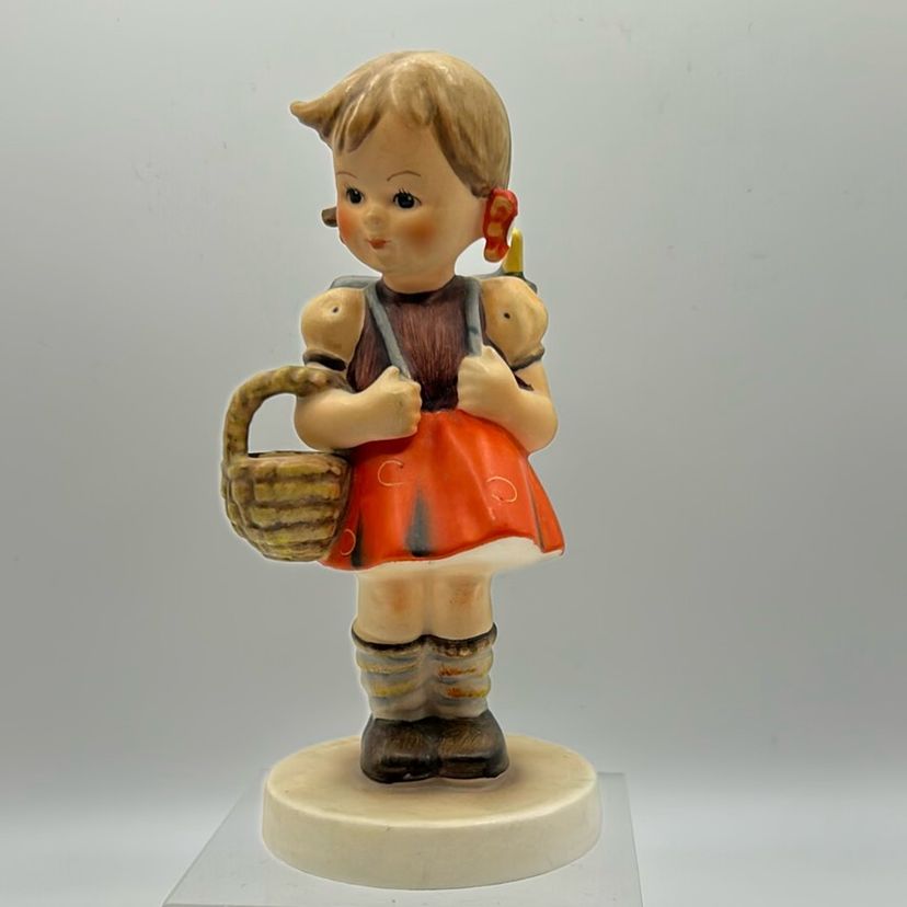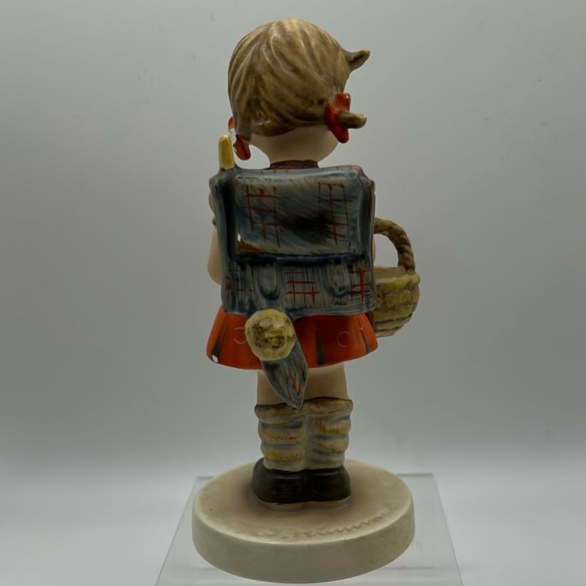 This is a humble figurine made in West Germany. This pace is entitled school girl. She stands 5 inches tall and about 2 1/2 inches wide. She does have three small condition issues. She has a paint scuff on the corner of her backpack, the left-hand side of her dress, and the most significant one is on the back of the bow on her left-hand side. None of these blemishes can be seen from the front.