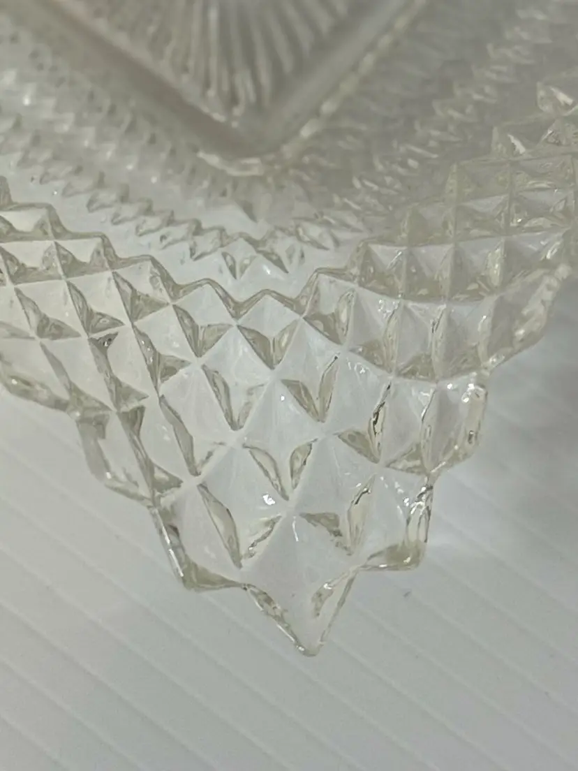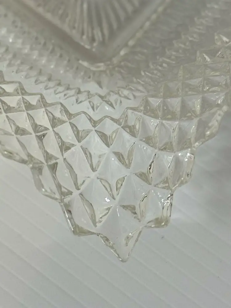 Clear glass with strong sparkle and detail. Perfect for candy, serving, keys, or jewelry. No chips or cracks or scratches. 6”x1.5”
