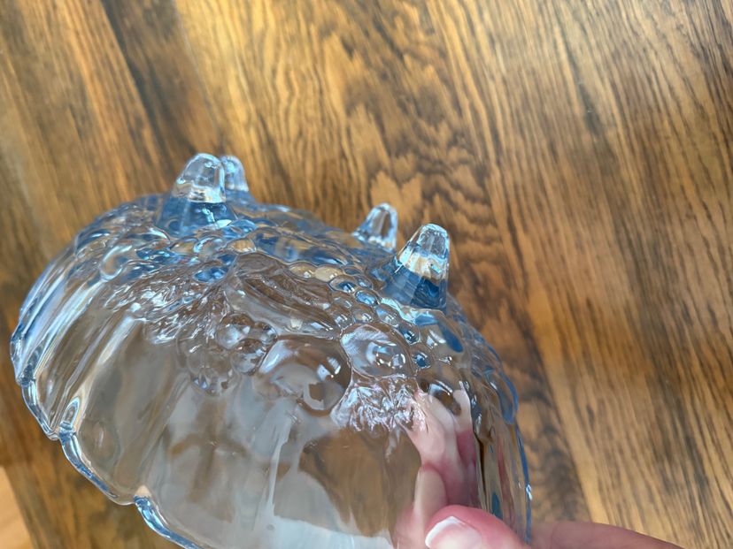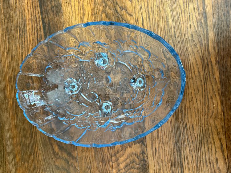 Beautiful vintage Harvest pattern pressed glass bowl by Indiana Glass, featuring raised clusters of grapes and scrolling leaves. The scalloped rim and three short feet give this piece a classic mid-century charm. In a delicate ice-blue color, it makes a perfect centerpiece or fruit bowl for vintage or farmhouse-style décor.