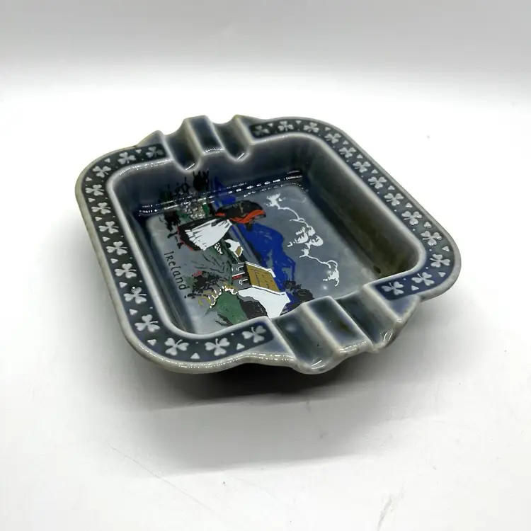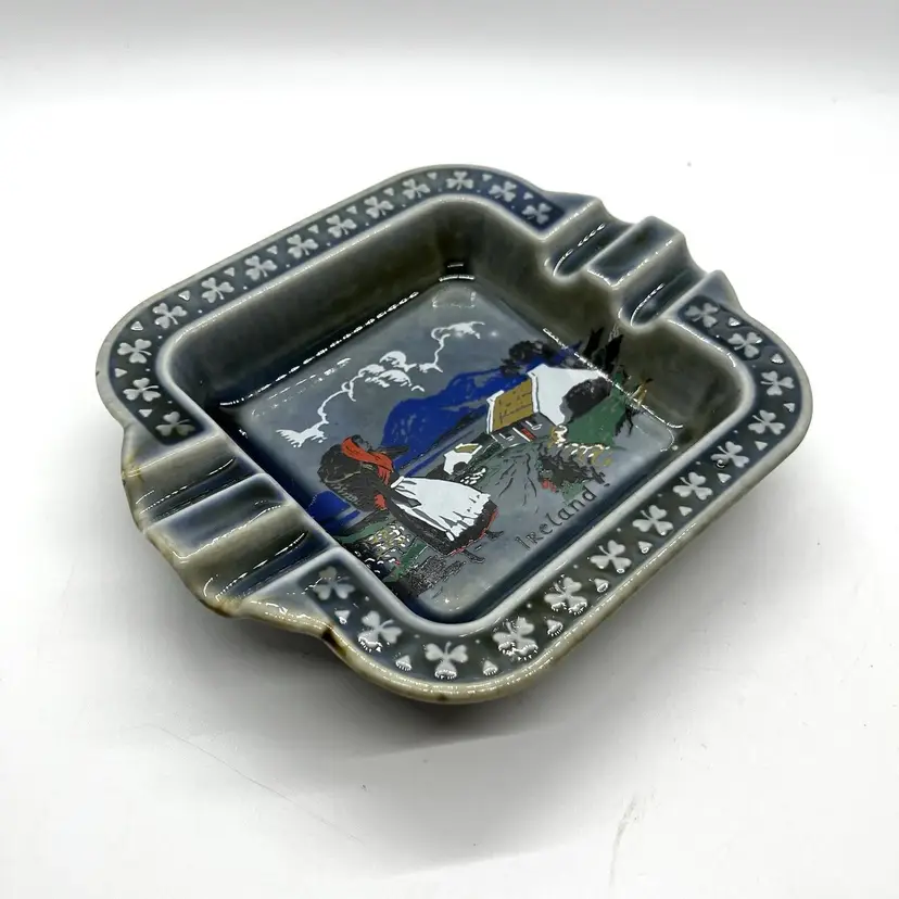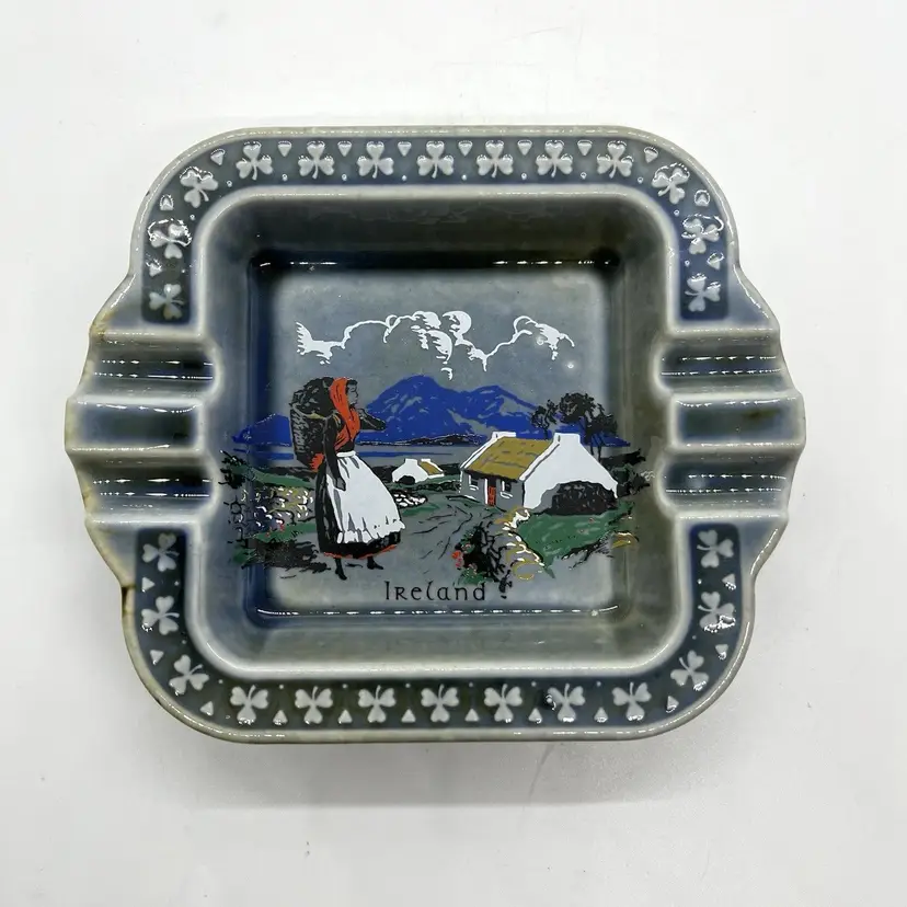 This is a porcelain ashtray made by Wade Co Armagh. Features an Irish countryside scene. There's a small paint chip on the underside of the rim as pictured, no other damages. Measures about 6" diameter.