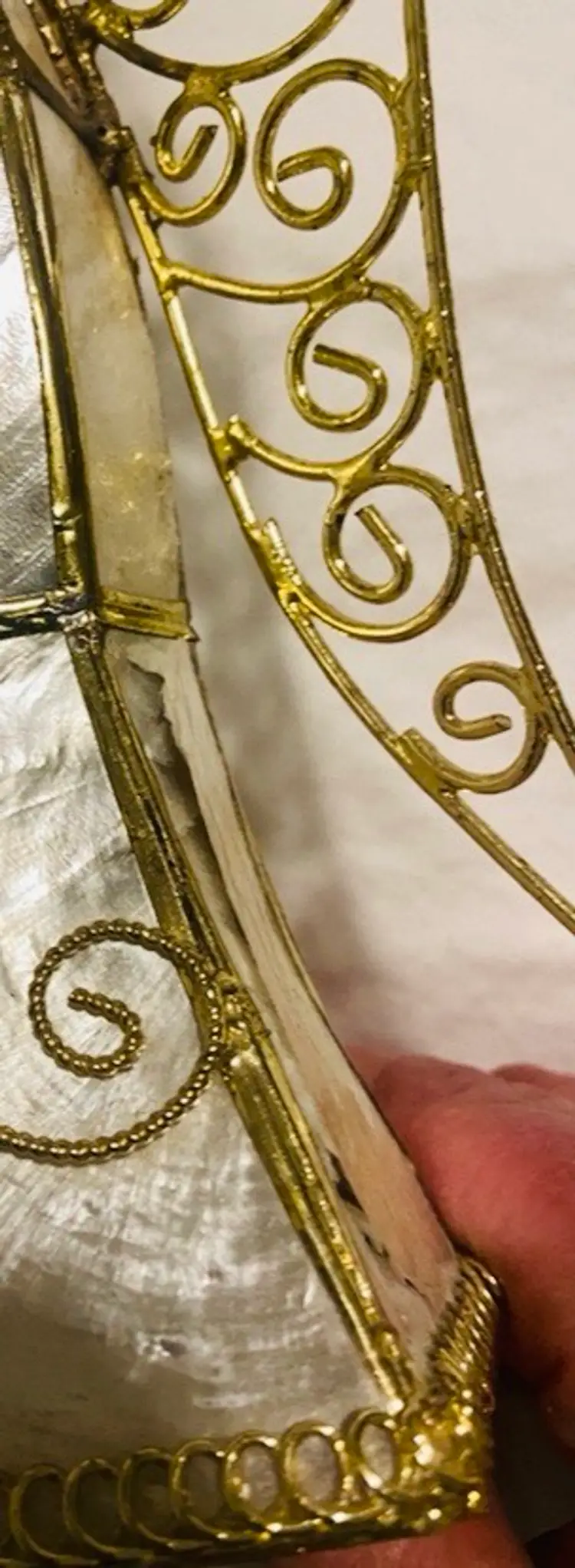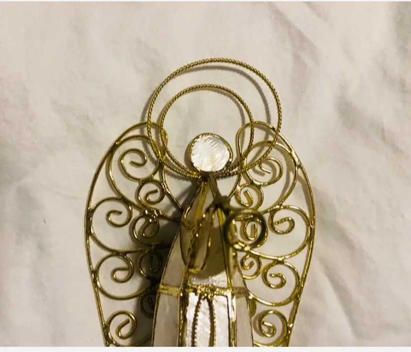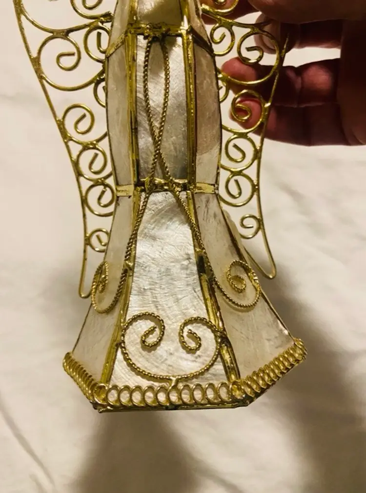 This vintage iridescent capiz shell and gold metal angel, whether perched atop your Christmas tree or displayed on a mantel or tabletop, adds a warm, nostalgic shimmer to your festive space. Handcrafted in the Philippines from genuine capiz shells with gold metal accents, this piece beautifully reflects light, creating a soft, pearly radiance. The shell is separated on the left side of the angel (see pic), it is still beautiful.