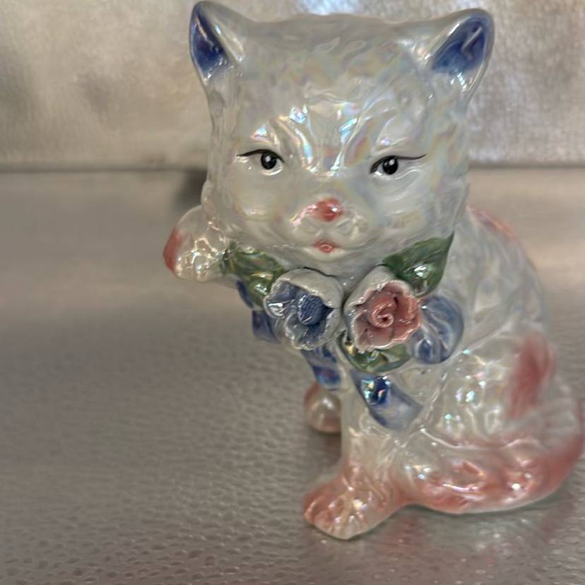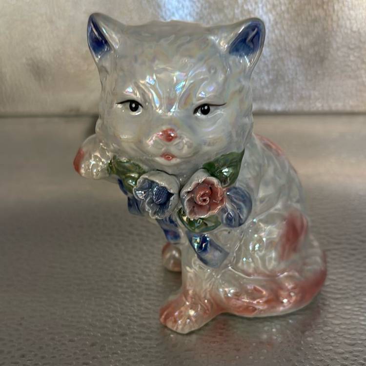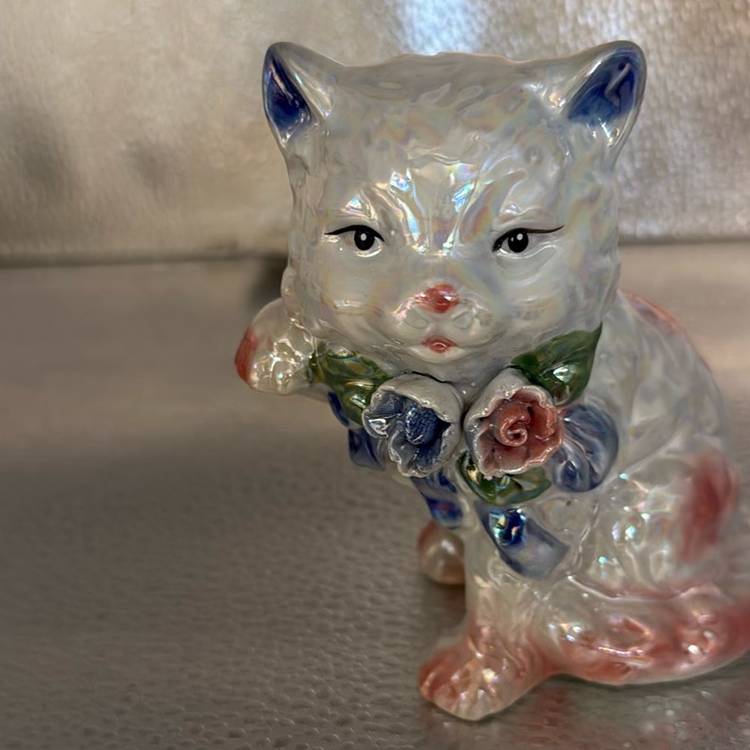 This cat screams vintage from the glaze to the 3D flowers. It’s so beautiful with blue, pink and green. Bring this beautiful piece back and display it proudly. Give it as a gift or keep it as your own !