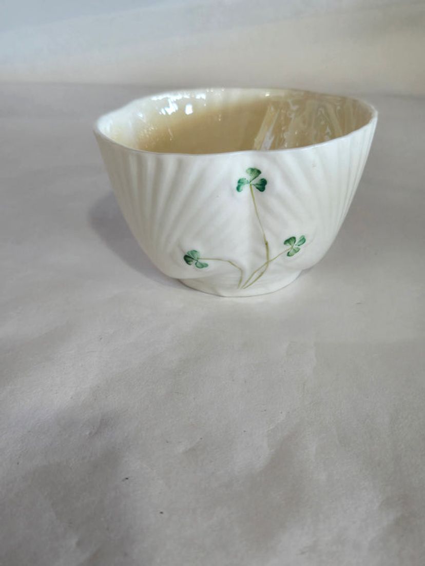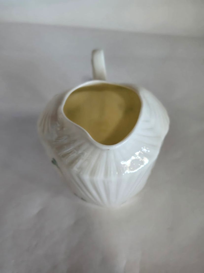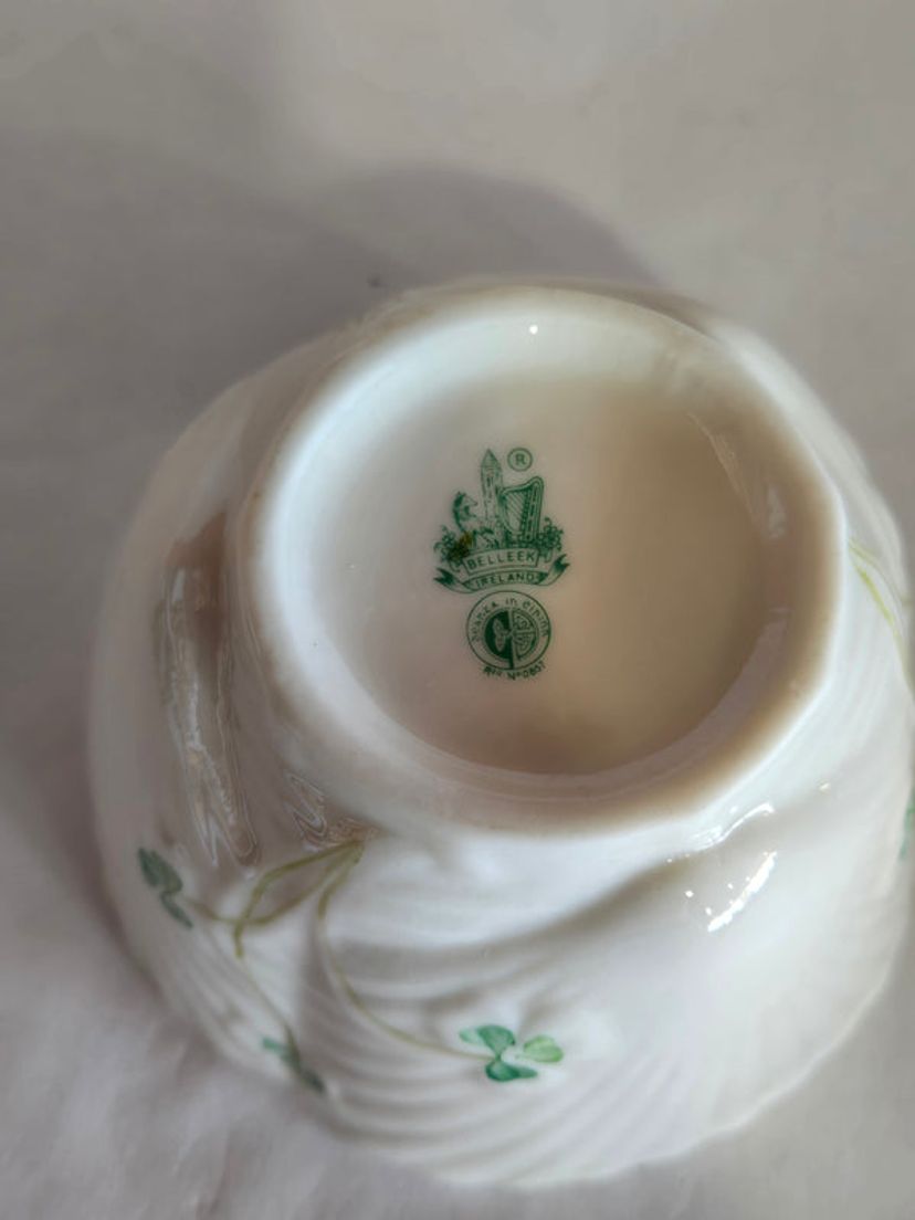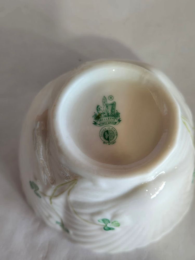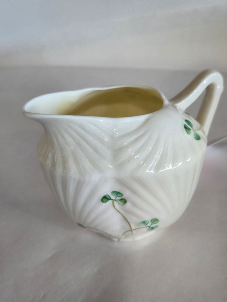 This vintage Irish Belleek creamer and sugar dish set features the iconic shamrock motif, symbolizing good fortune and heritage. Crafted with delicate porcelain, it offers a refined texture and subtle translucency typical of Belleek pottery. Perfect for collectors or those seeking to enhance their tea service, this set combines timeless elegance with traditional Irish craftsmanship. Its graceful design and detailed shamrock accents bring an authentic touch to any table setting.