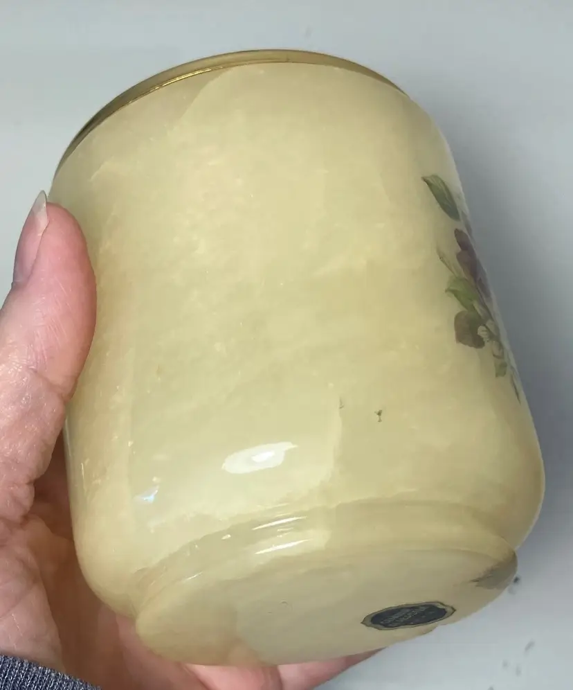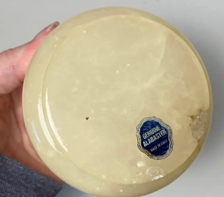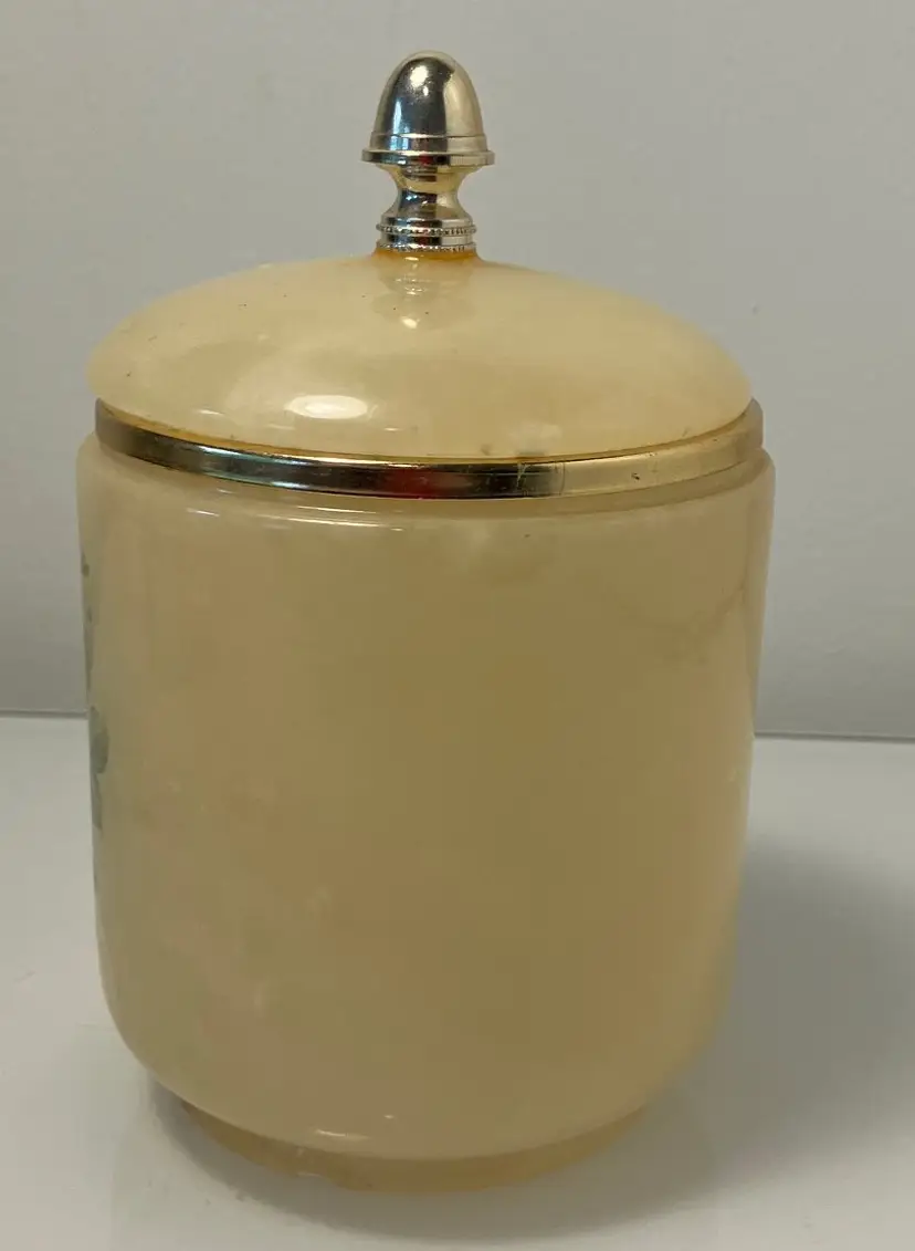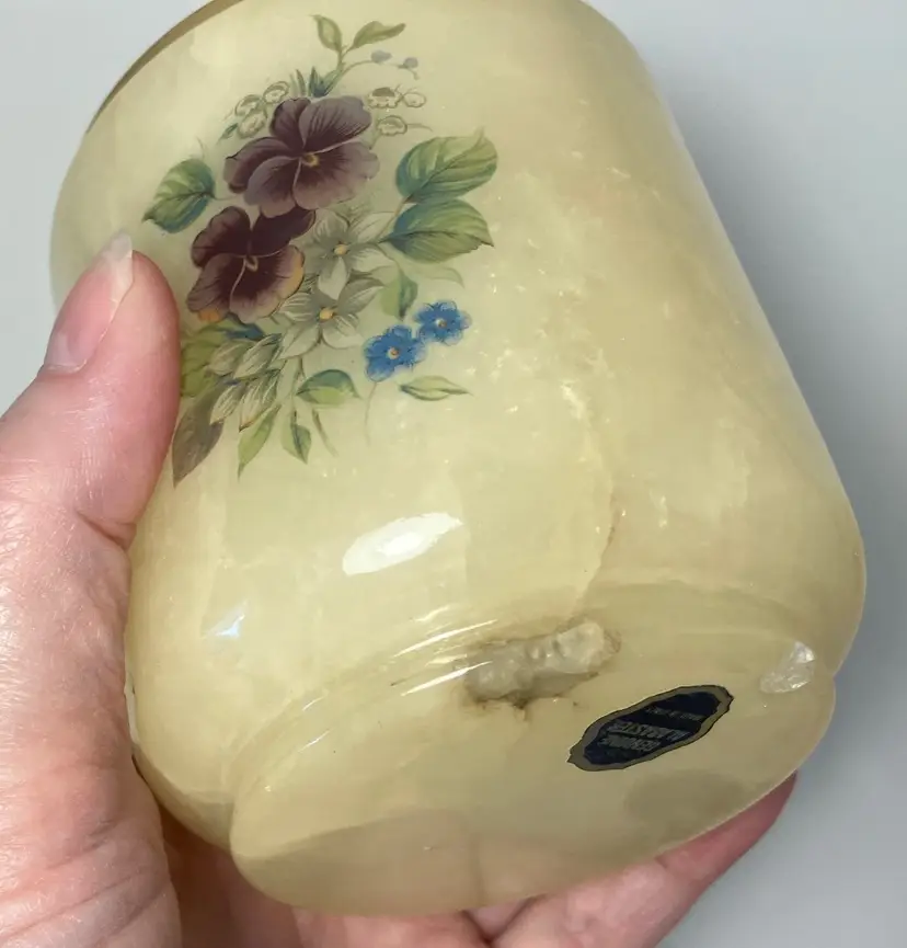 Beautiful Alabaster Container with Transferred image of flowers on the front. The image is intact. There 3 small bumps on the top of the cover and a discolored area on the bottom of vessel. There is some yellowing of the area around the metal top. There are several areas that look like cracks but these areas are smooth. Dimensions: 5 1/2" tall with cover on and about 3 1/2" tall without the cover. About 3 1/4" at is widest diameter. Weighs over 1 lb.