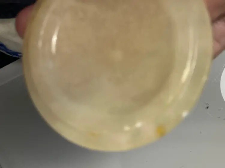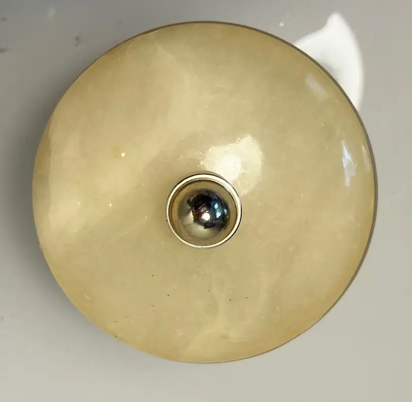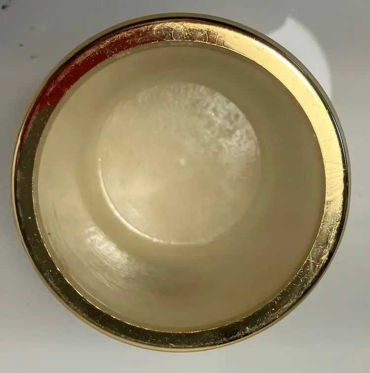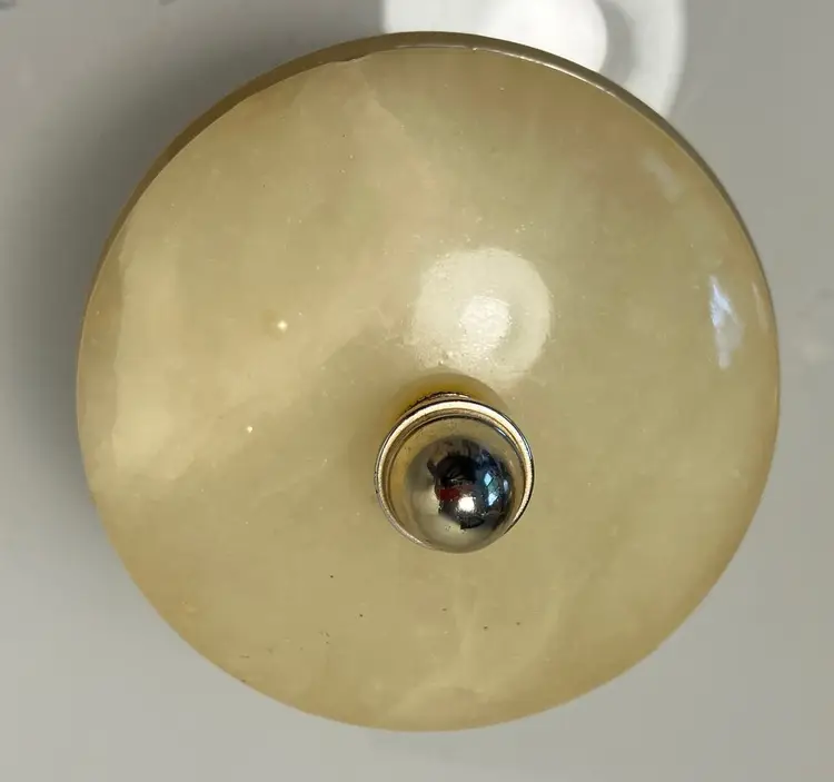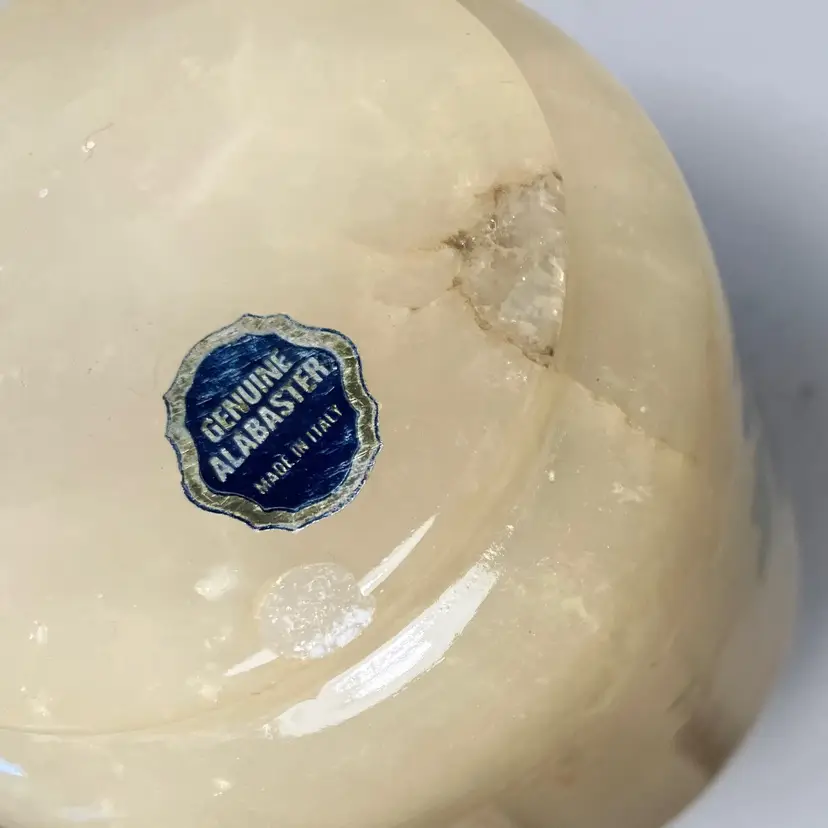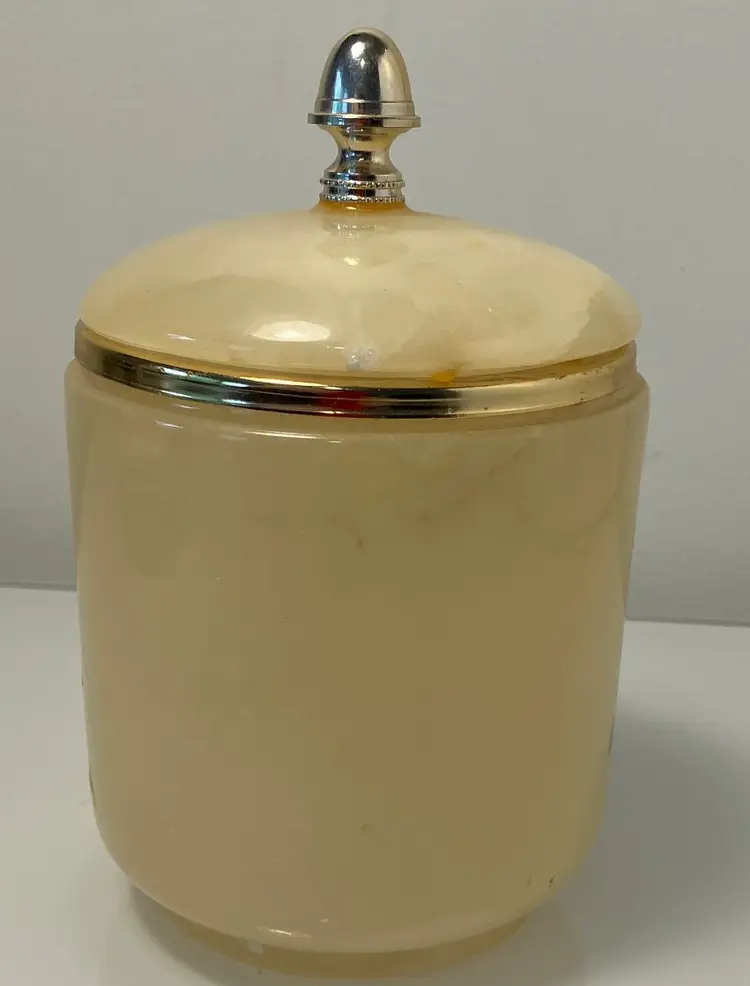 Beautiful Alabaster Container with Transferred image of flowers on the front. The image is intact. There 3 small bumps on the top of the cover and a discolored area on the bottom of vessel. There is some yellowing of the area around the metal top. There are several areas that look like cracks but these areas are smooth. Dimensions: 5 1/2" tall with cover on and about 3 1/2" tall without the cover. About 3 1/4" at is widest diameter. Weighs over 1 lb.