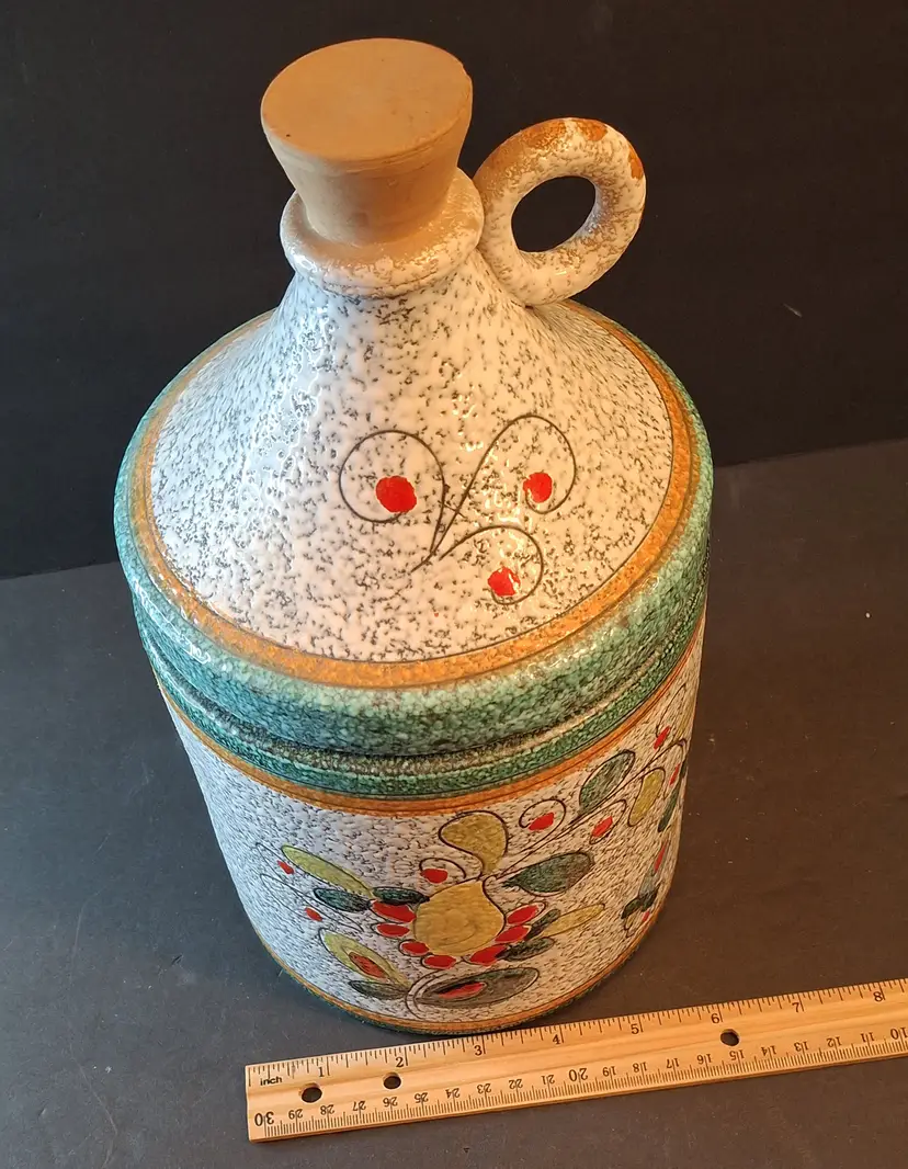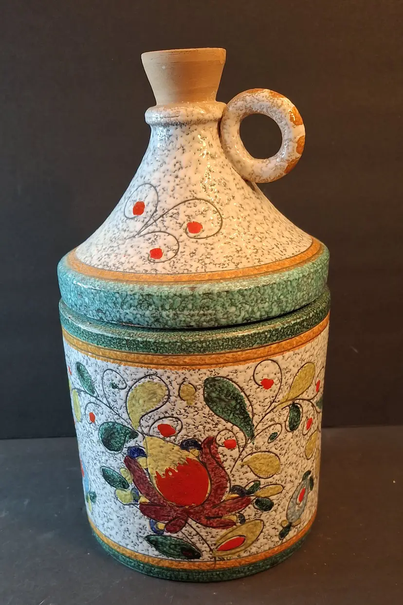 Add a touch of mid-century European charm to your collection with this exquisite vintage Italian ginger jar, crafted circa 1950. Designed to resemble a rustic jug, this ceramic piece showcases a delicate floral motif, bringing elegance and warmth to any space. The bottom is marked “Italy,” affirming its authenticity and heritage. Made by Fratelli Fanciullos Sgraffito.