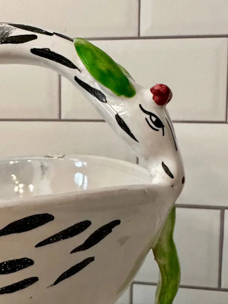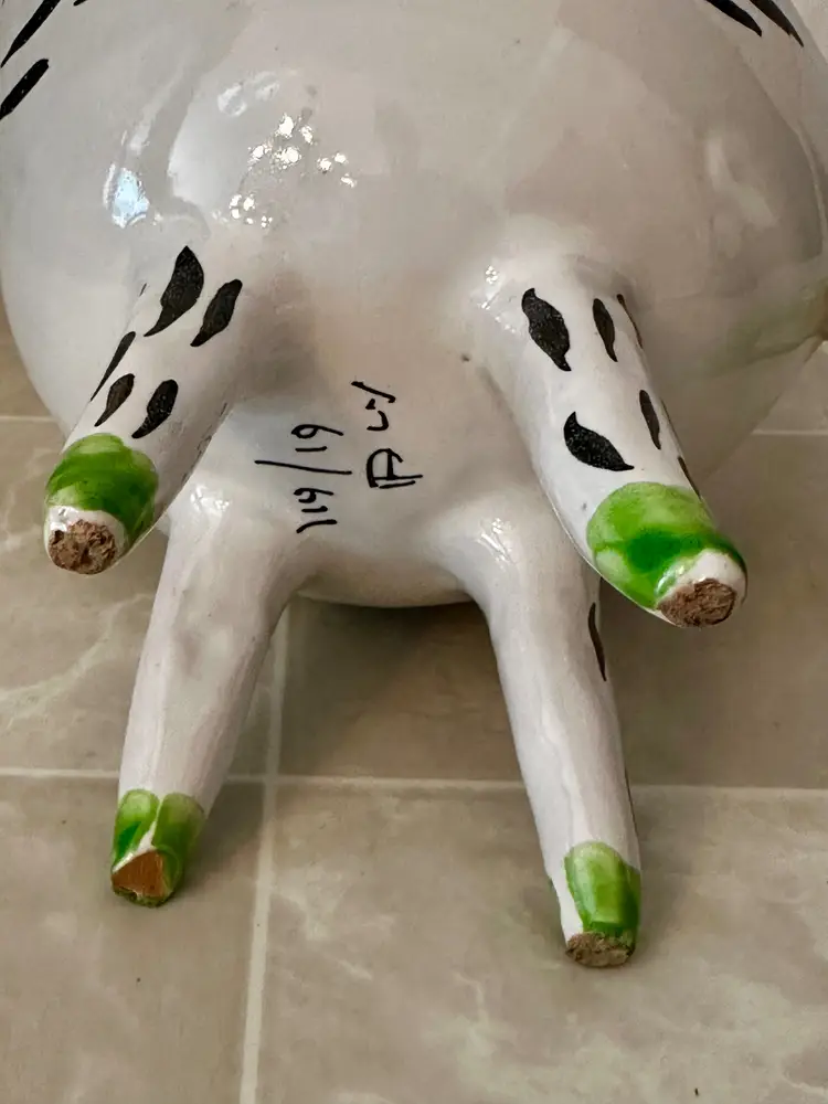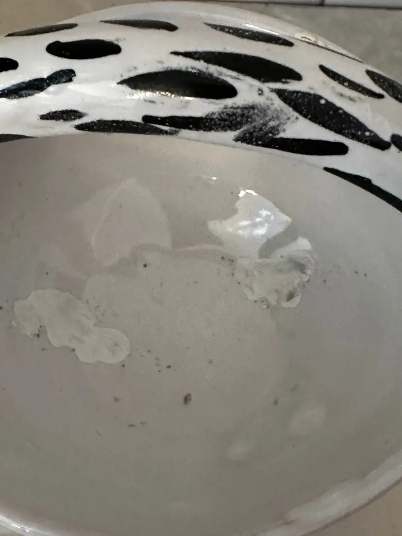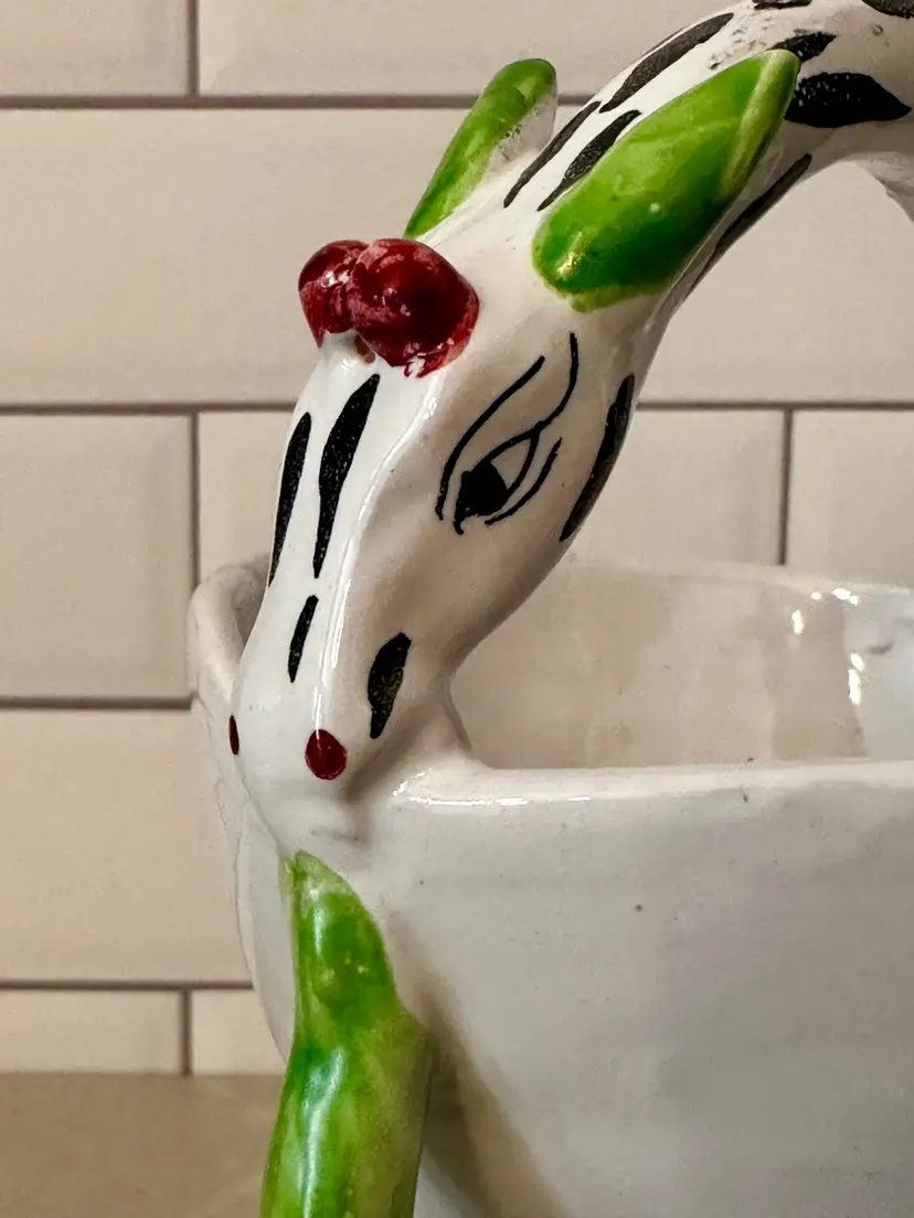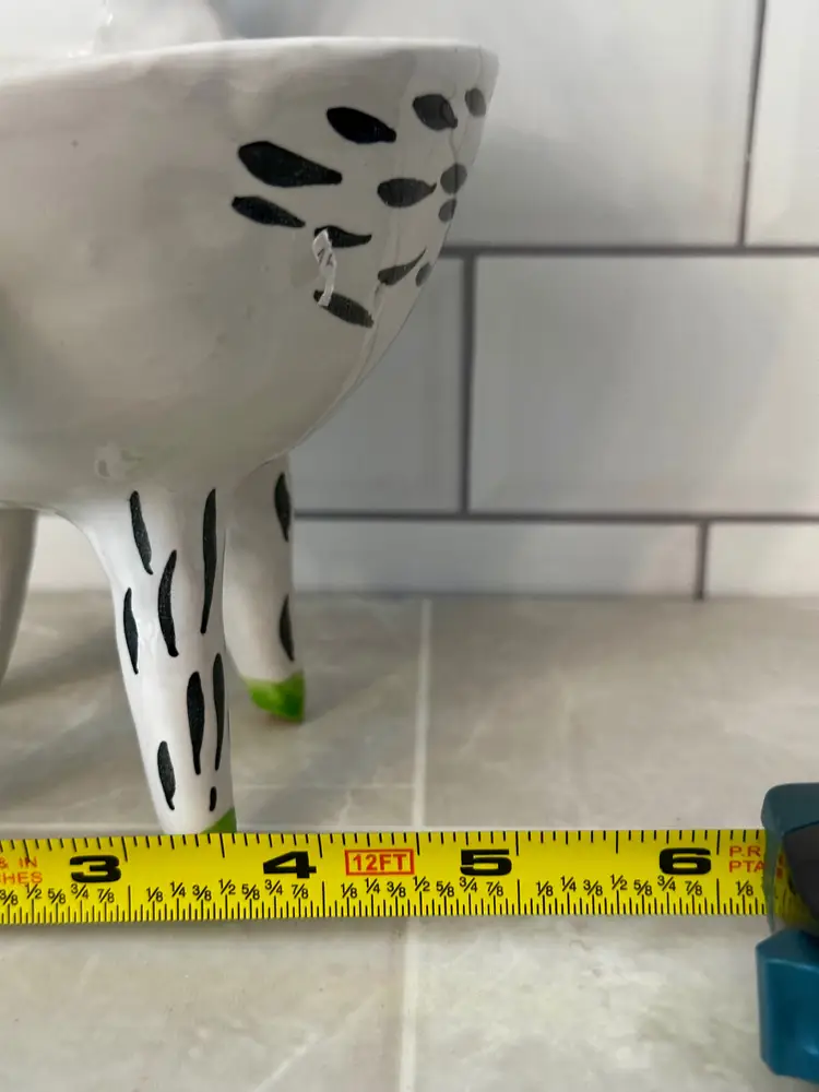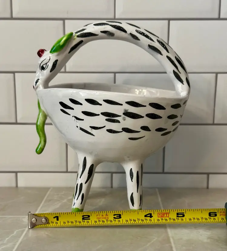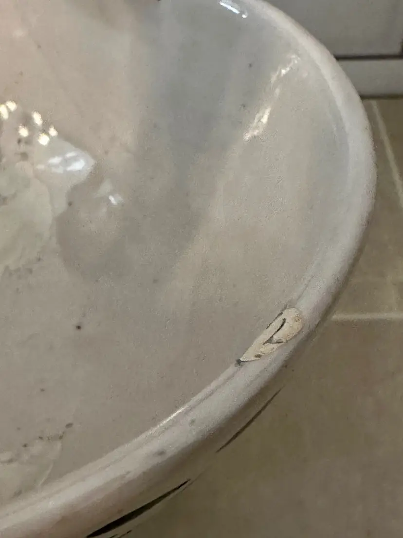 Good Condition. No cracks but I do see one chip with a repair. The other areas in the bowl of the planter are touch ups,