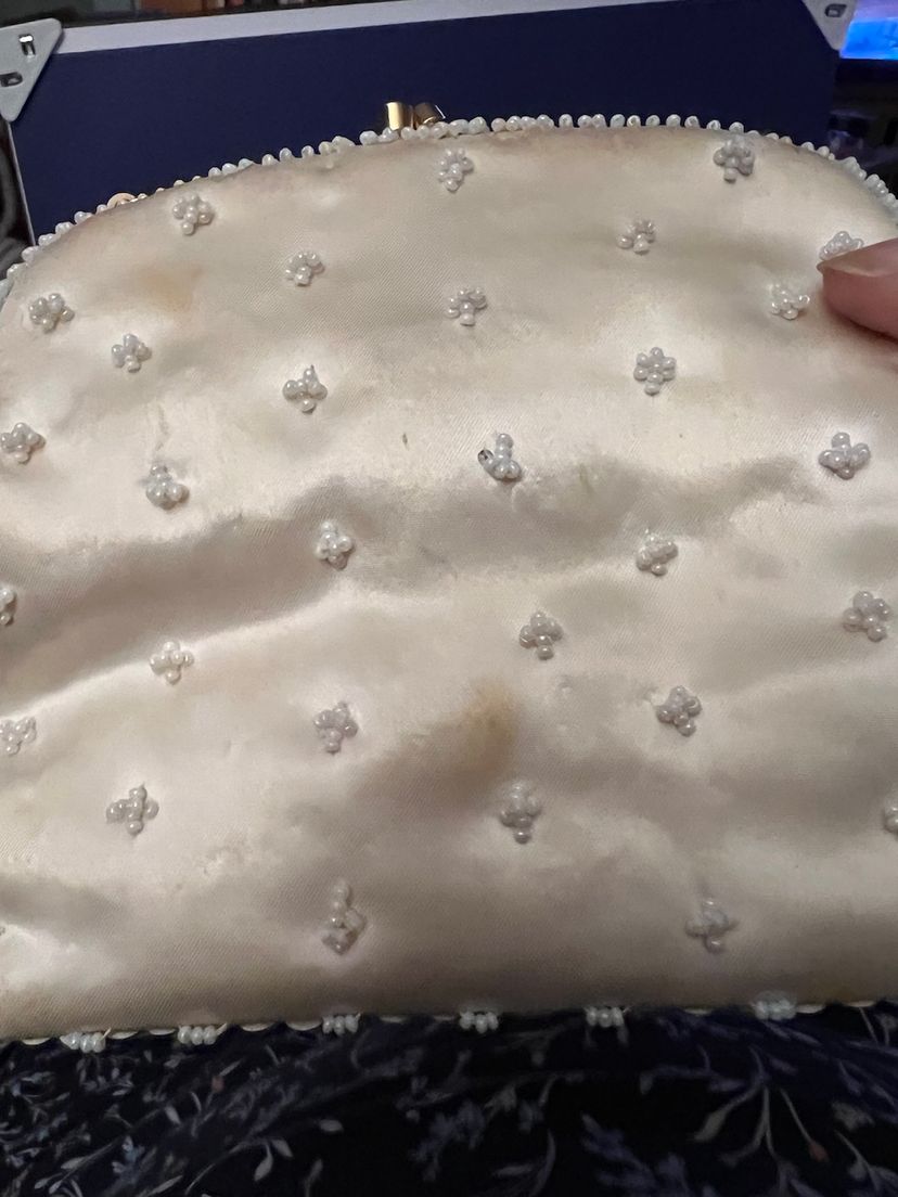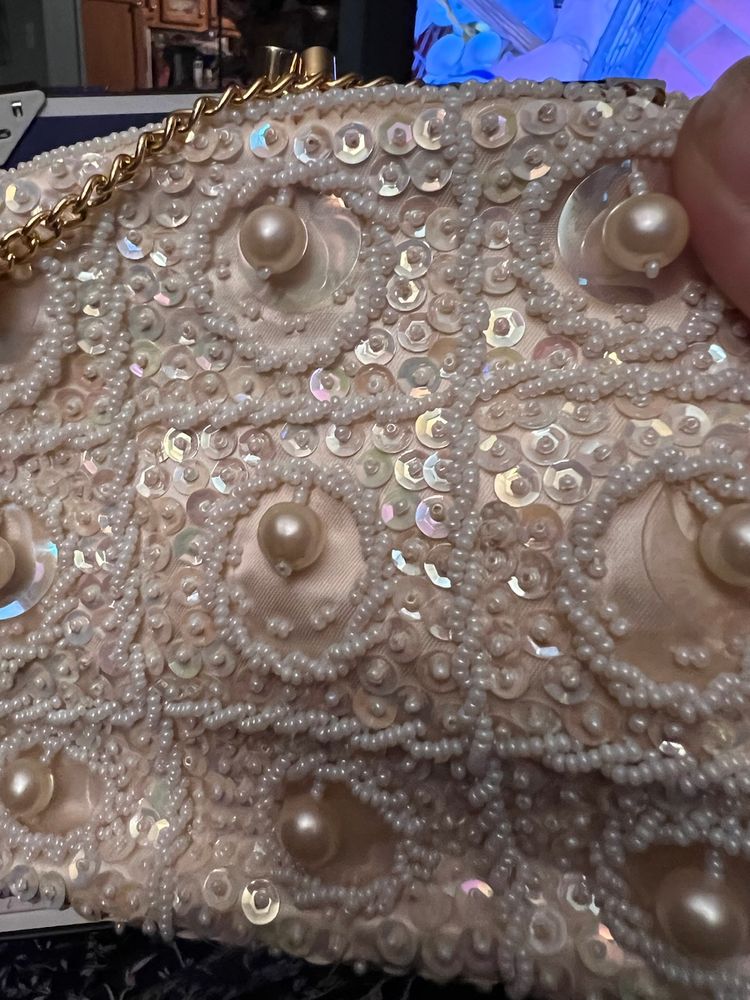 Elegant small Beaded and sequined purse with gold colored clasp and chain. Chain can be tucked inside. 6” x 5”