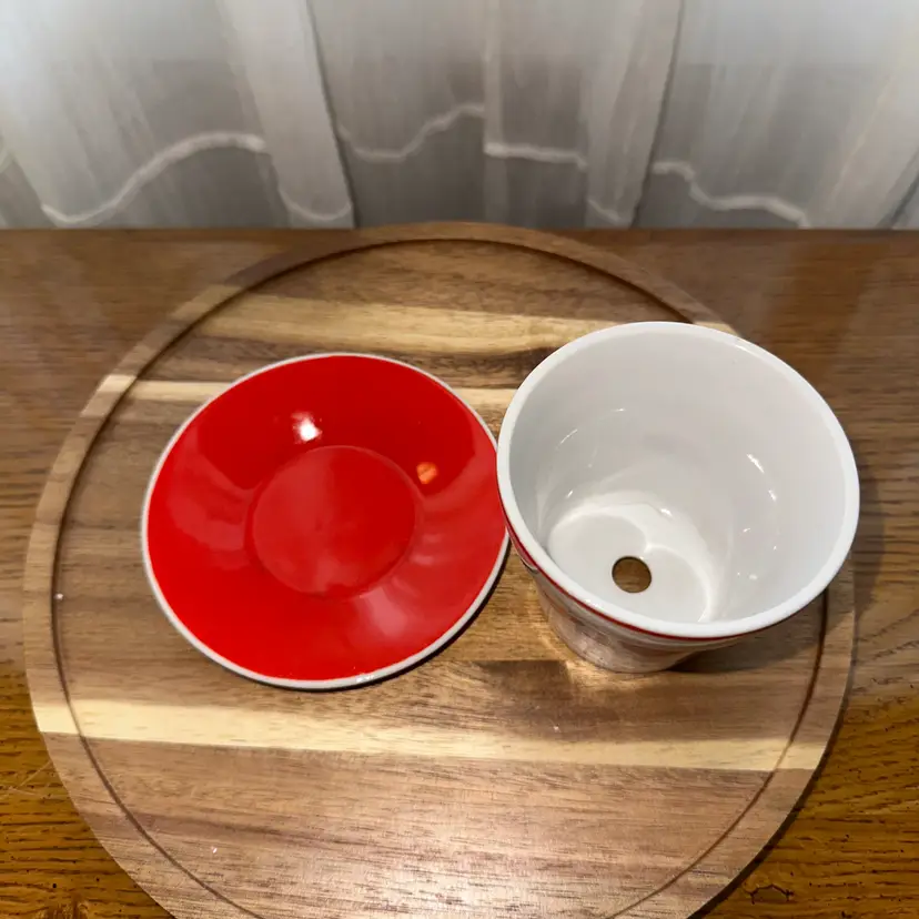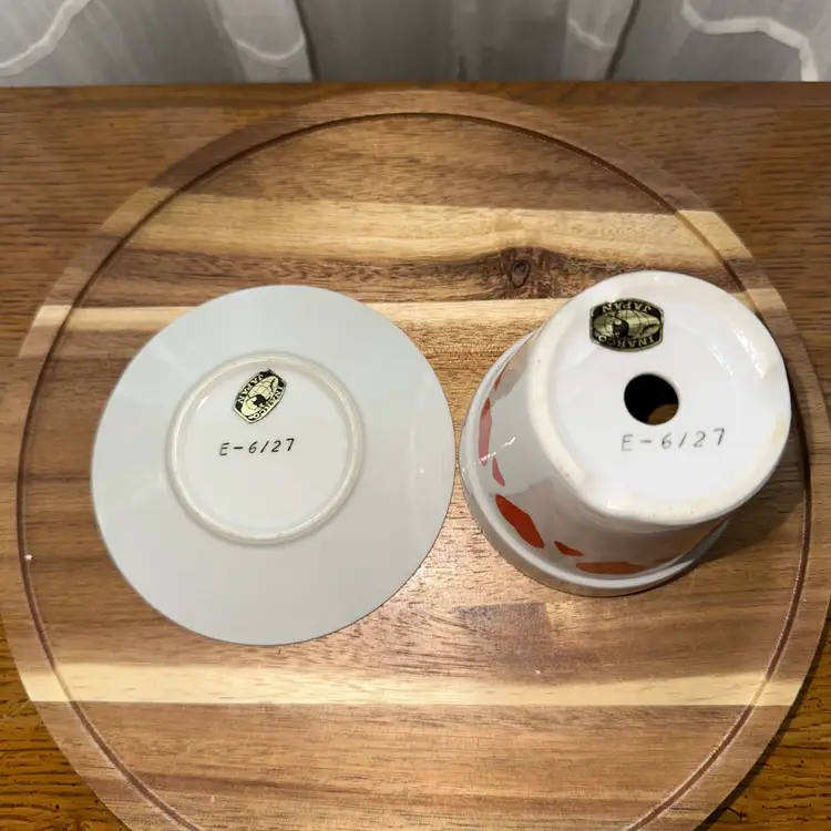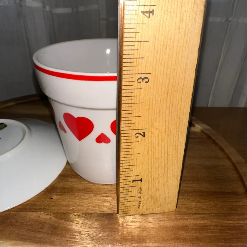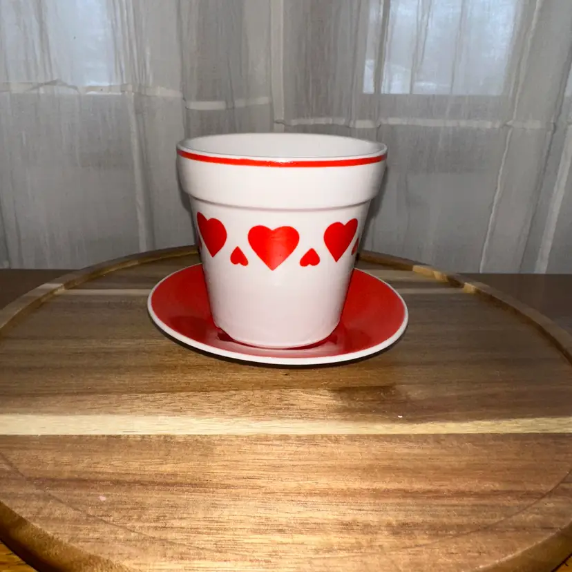 This item is a vintage Japan Inarco ceramic planter with a red heart design and a matching saucer.