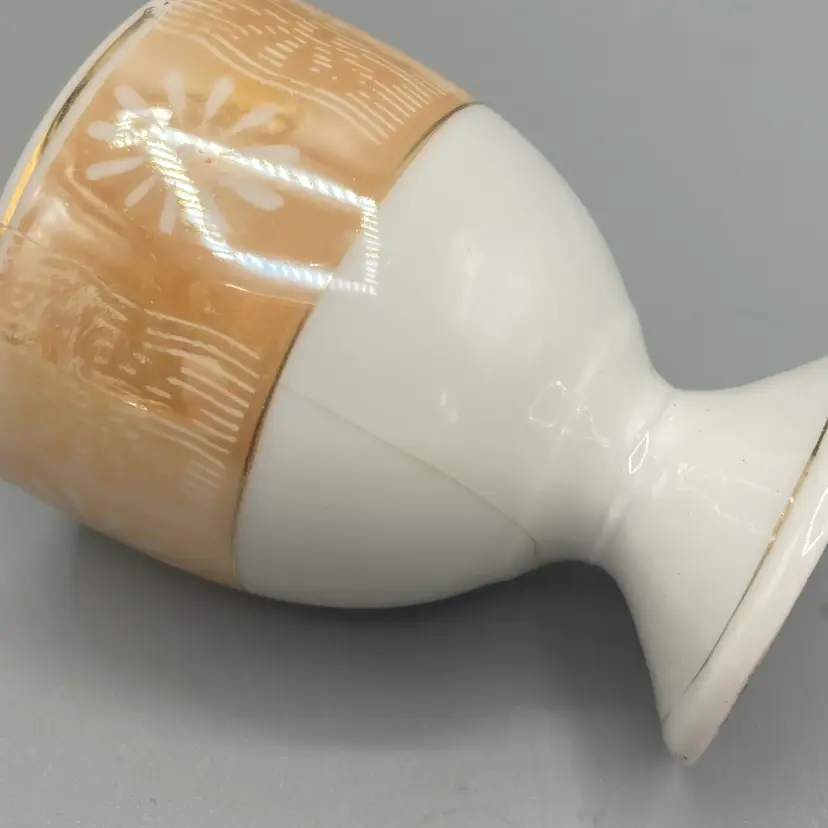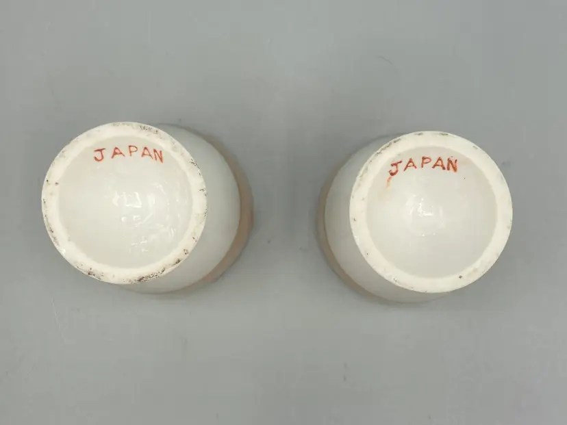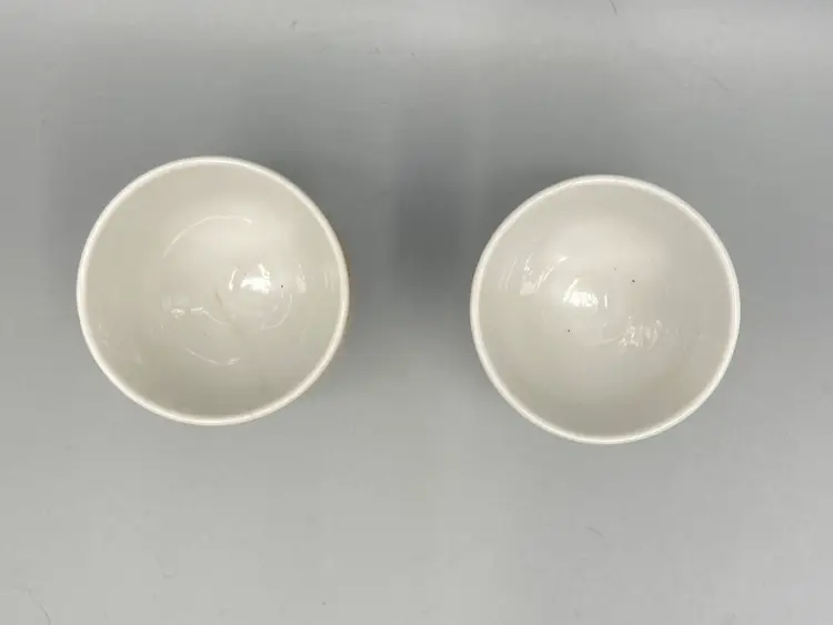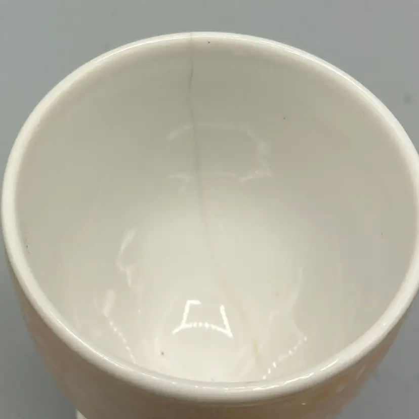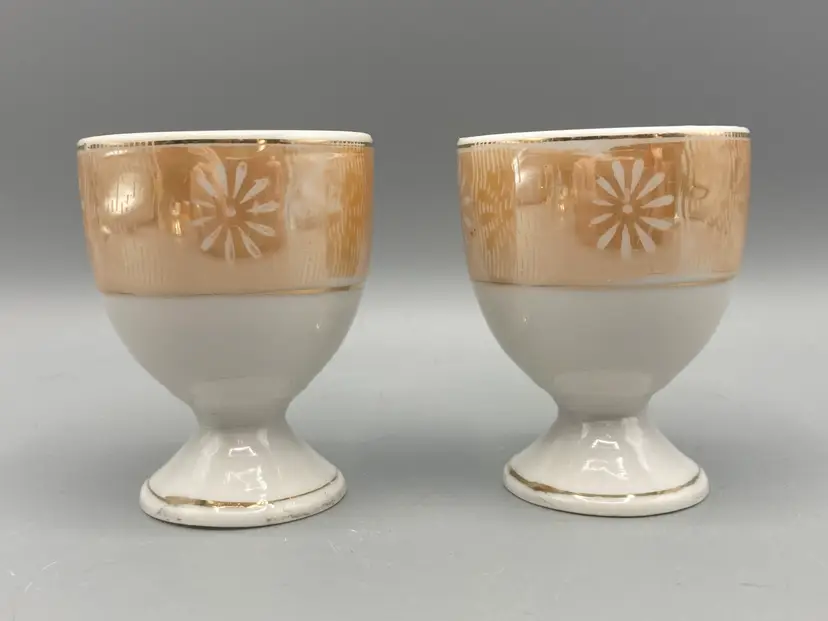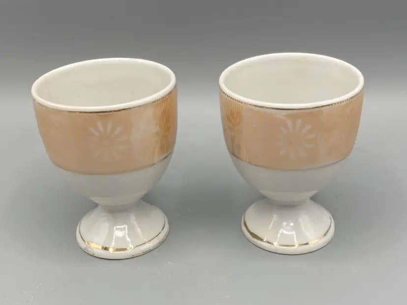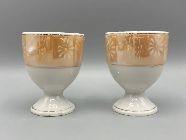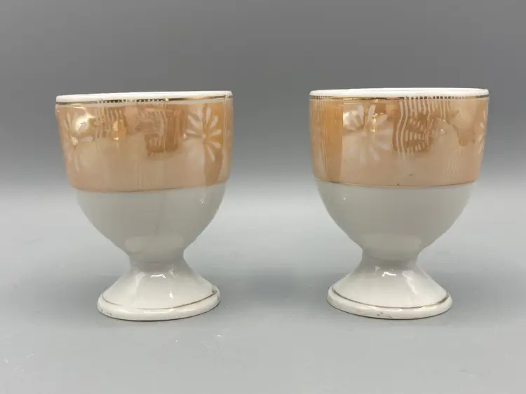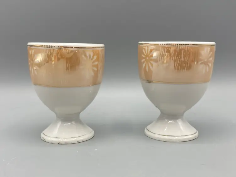 One egg cup is in good condition, the other one has a crack, please see last 2 pictures for details. They measure approximately 2 1/4" tall x 1 3/4" across the top x 1 1/4" across the base.