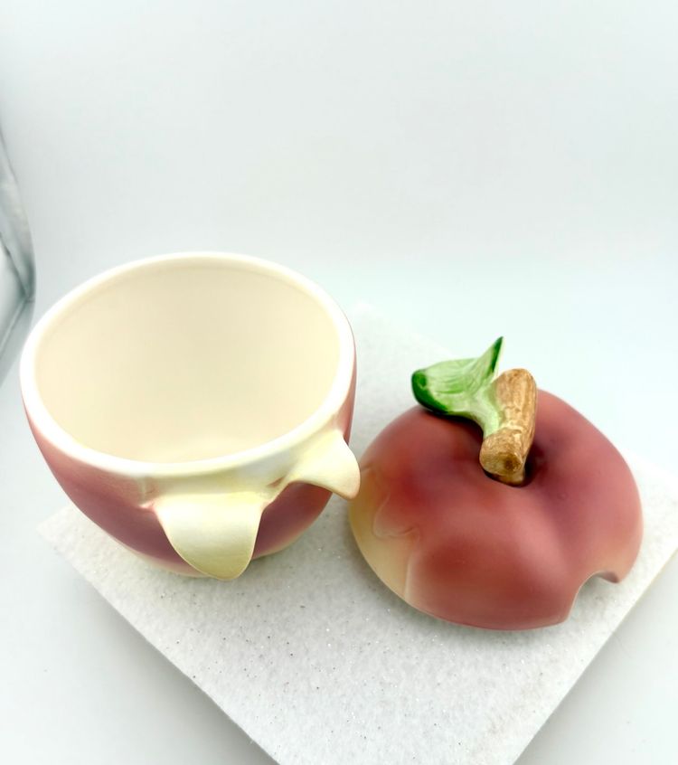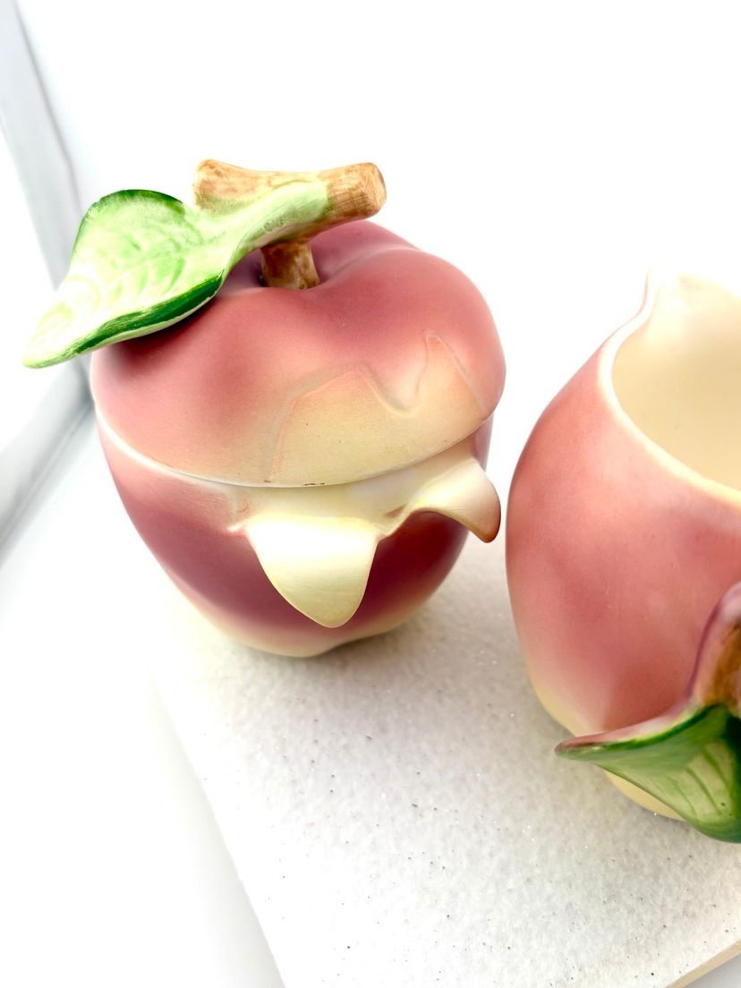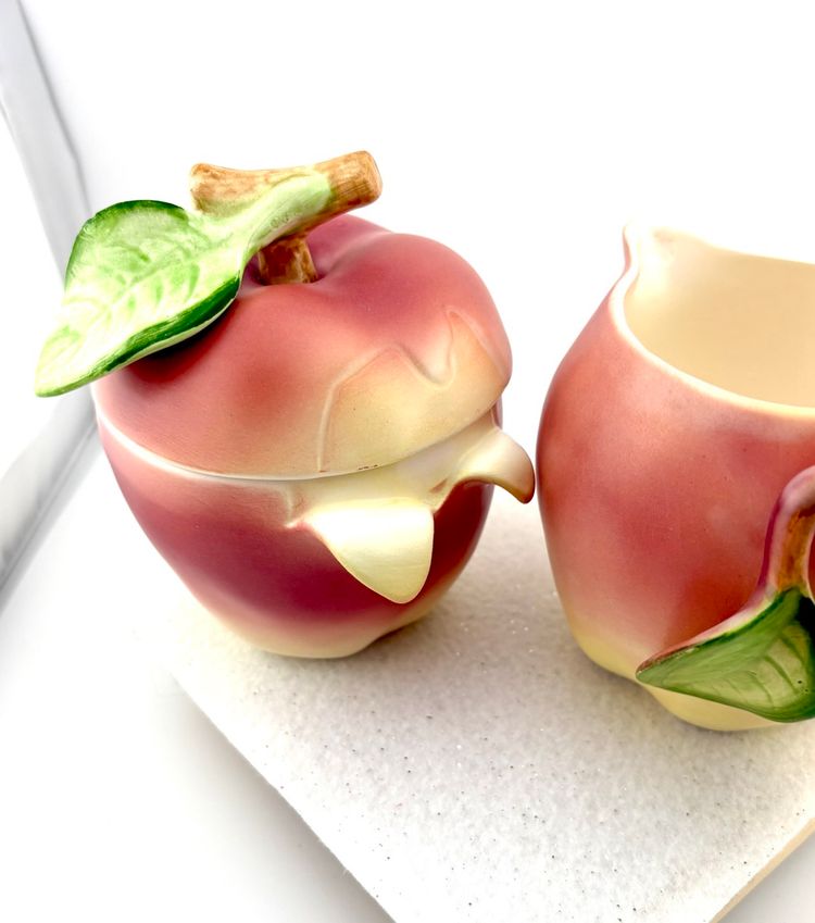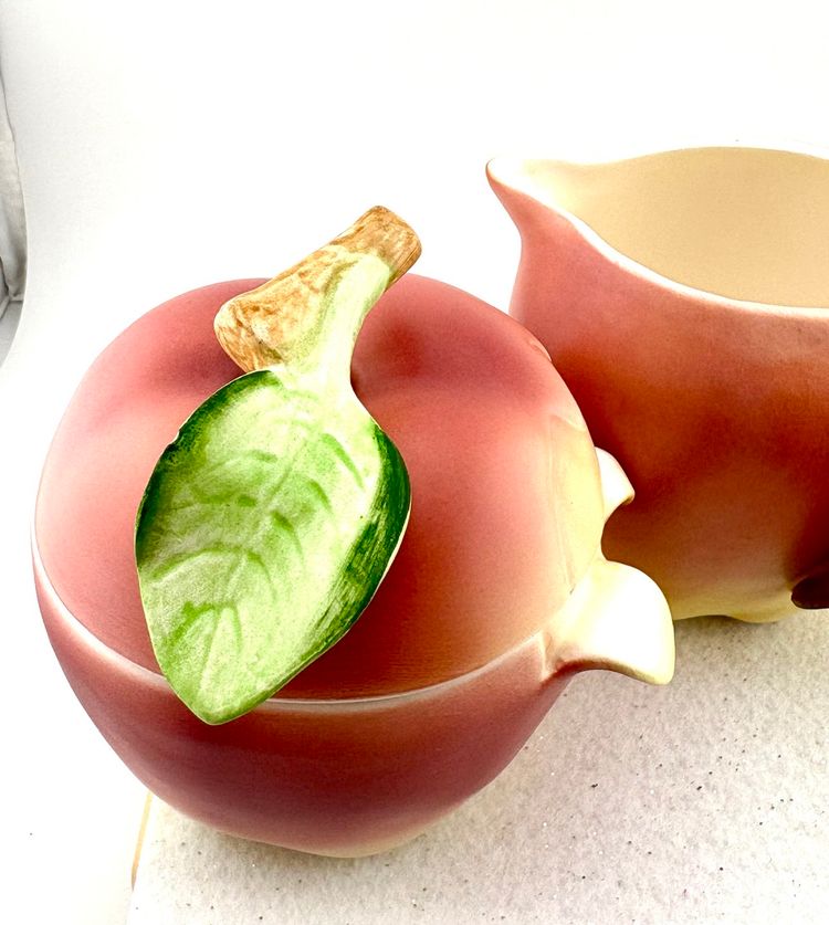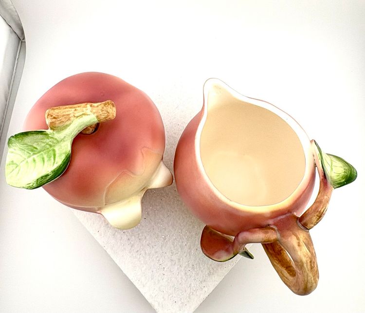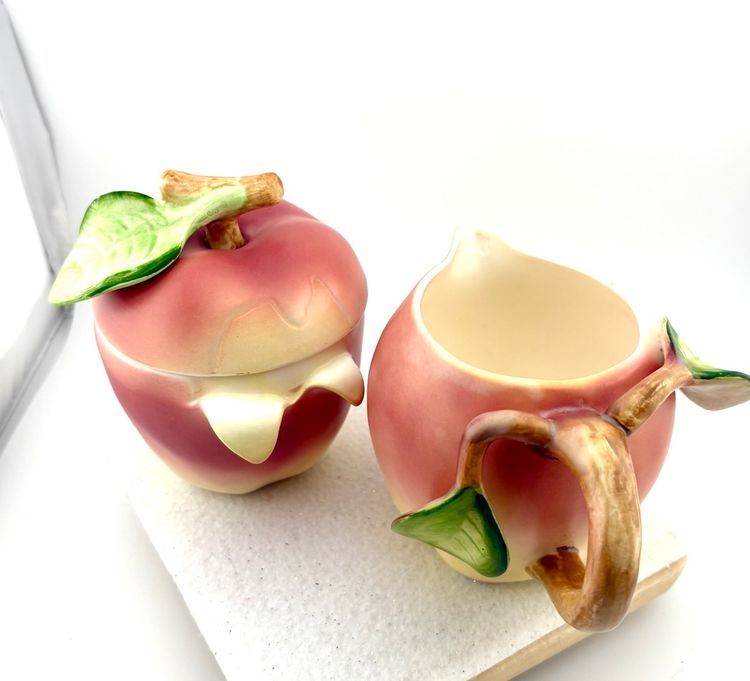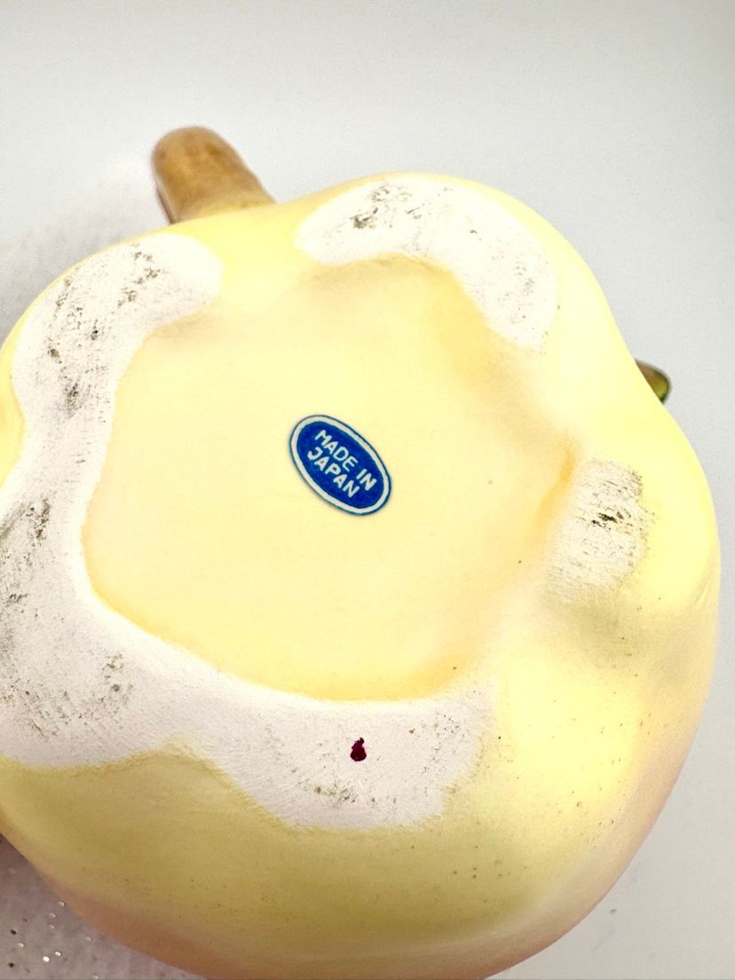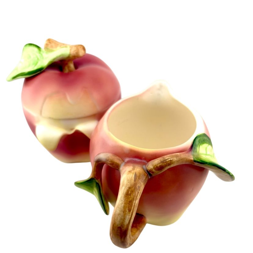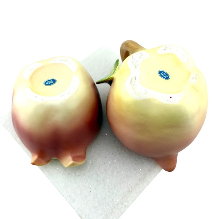 This set goes with the salt & pepper set in my store. The creamer measures 3.75” Tall x 5.5” wide. There are stickers on the bottom that say Japan but I do not know the maker. There is a flea bite on the leaf of the sugar lid. There are no chips or cracks.