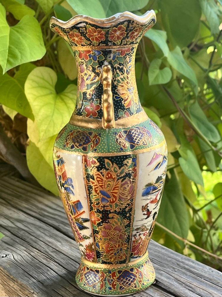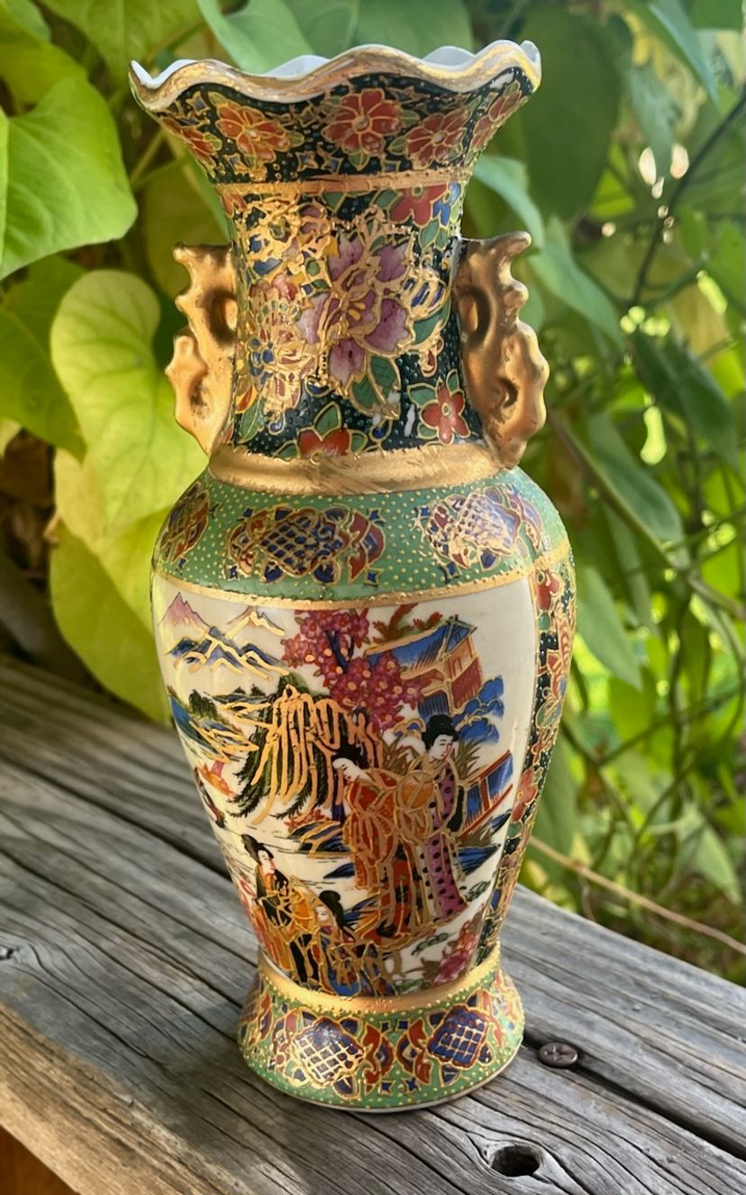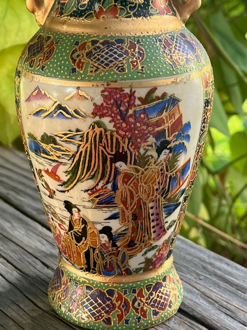 A vintage Japanese Geisha Vase. Approximately 8 inches tall and 3 inches at its widest. It appears to have never been used as a vase as the inside is without staining. The colors are bright. The rim has rubbing on the gold paint. There is one chip on the mouth on the side that doesn't show when displaying.