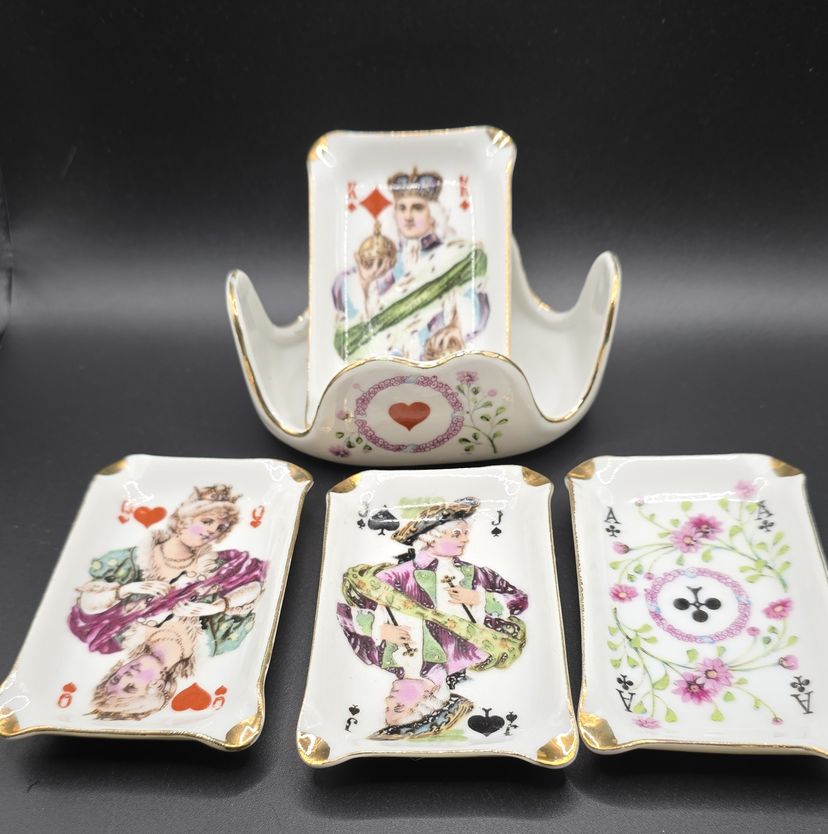 This whimsical porcelain trinket set is a delightful fusion of elegance and playfulness. Crafted in Japan, likely during the mid-20th century, the set features four rectangular dishes stacked inside a scalloped holder, each adorned with vibrant playing card illustrations. The top dish showcases a mirrored Queen of Hearts in regal Victorian attire, while the holder displays a red diamond emblem framed by delicate floral detailing.
