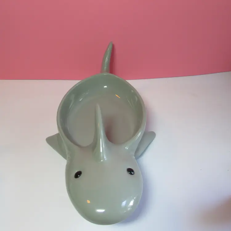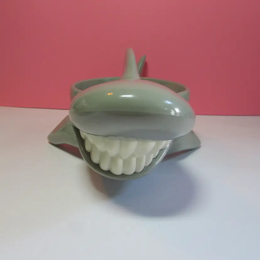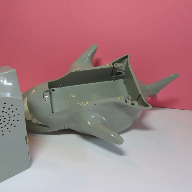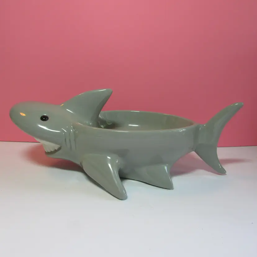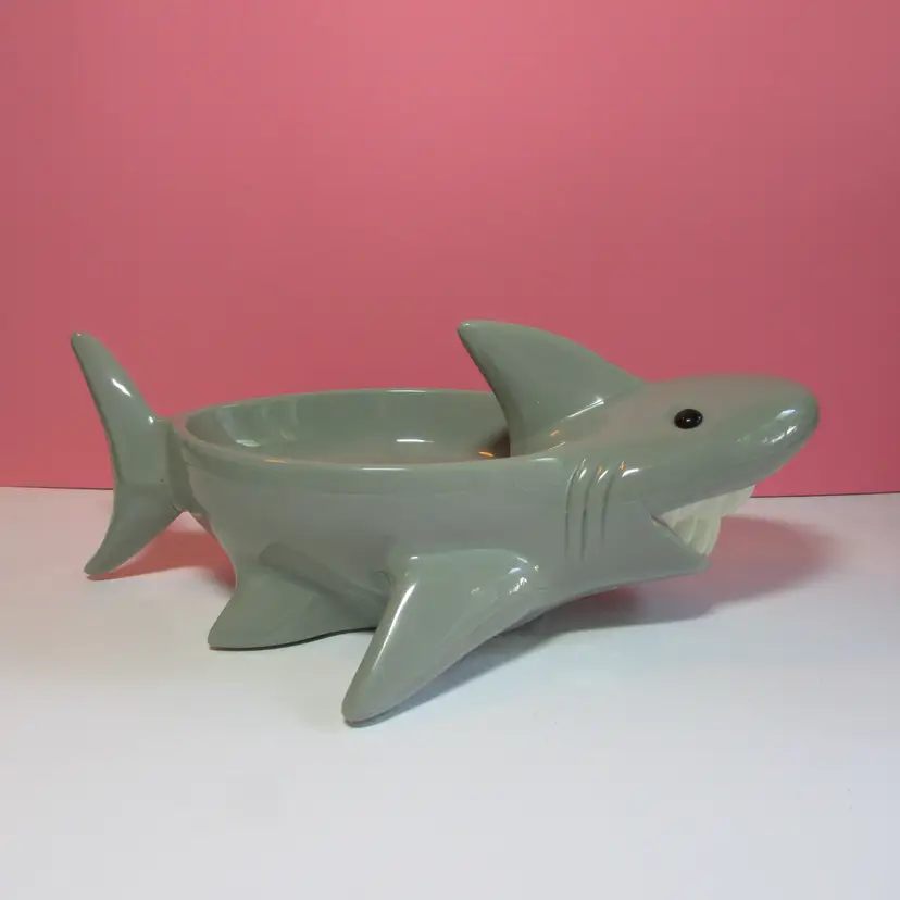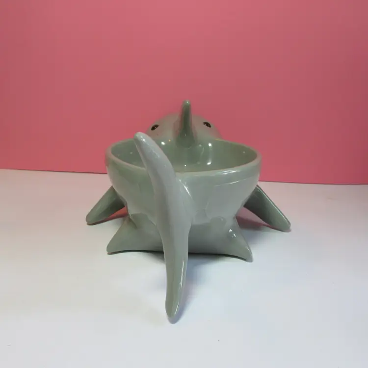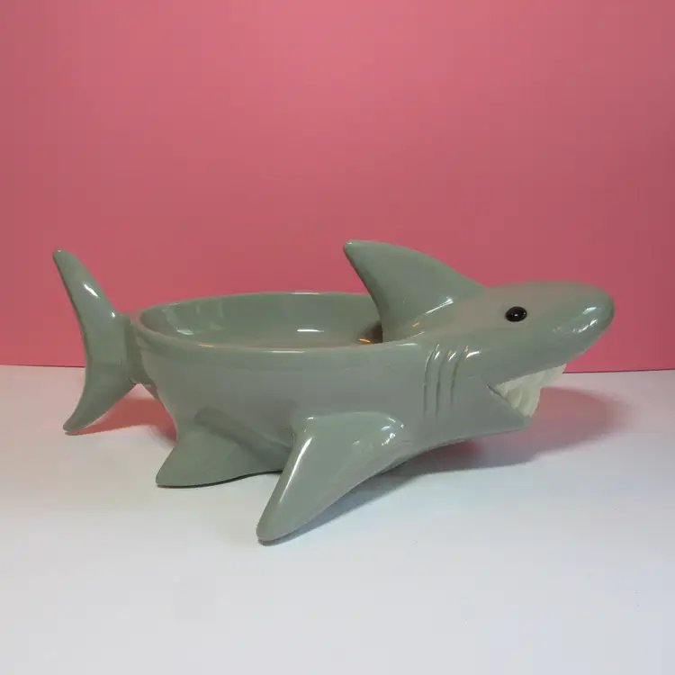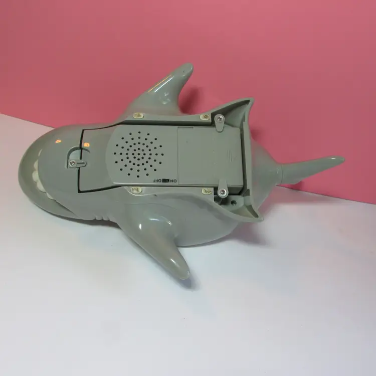 This fun bowl is fun to use, it plays the jaws sound when you put your hand in the bowl. It has been tested and works, you will need 4 AA batteries for the sound. The sound box comes out for easy cleaning. It is about 6" x 13" x 9". This is shipped from a smoke free home. Thanks for looking!