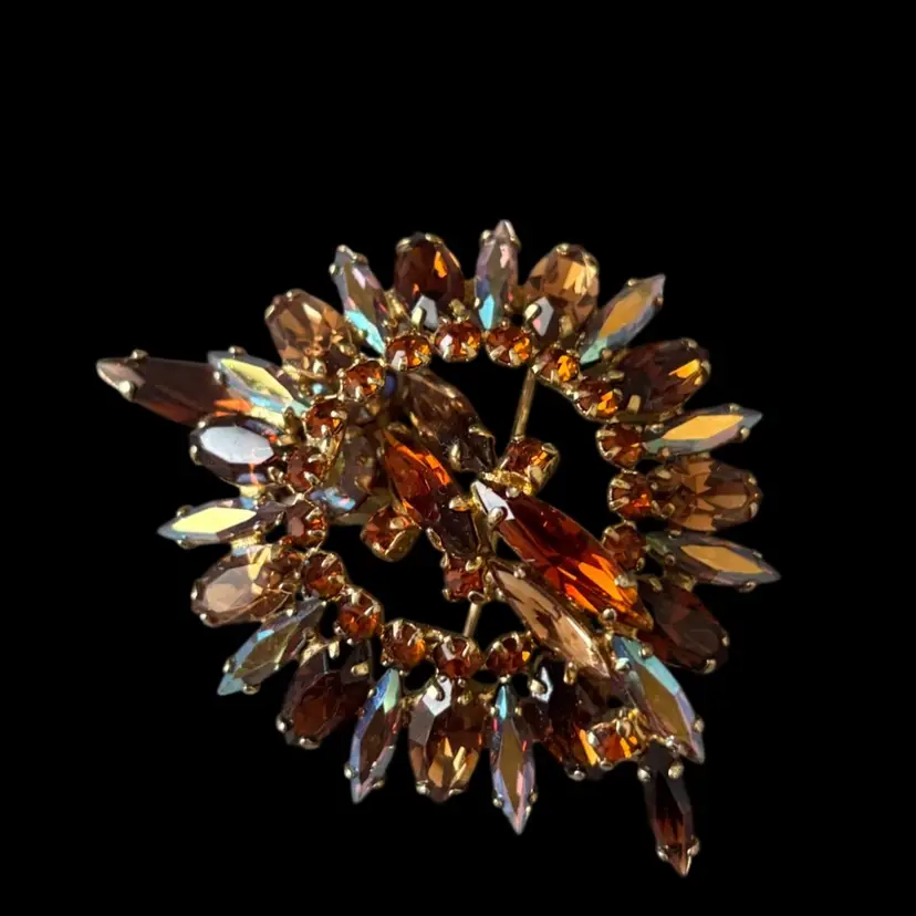 Gorgeous vintage brooch and earring set. Gold tone with amber and AB rhinestones. In great condition. Earrings: 1.5” Brooch: 2.25”