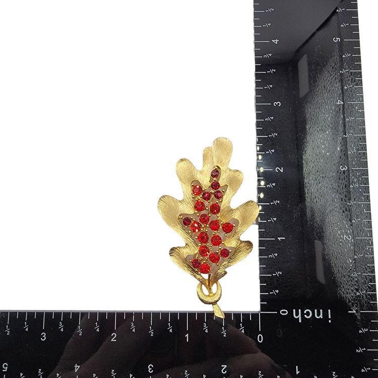 This vintage brooch features a detailed oak leaf design adorned with vibrant red rhinestones. A charming piece to add elegance to your collection.