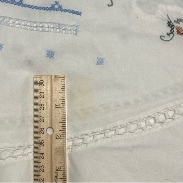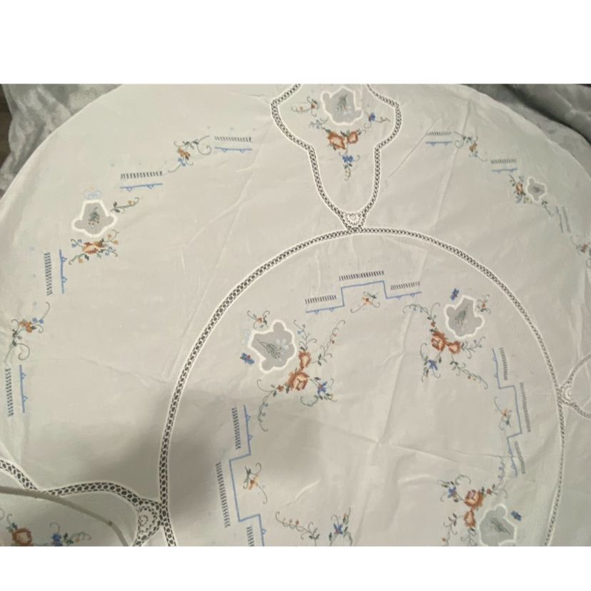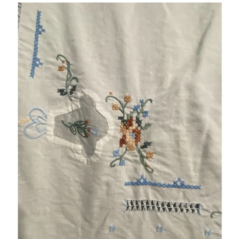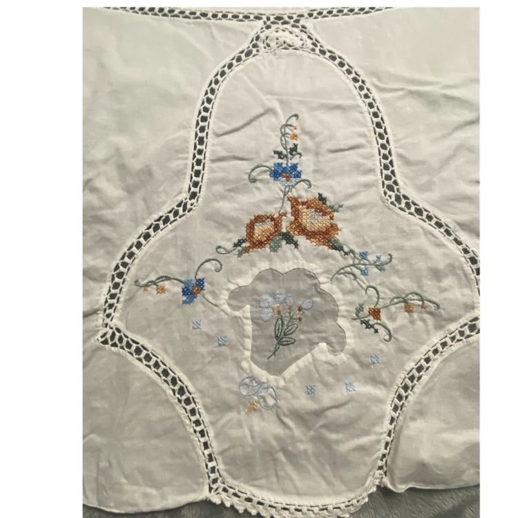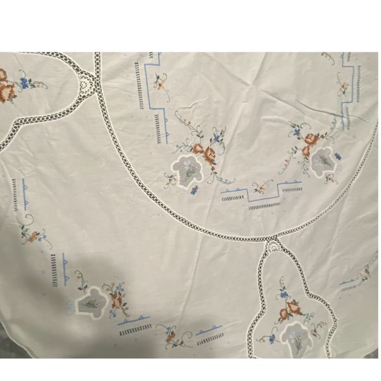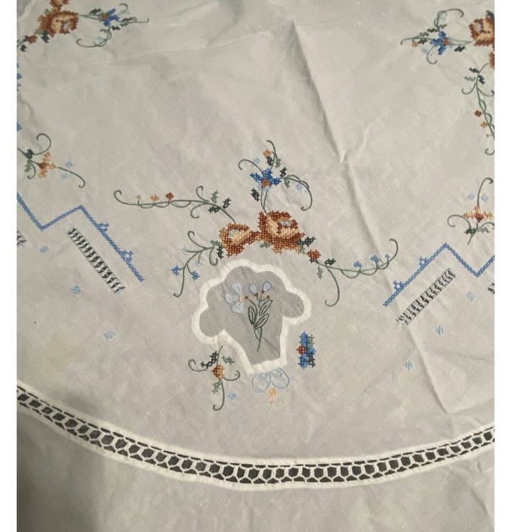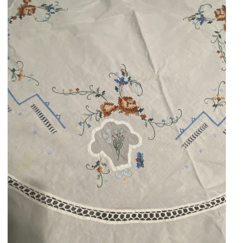 This is a great tablecloth that’s been hand-stitched with embroidery, cross-stitching, and crochet. Made of cotton, and in fantastic condition. There is one small spot that looks stained, but could be treated and laundered. See all photos for details.