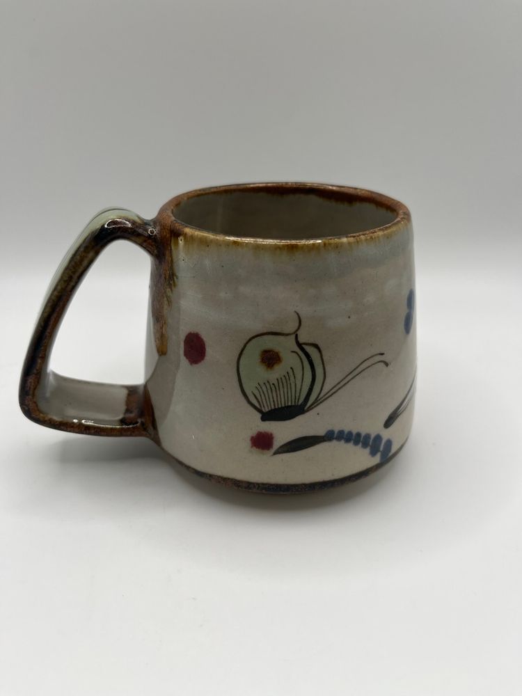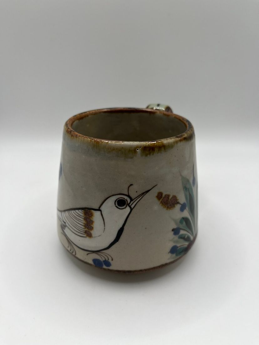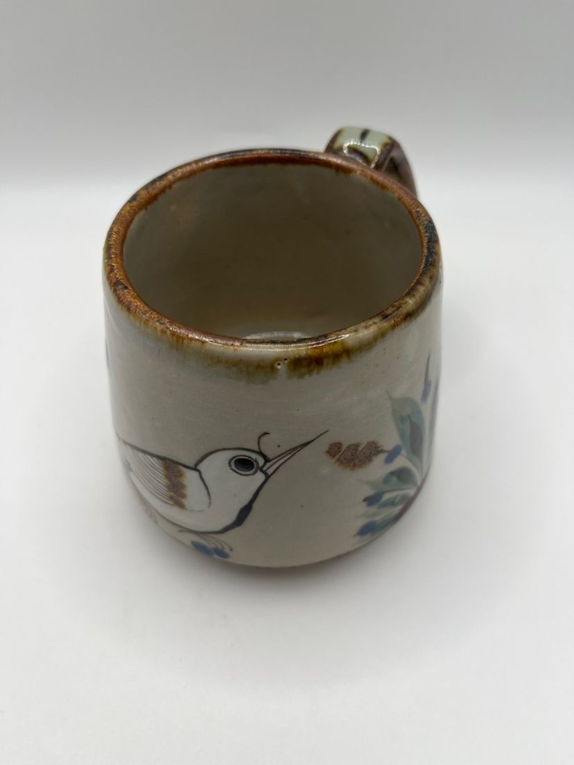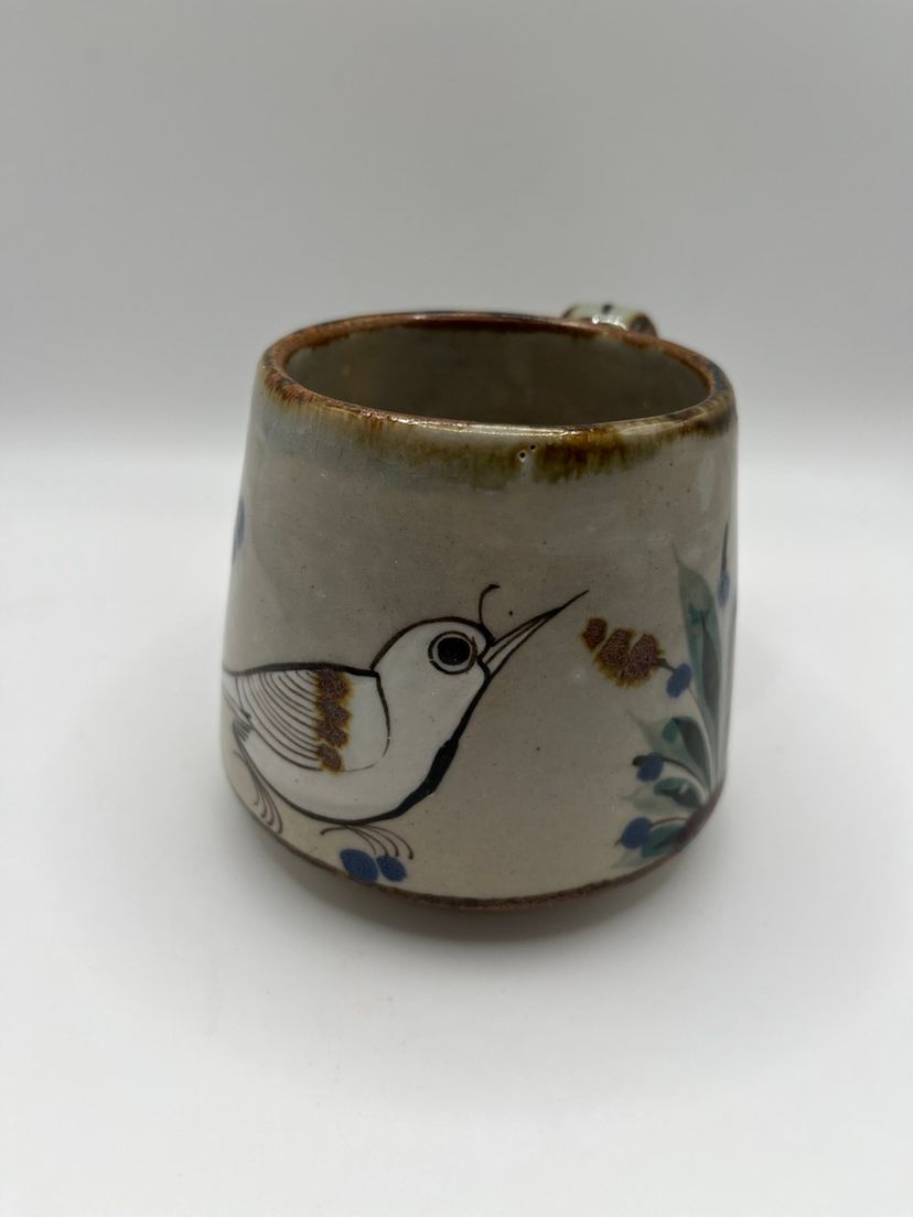 This is a beautiful Ken Edwards signed pottery mug. The hand painted design features a bird, a butterfly, and botanical design.