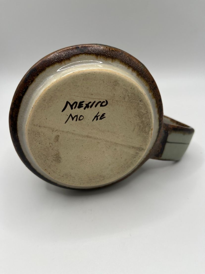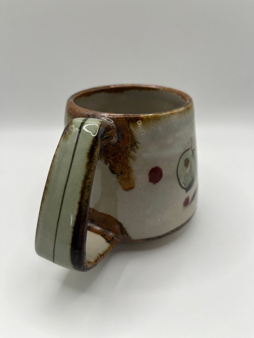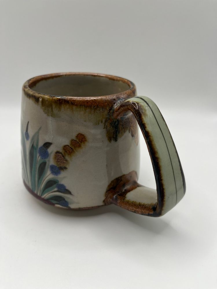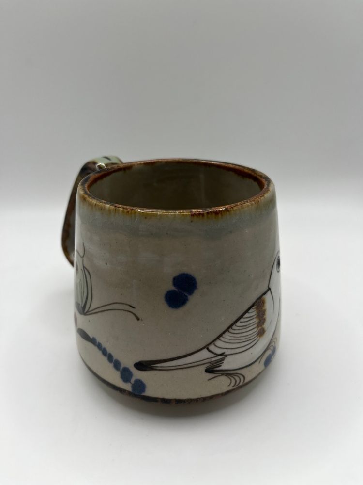 This is a beautiful Ken Edwards signed pottery mug. The hand painted design features a bird, a butterfly, and botanical design.