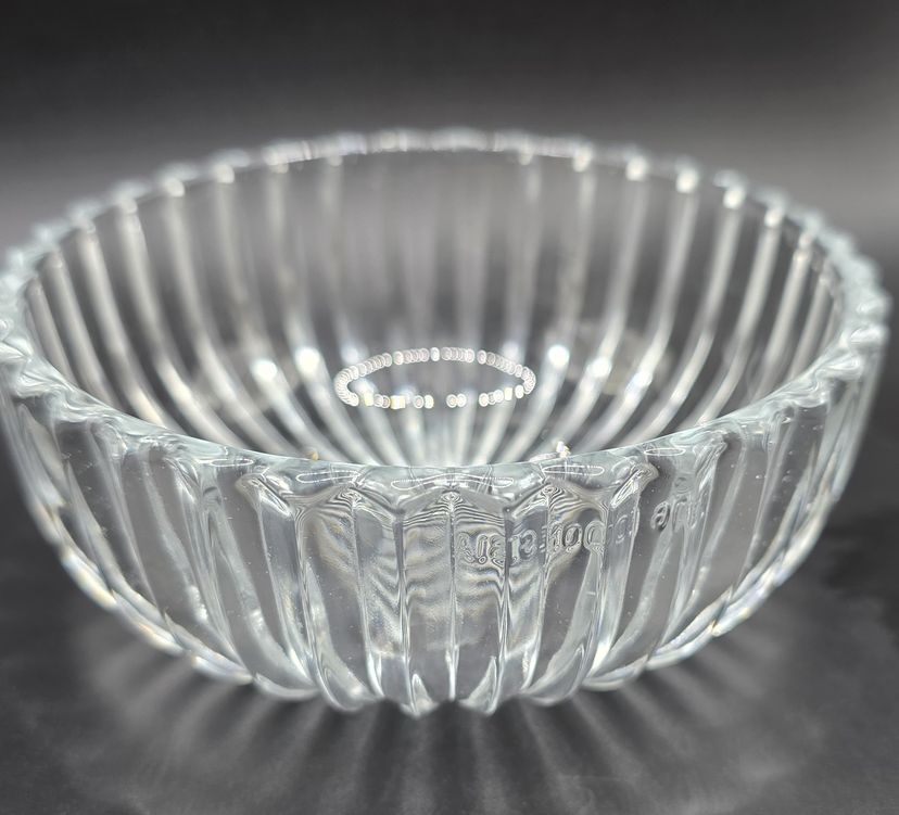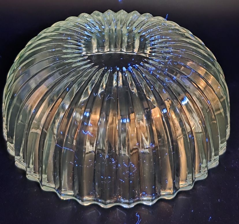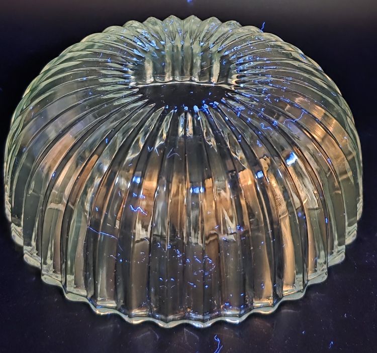 What sets this piece apart is its manganese content—an additive used in glassmaking that causes the bowl to fluoresce under UV light. This subtle scientific trait adds collector appeal, especially among enthusiasts of uranium and manganese glassware. The manganese also contributes to the faint greenish tint visible in natural light.
