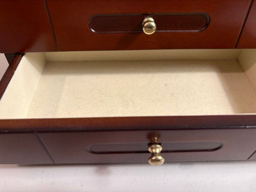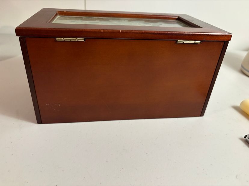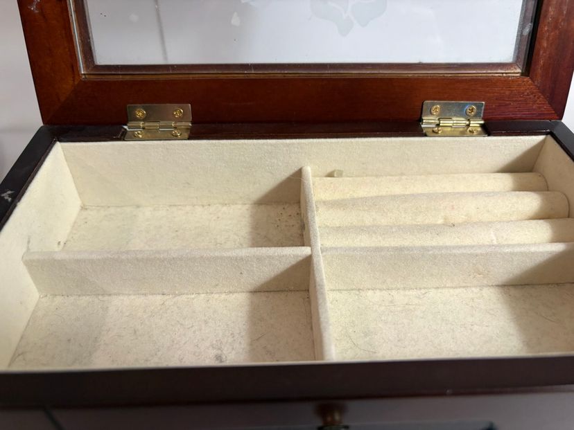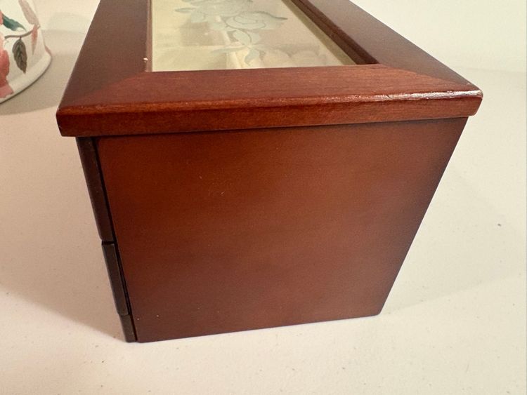 It is a joy to unwind everyday by lifting this rose etched lid of the beautiful walnut jewelry box to set your most precious assets on the delicate ivory lining. This ritual can be yours with this piece, not only to organize, but to protect your beauty treasures. This is also a wonderful gift to a lucky person in your life that requires not only a bit of order, but deserves a touch of posh.