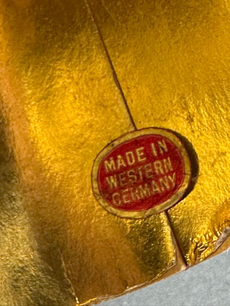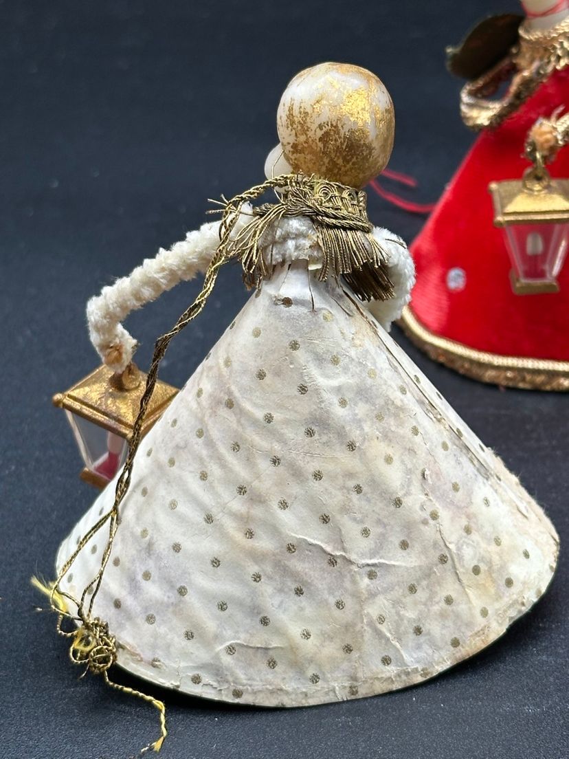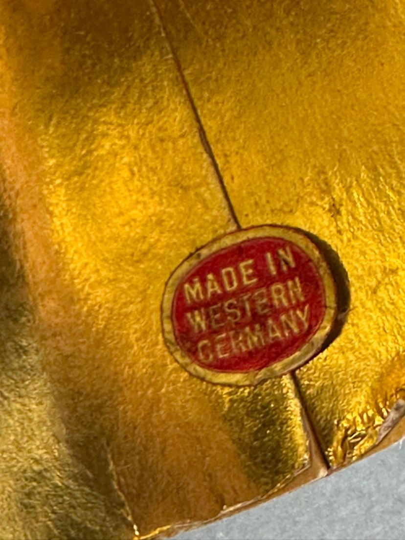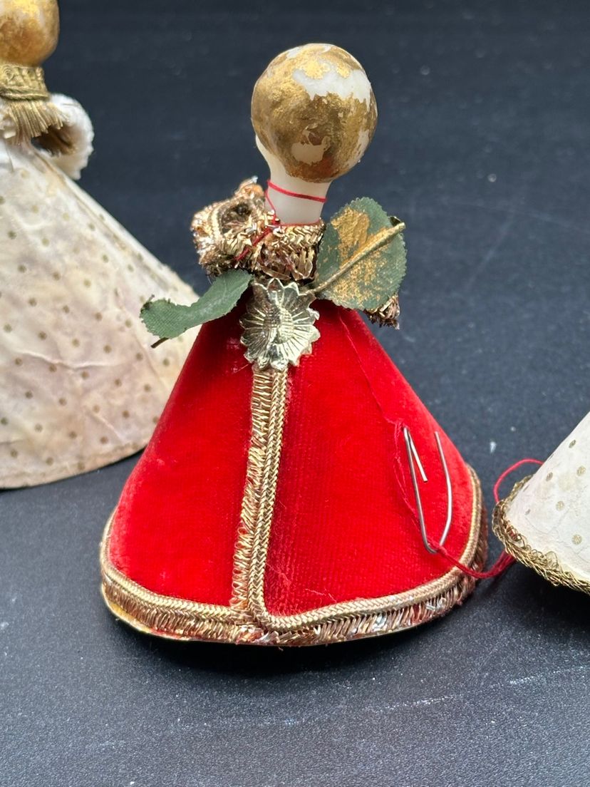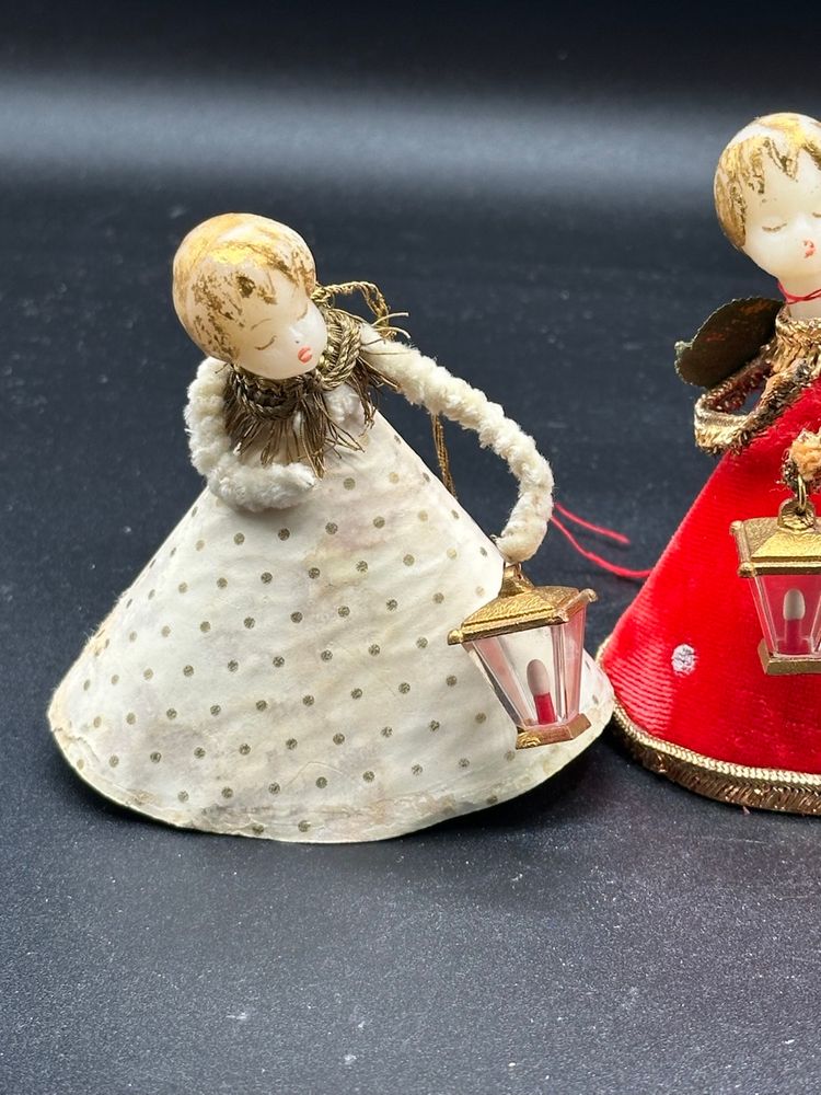 The Vintage WEST GERMANY Koestel Wax Head Gold Angel Christmas Ornament Figurine is a small, handmade figurine from the mid 20th century. Made of wax, foil, fabric, cord, and cardboard, this Renaissance-style ornament features an angel character and is signed by the brand Koestel. The gold color and all-over pattern make it a unique and collectible piece for Christmas tree ornaments, showcasing traditional German craftsmanship.