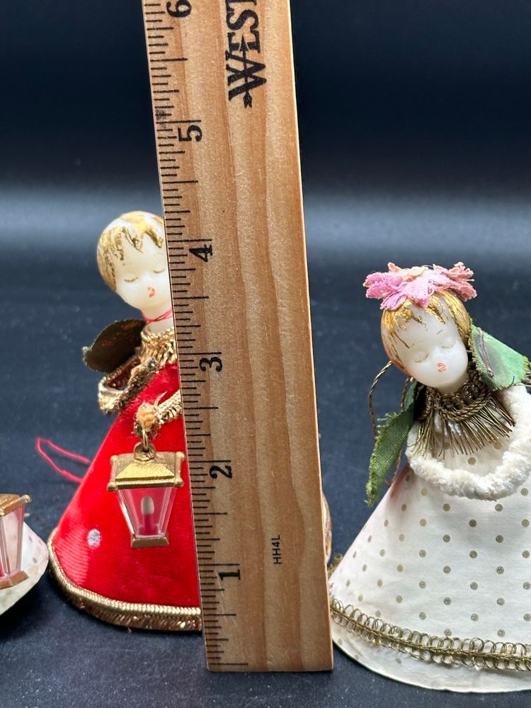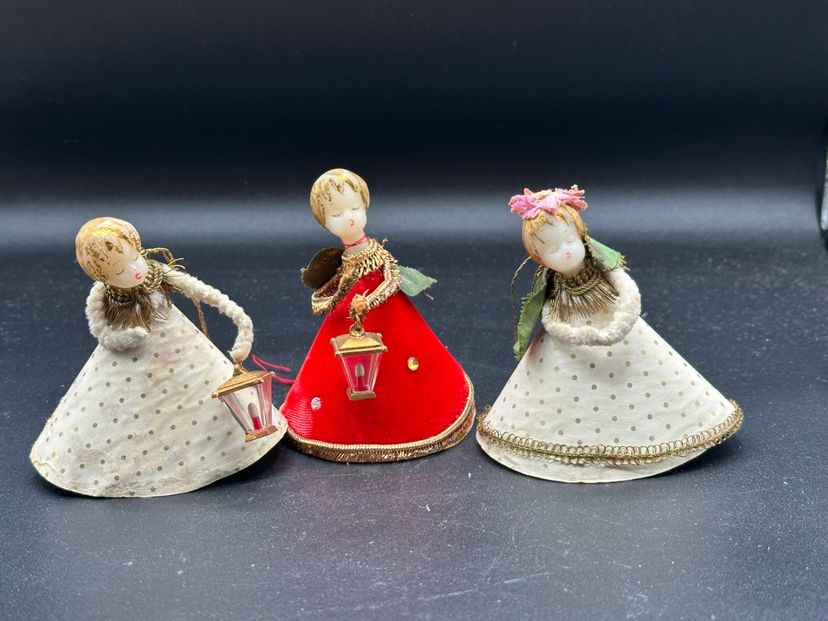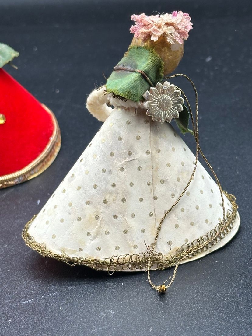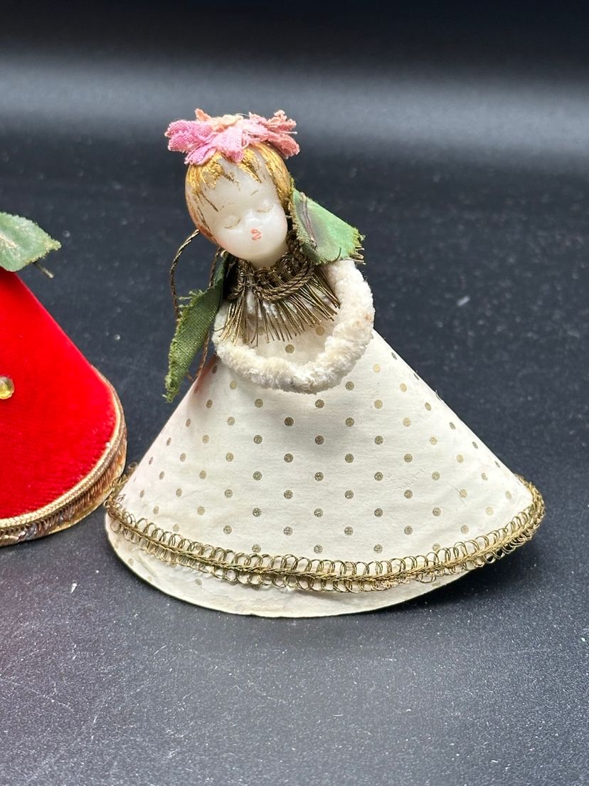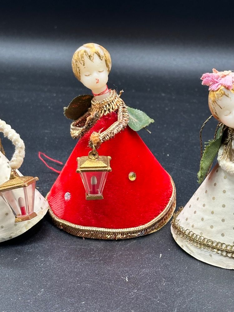 The Vintage WEST GERMANY Koestel Wax Head Gold Angel Christmas Ornament Figurine is a small, handmade figurine from the mid 20th century. Made of wax, foil, fabric, cord, and cardboard, this Renaissance-style ornament features an angel character and is signed by the brand Koestel. The gold color and all-over pattern make it a unique and collectible piece for Christmas tree ornaments, showcasing traditional German craftsmanship.