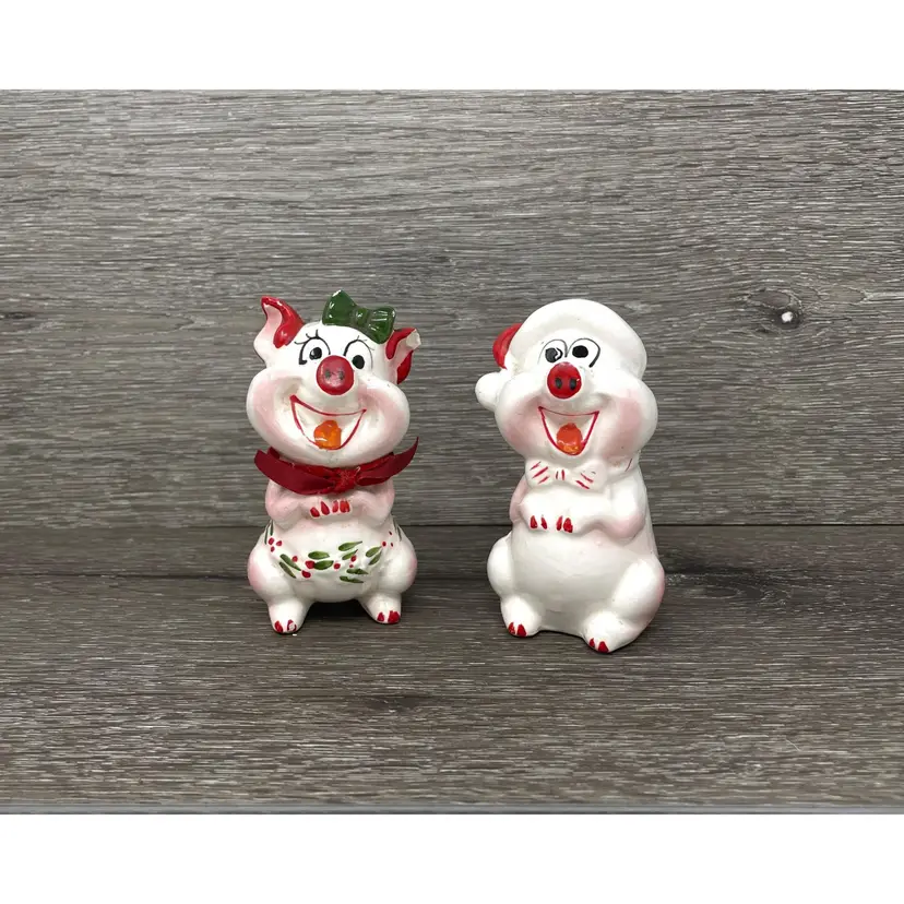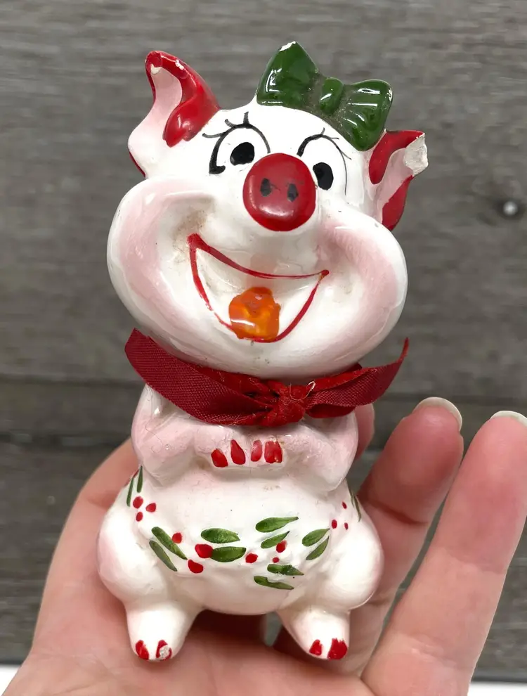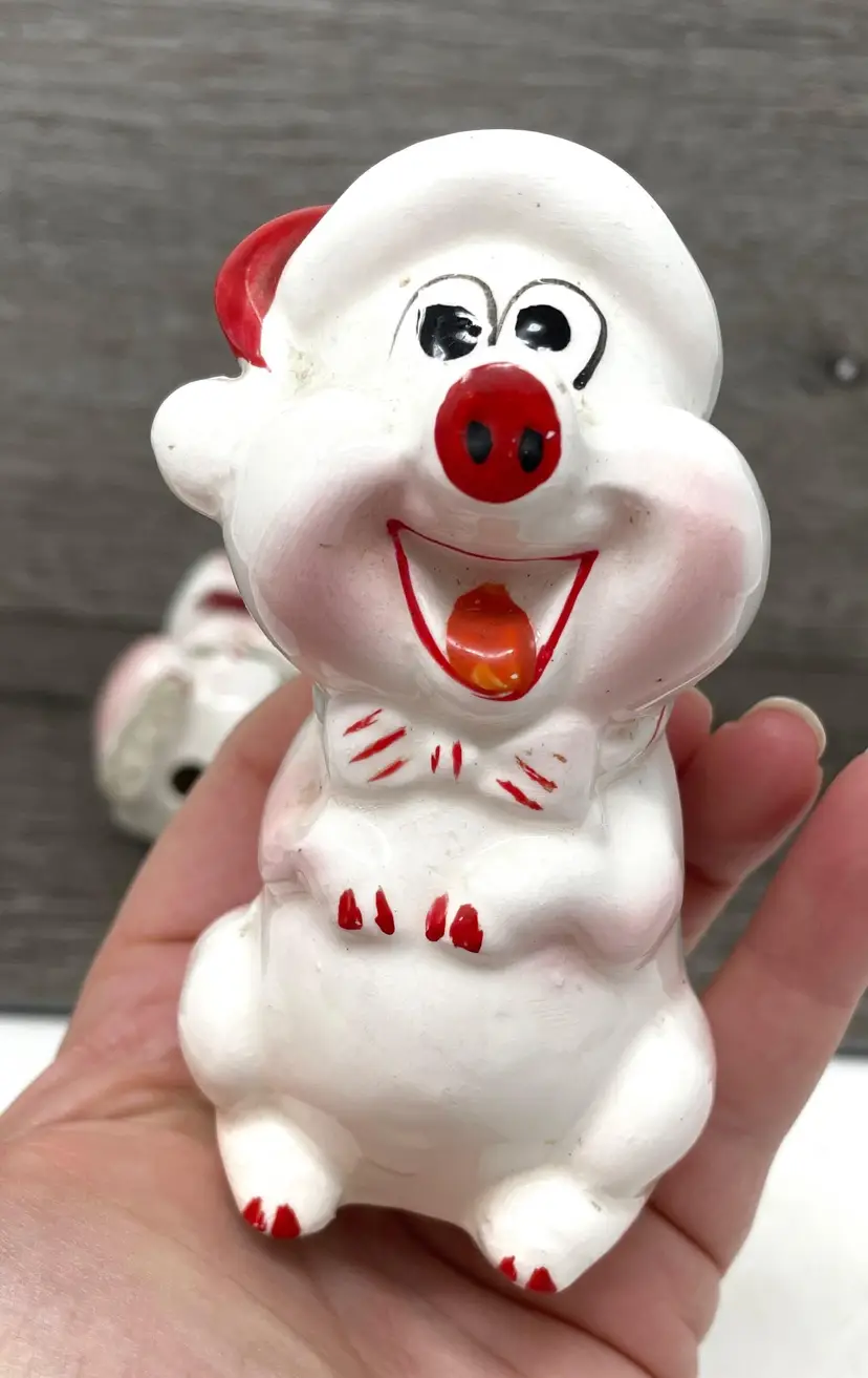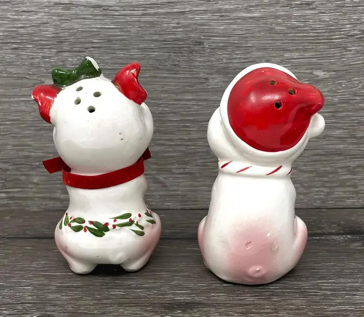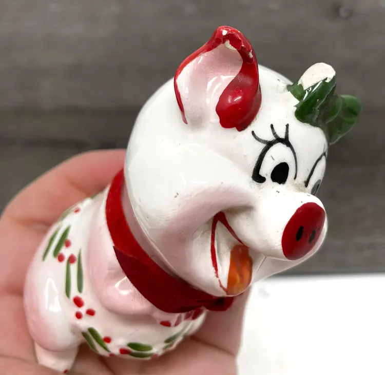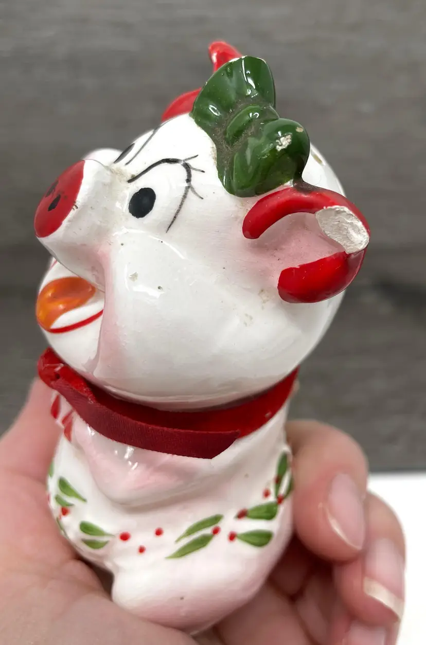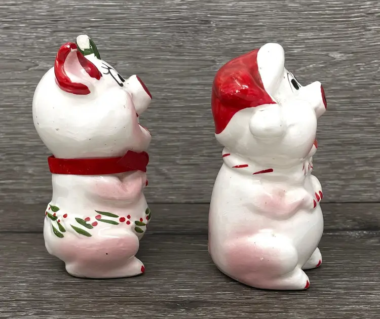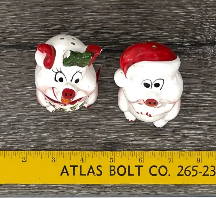 A pair of vintage Kreiss ceramic Christmas pig shakers. I just love the crazy Kreiss items! These 2 are all decked out for the holidays, with their holly adornments! The lady pig has a green bow on the top of her head and the guy is wearing a Santa hat. Their facial expressions are priceless!