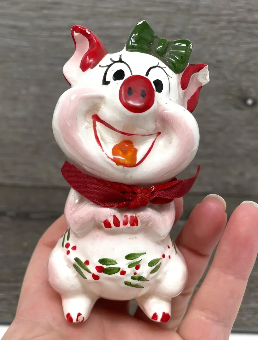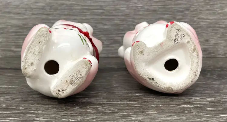 The guy piggy is in excellent condition, with no noted issues. He has 2 spots on his low back that are manufacturing flaws. The lady seems to have taken a tumble at some point in her life. She has a chipped ear tip on one side, part of which has been painted over. Her other ear has a bigger chip, that hasn't been touched up. She also has a chip missing from one side of her green bow. The other side of her bow has a spot that looks more like a manufacturing flaw than actual damage. Please refer to all photos prior to purchase.