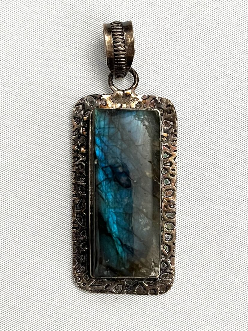 A gorgeous vintage Labradorite silver plated pendant. Approximately 2 inches long and 5/8 inches wide. Uncleaned for your preference. For Protection and Healing. At $28 I will include a sterling silver necklace.