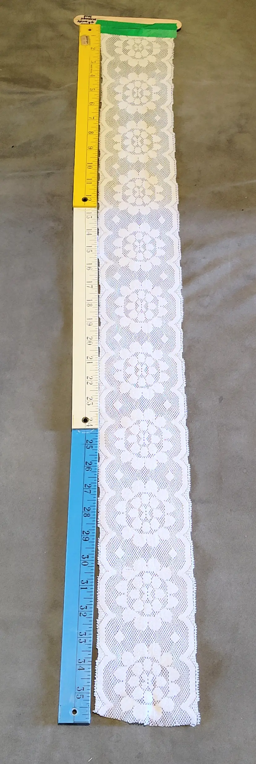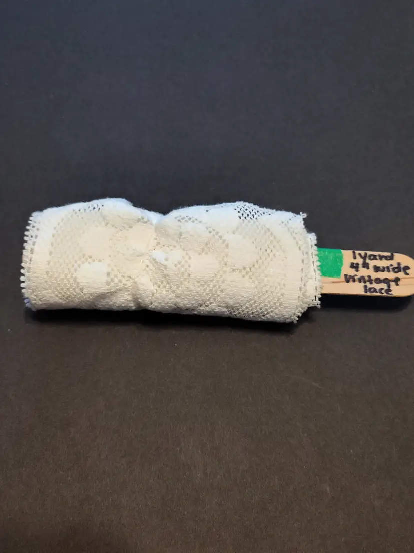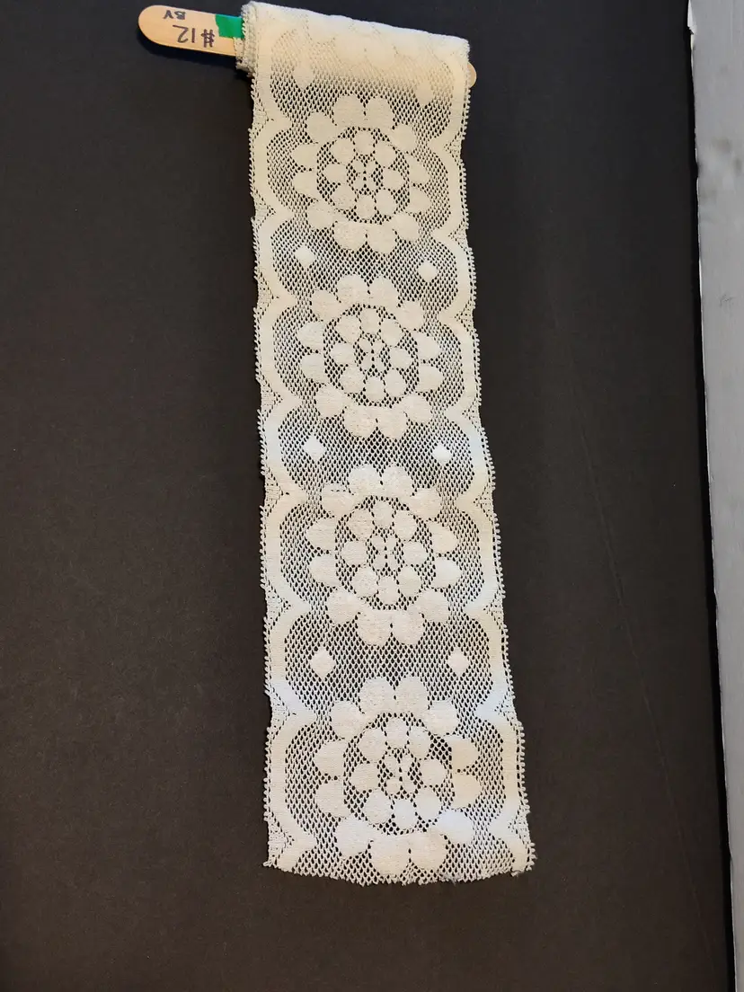 Lace is 4" wide. Will come wrapped on a wooden tongue depresser.