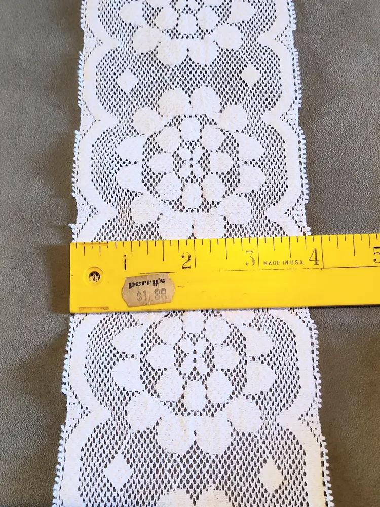 1 yard of uncut vintage lace. Color is (vintage) white-not stark white. I lightened 2 pictures to show detail.