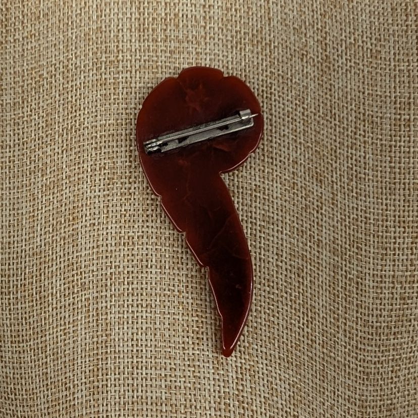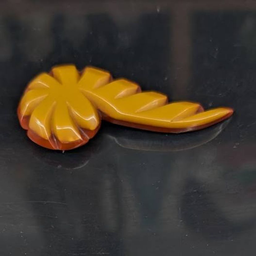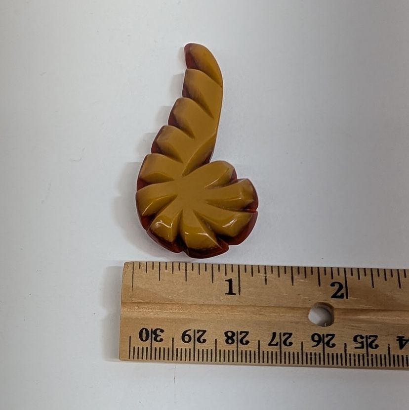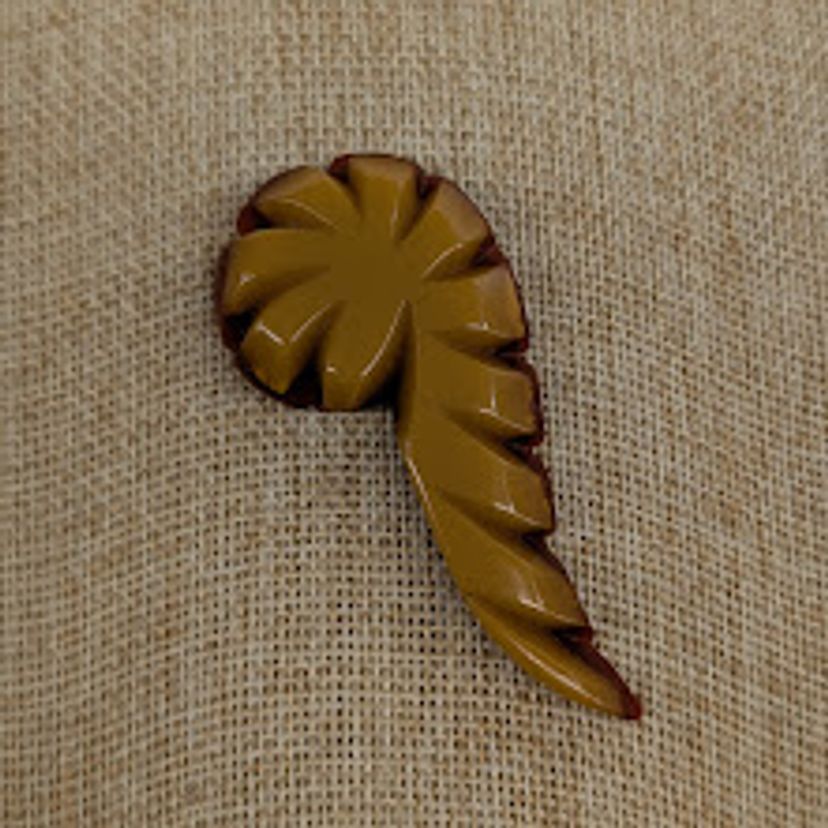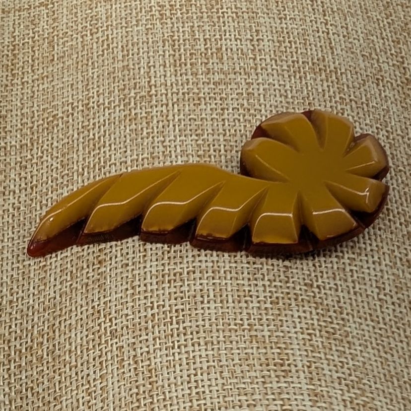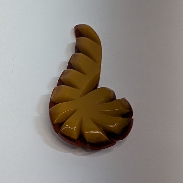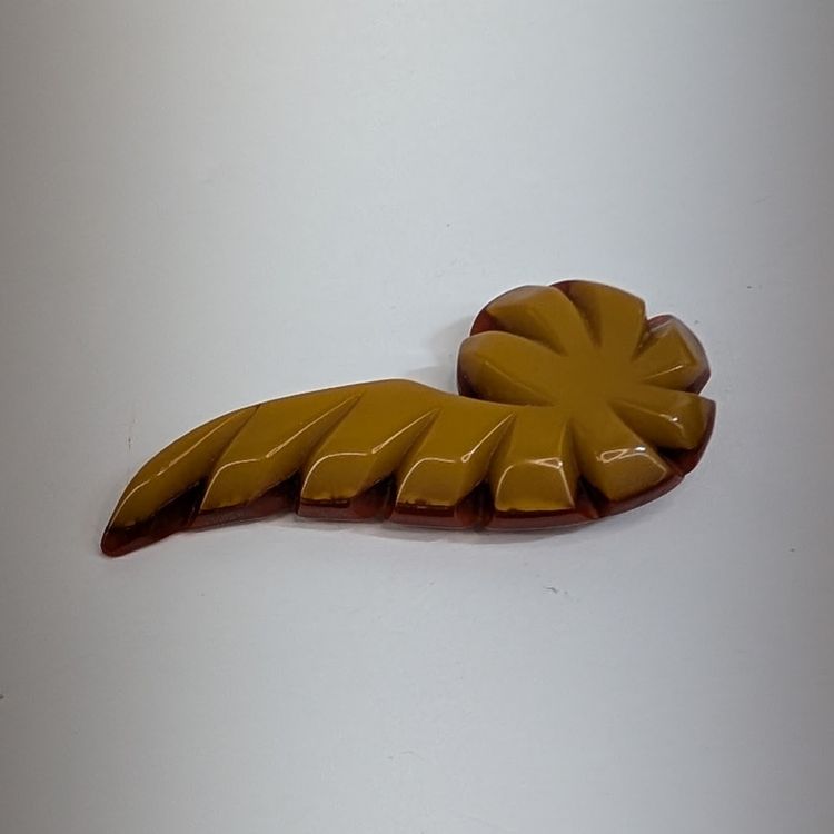 Lovely, caved bakelite brooch with two laminated layers. The bottom is a deep red and the top is a butterscotch color. It is carved through both colors. In nice, used condition (see pictures). Measurements ~ 2-1/2 x 1-1/8"