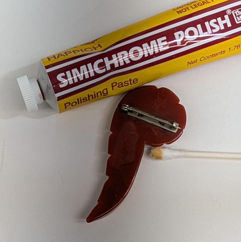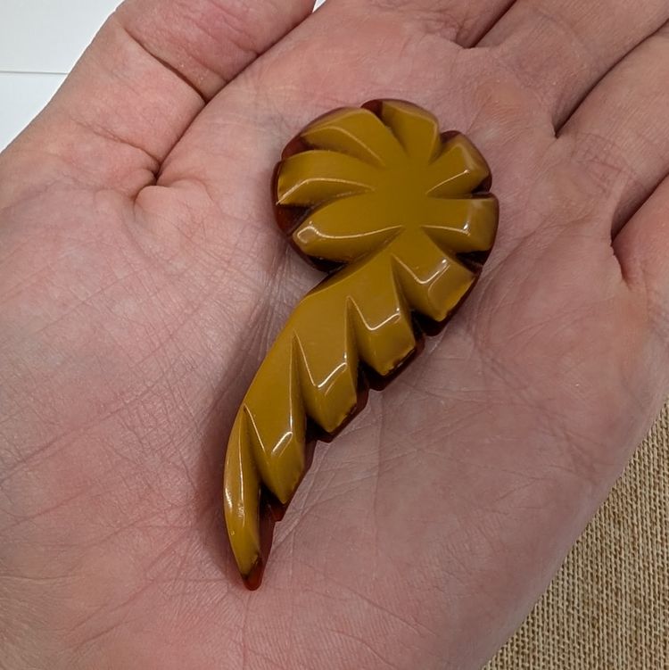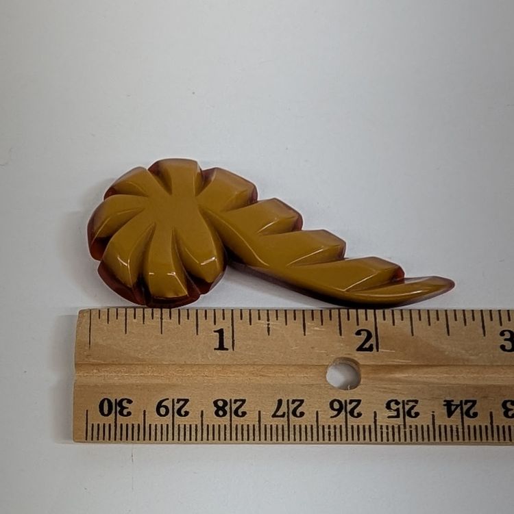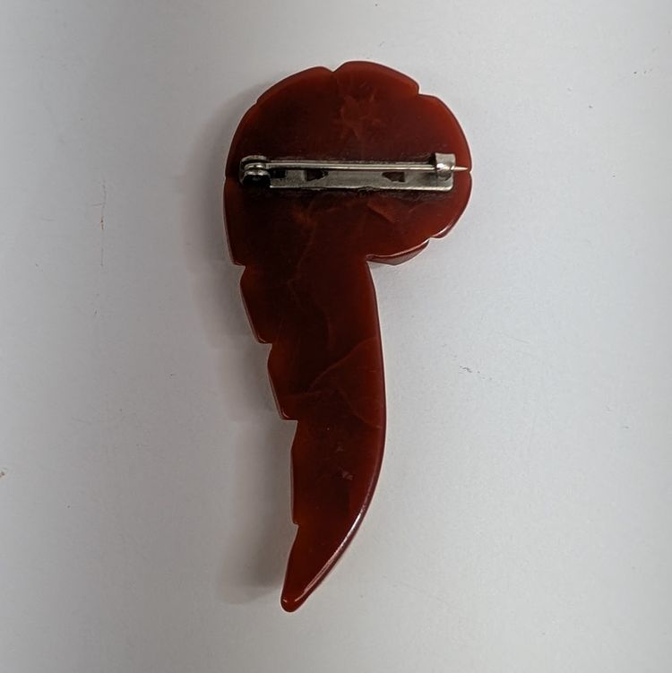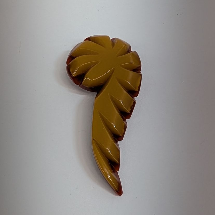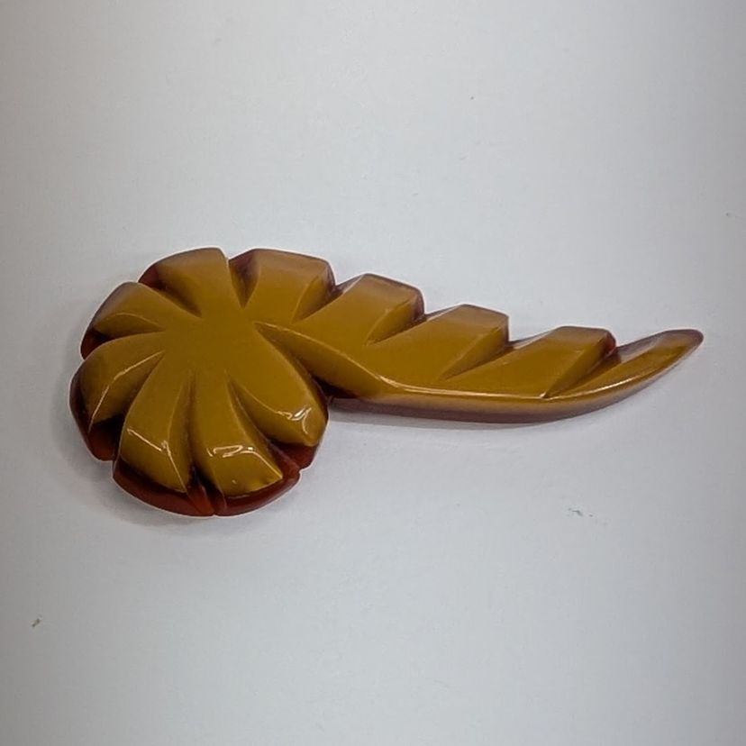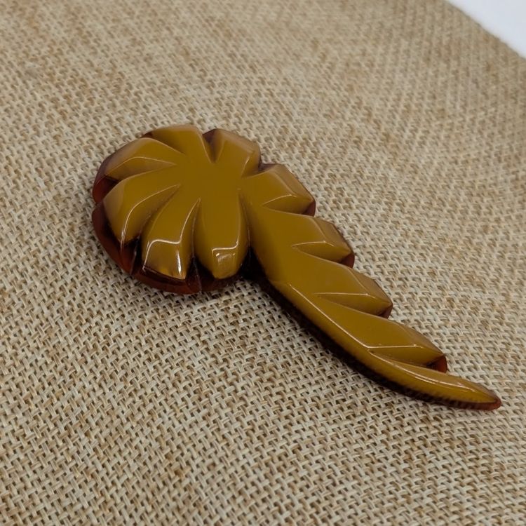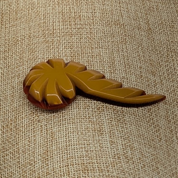 Lovely, caved bakelite brooch with two laminated layers. The bottom is a deep red and the top is a butterscotch color. It is carved through both colors. In nice, used condition (see pictures). Measurements ~ 2-1/2 x 1-1/8"