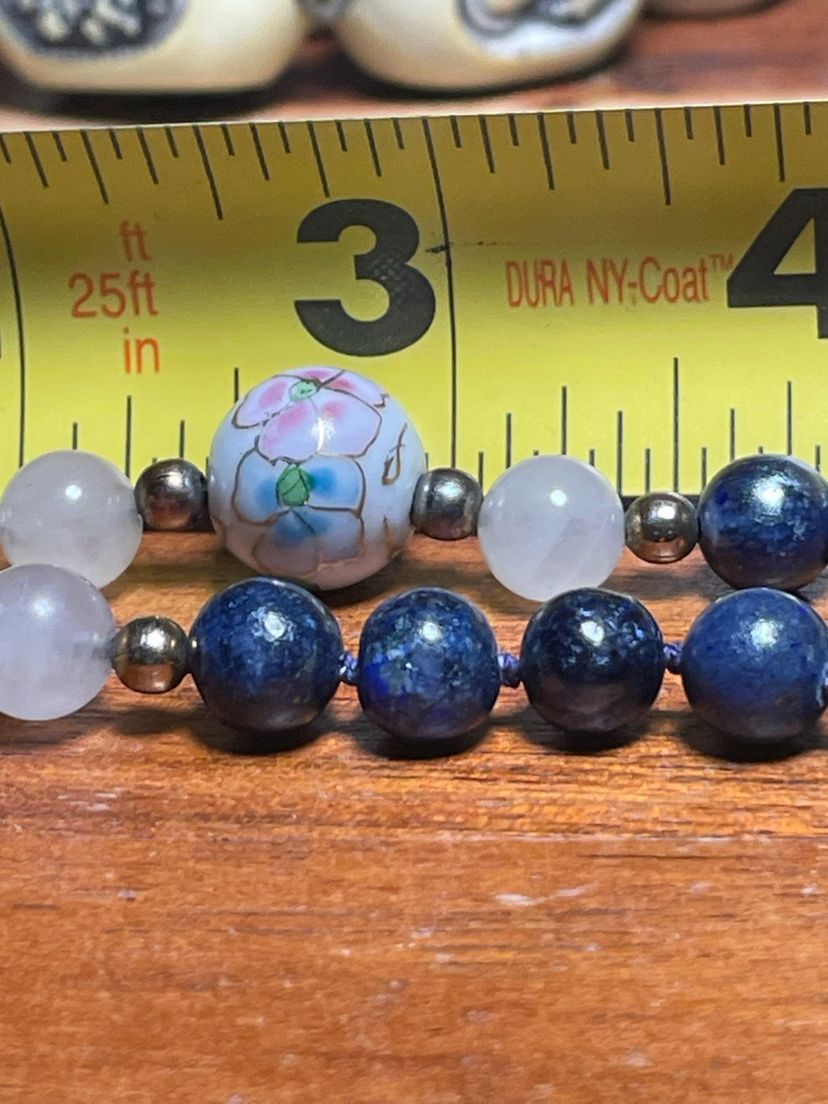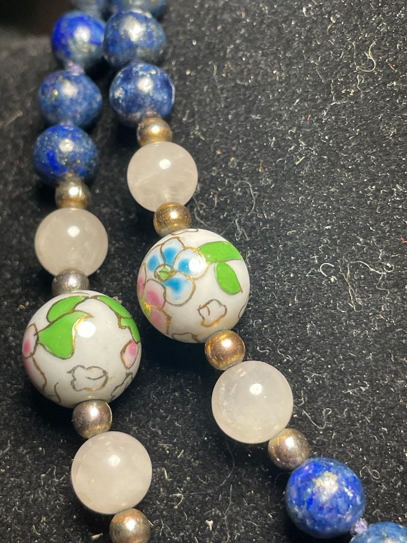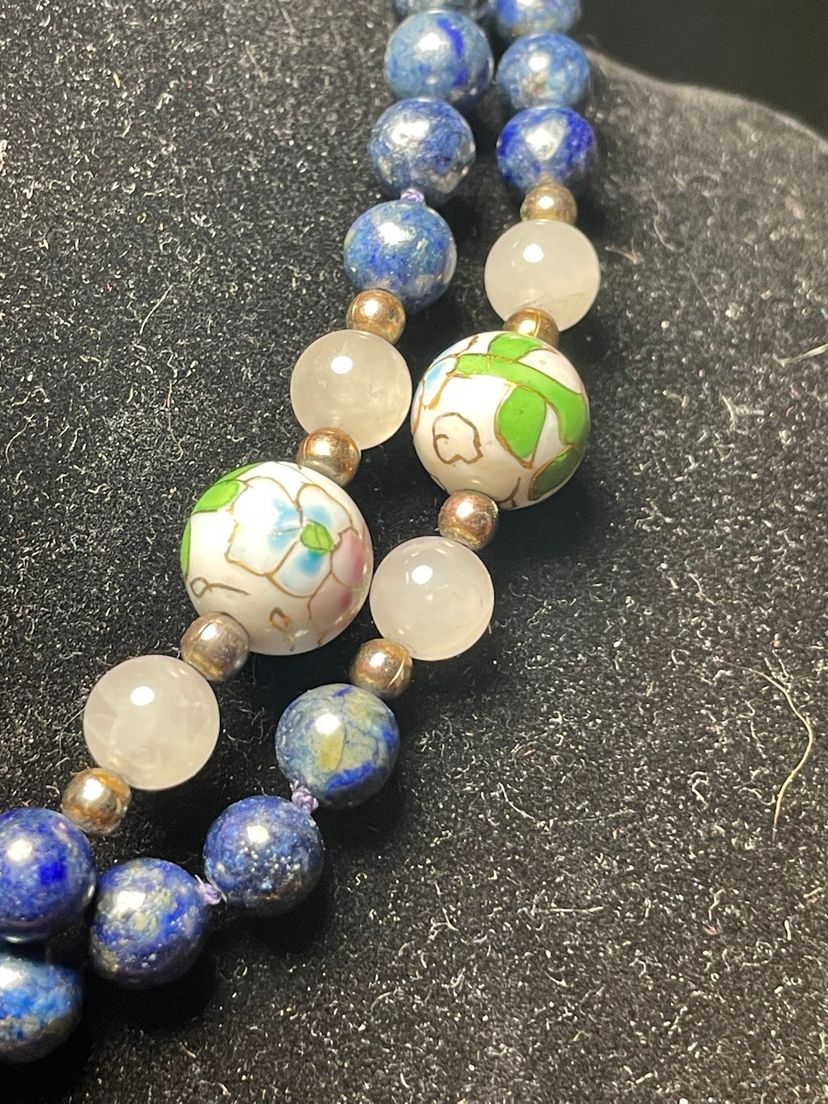 This is a vintage blue enamel floral Chinese cloisonné bead necklace with rose quartz and lapis lazuli beads.