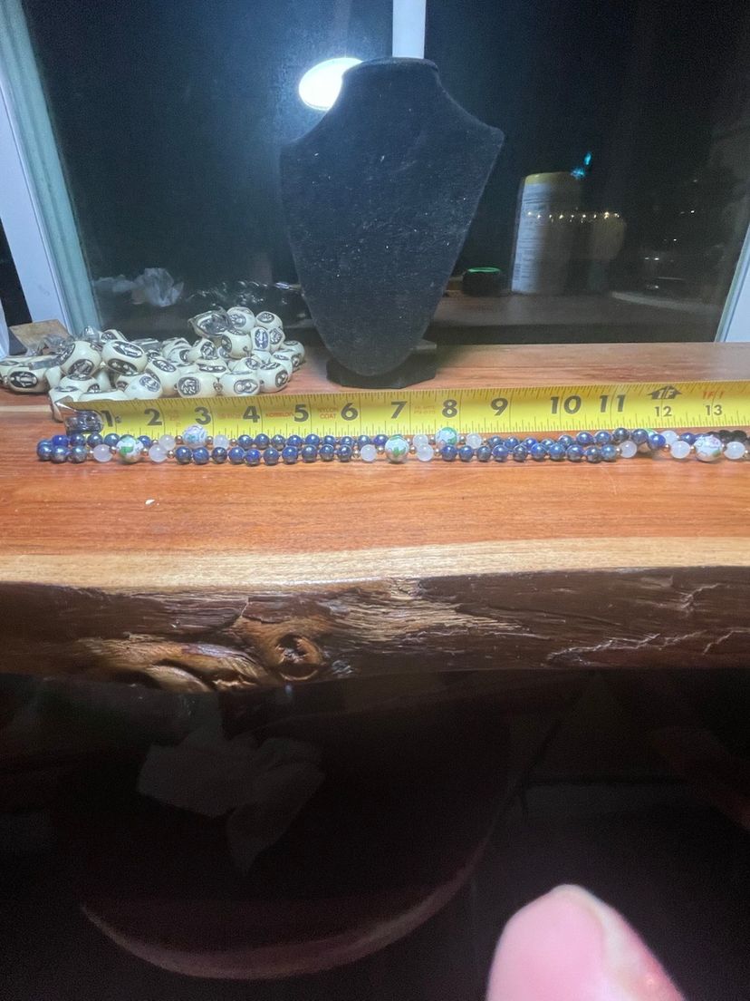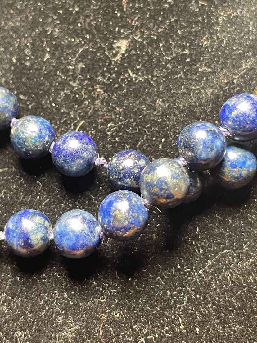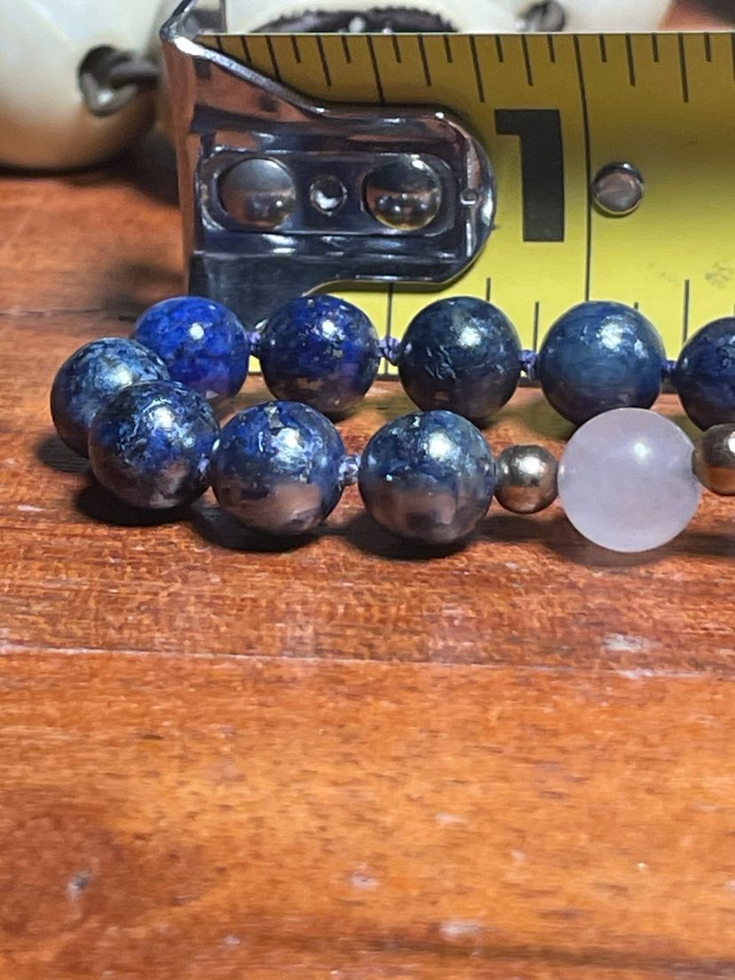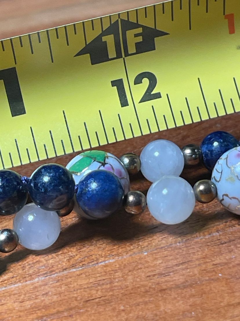 This is a vintage blue enamel floral Chinese cloisonné bead necklace with rose quartz and lapis lazuli beads.