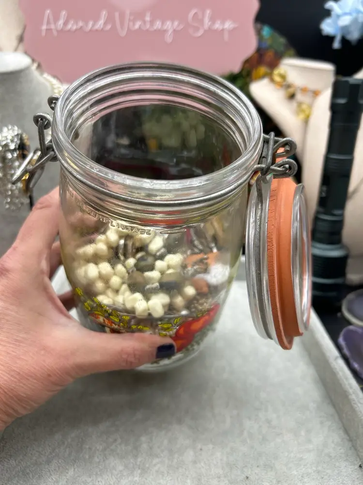 Charming vintage Le Parfait French glass canning jar featuring a colorful mushroom and tomato motif, filled with a curated mix of vintage to modern wearable jewelry. Each jar is a treasure trove of sparkle and surprise — perfect for collectors, resellers, or anyone who loves the thrill of discovery. Display it as vintage kitchen décor or dive in and enjoy the jewelry inside — a true blend of French charm and jewelry joy!