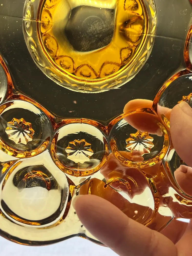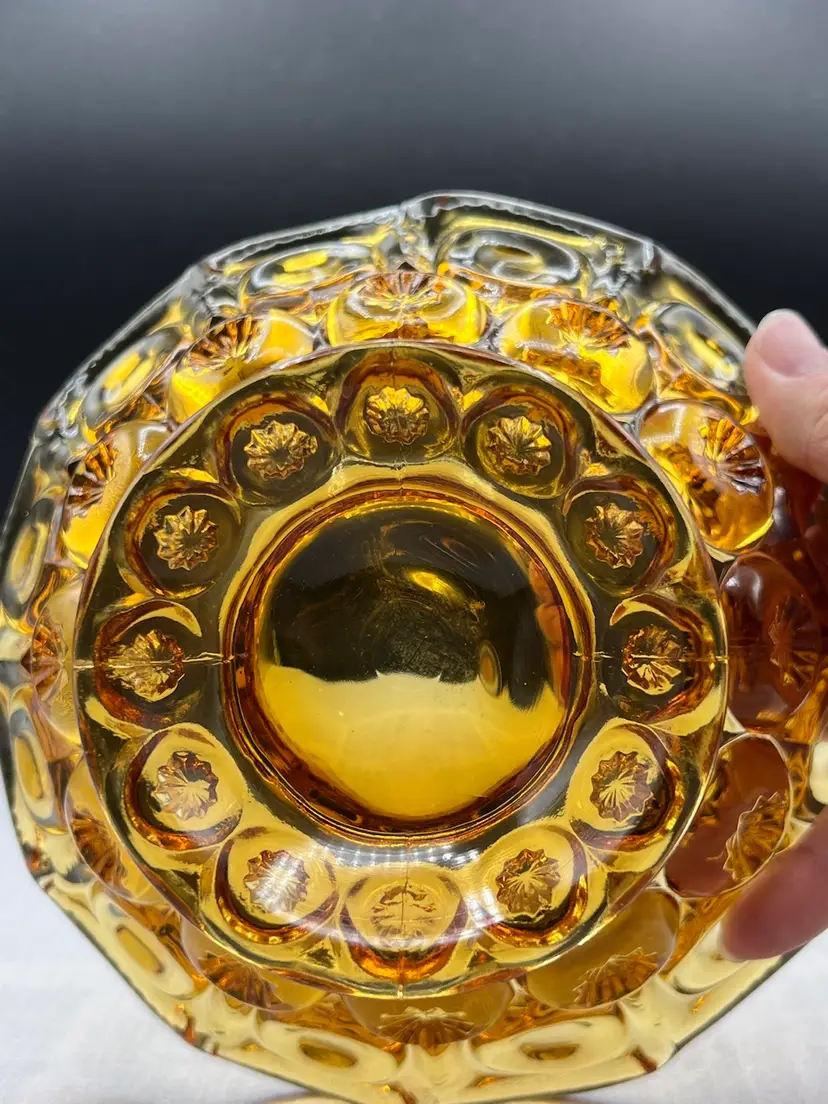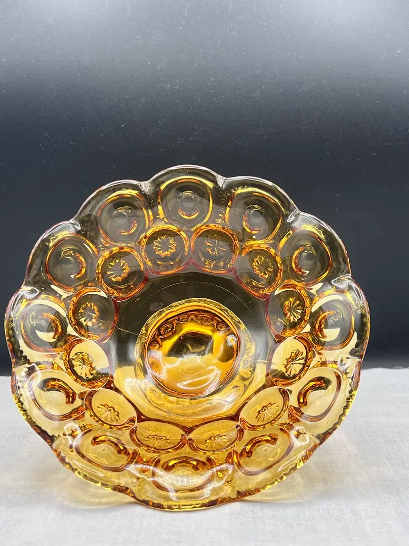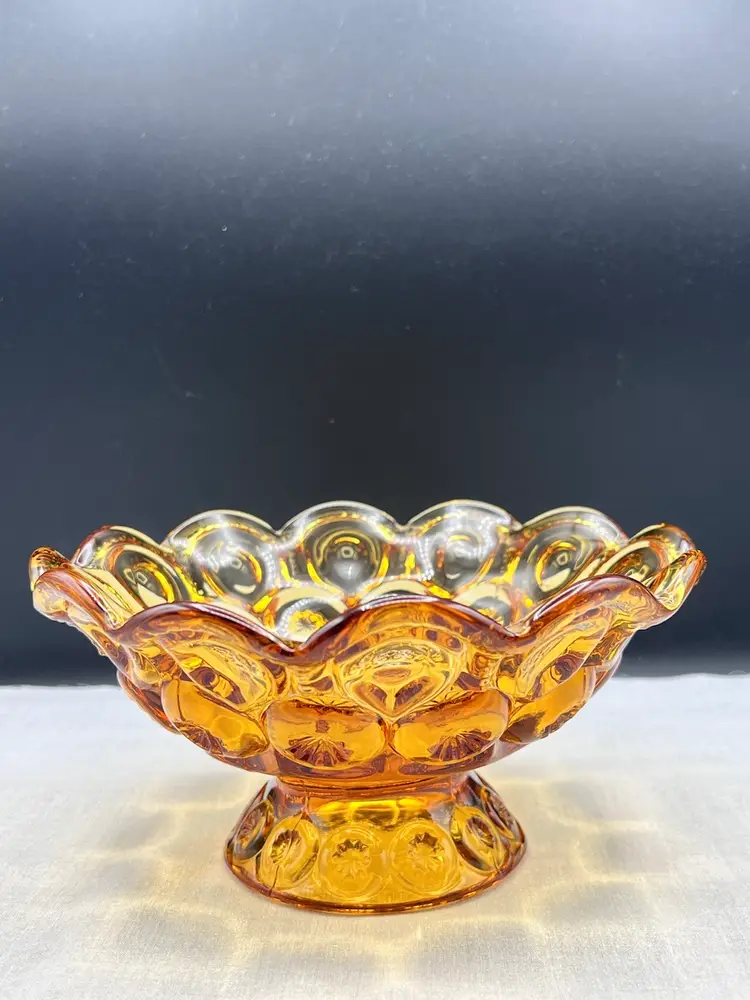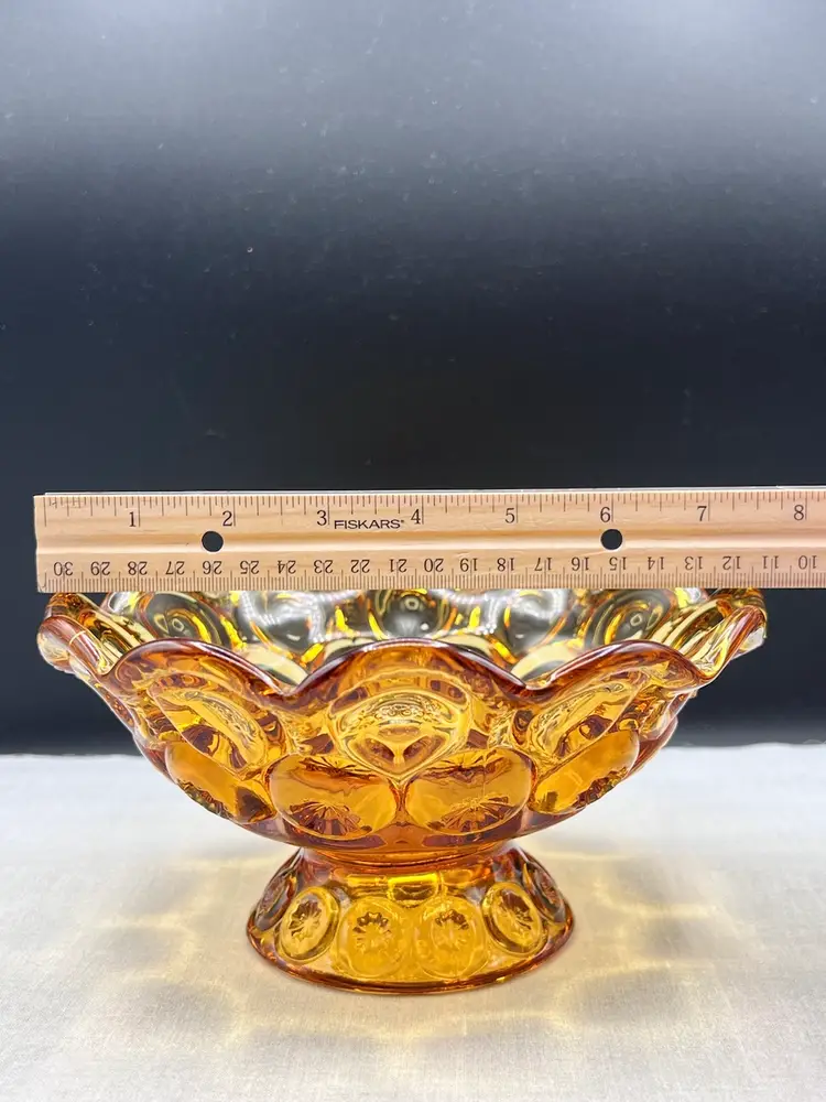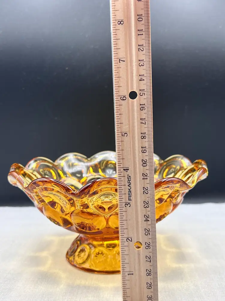 Vintage LE Smith Amber Moon & Stars 3 3/4" x 7 1/2" Footed Bowl 3 3/4" tall x 7 1/2" in diameter In good vintage condition, no chips, cracks or crazing There is one noted scratch in the bowl