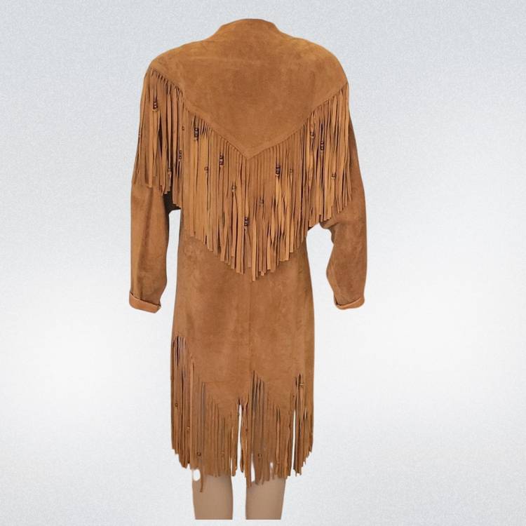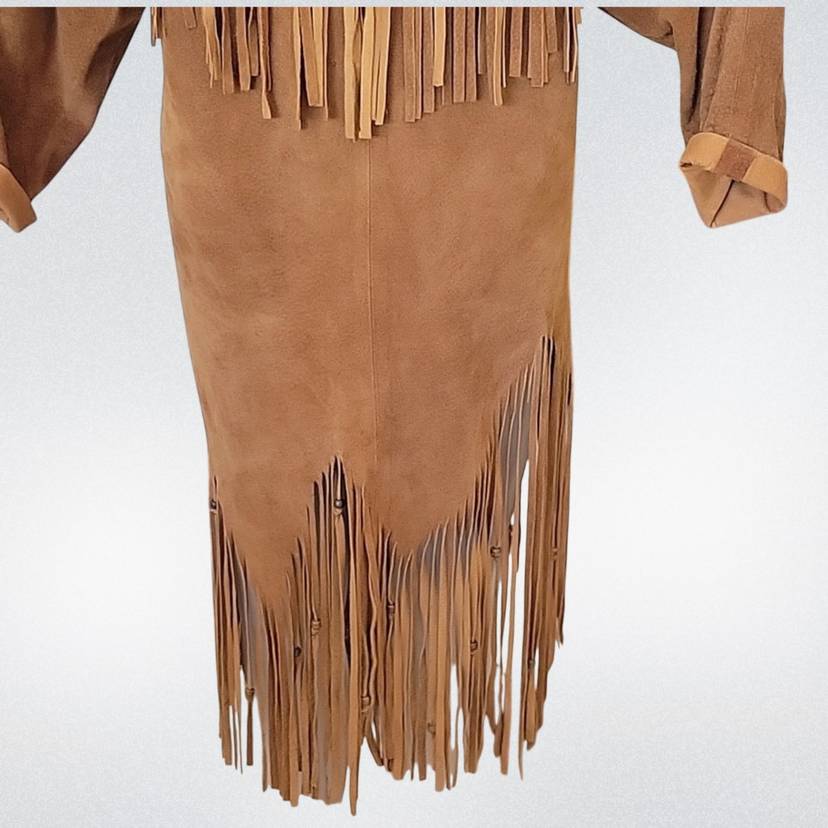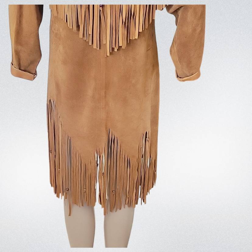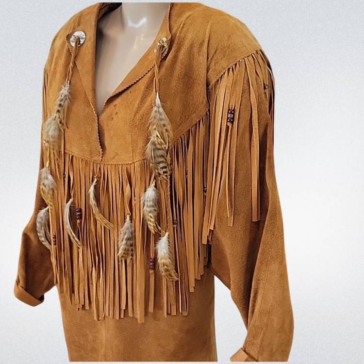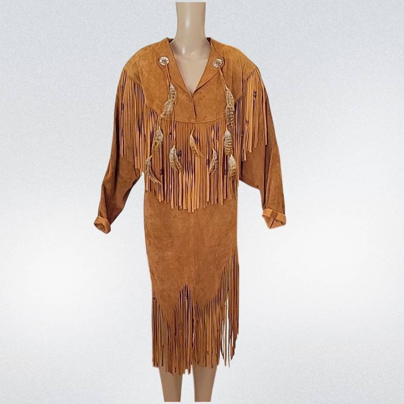 Vtg Suede Leather Fringe, feathers & beads. Western Native American Pullover Dress from late 70's Pre-owned, vintage, does have one area of light spots. see pictures No holes or stiffness in the leather Approx measurements laying flat: 22" pit to pit 19 " shoulder to shoulder 43" total length 21" sleeves