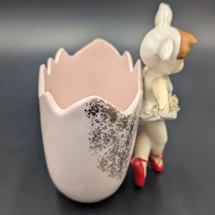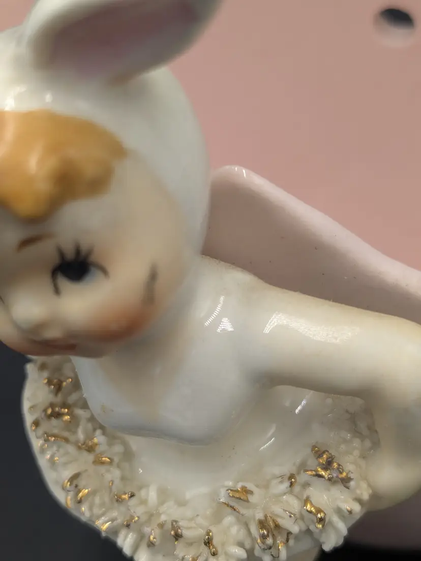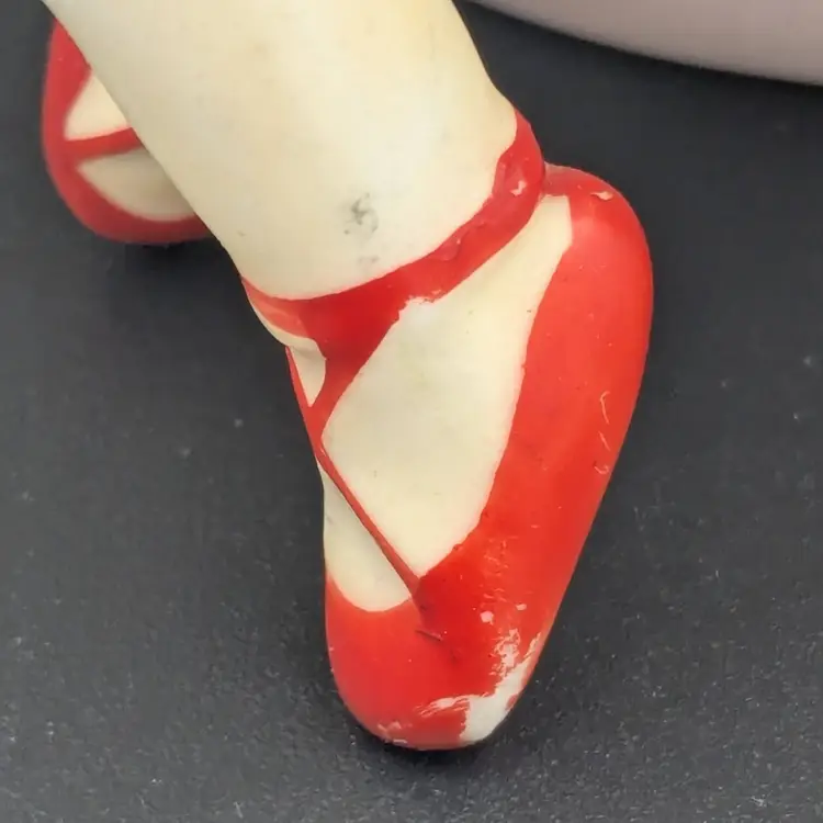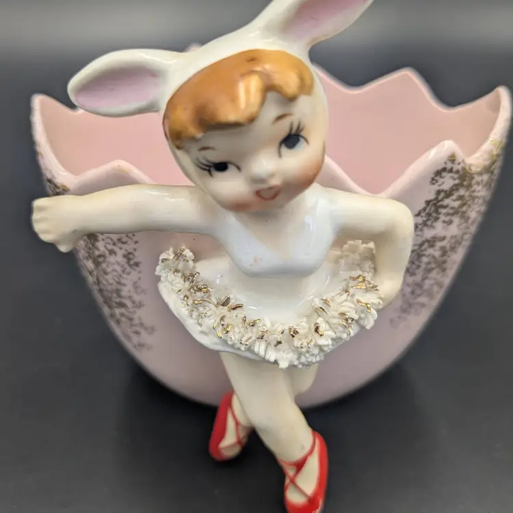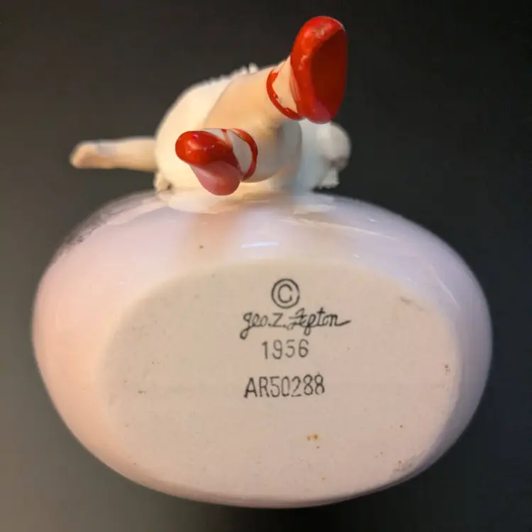 Adorable. Made in 1956. Mold #AR50288. Gold gild is in good condition. Marked on the bottom. Does have a spot of missing red cold paint on the bottom of her ballet slipper, as shown in picture #8. There is a little black scuff mark on her face, as shown in picture #7. I have not tried to clean (will leave up to her new owner). No chips, cracks, breaks or repairs. Shipped with USPS Ground Advantage Mail.