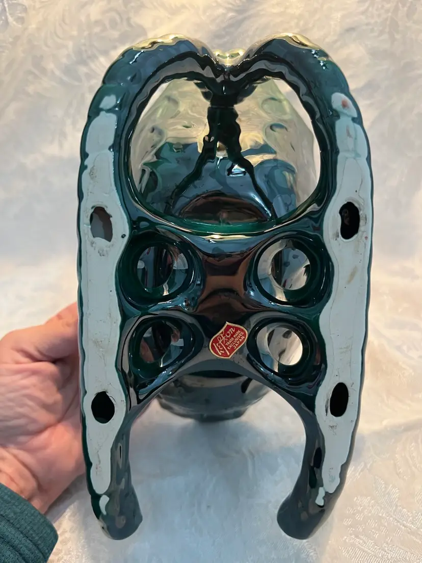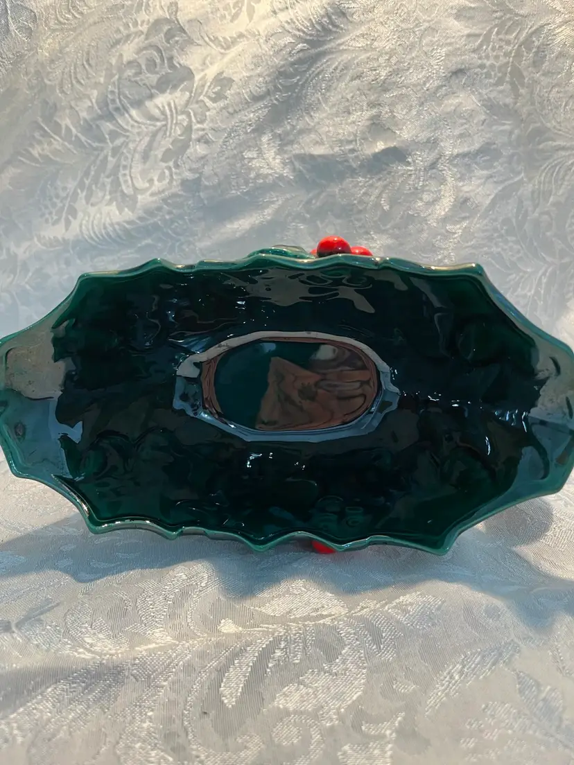 1960s vintage Lefton ceramic sleigh bowl with holly and berry decorations.
