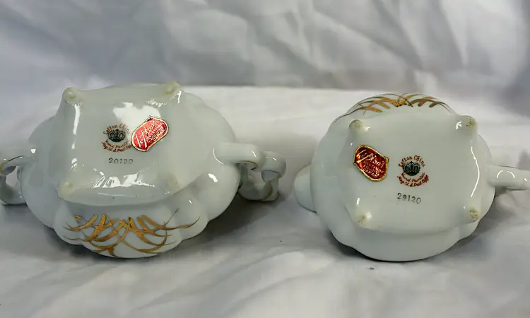 Features hand-painted 24K gold accents depicting wheat stalks on a white porcelain. These are dainty in size. Very Sweet.