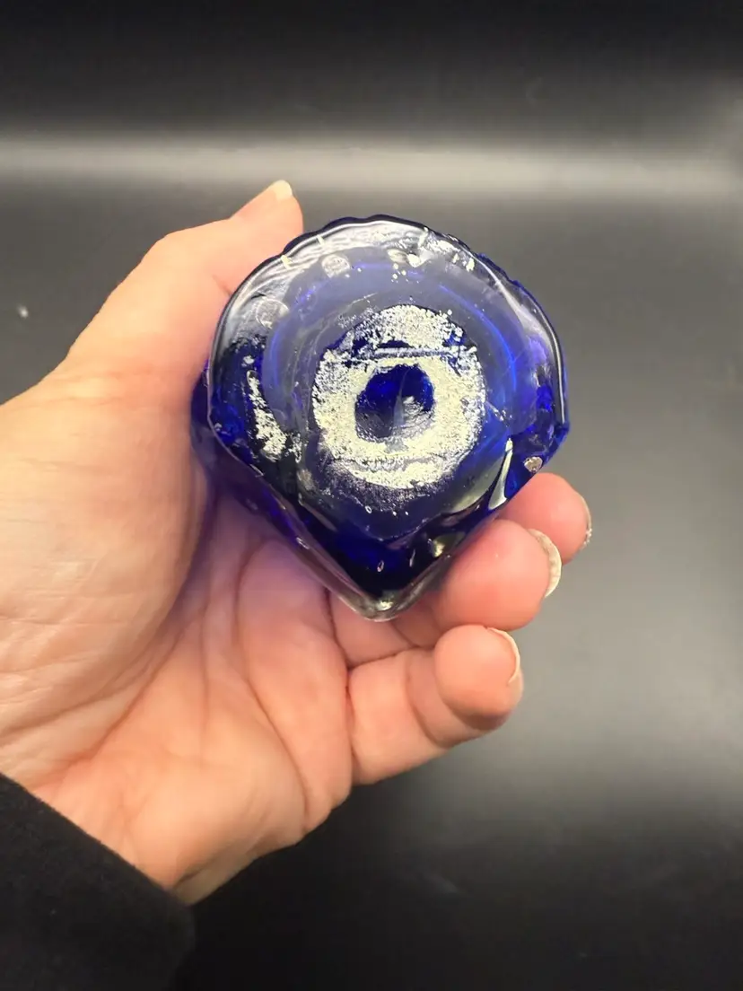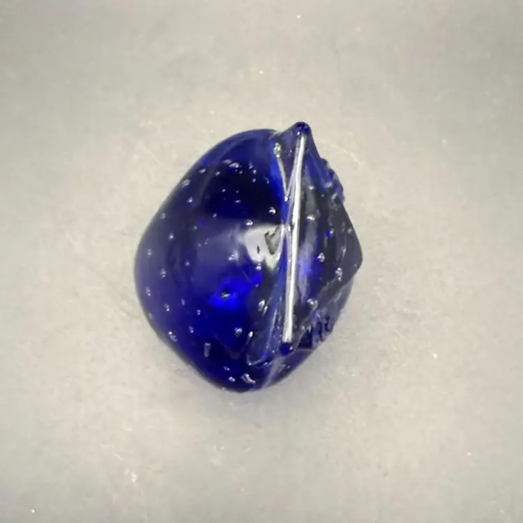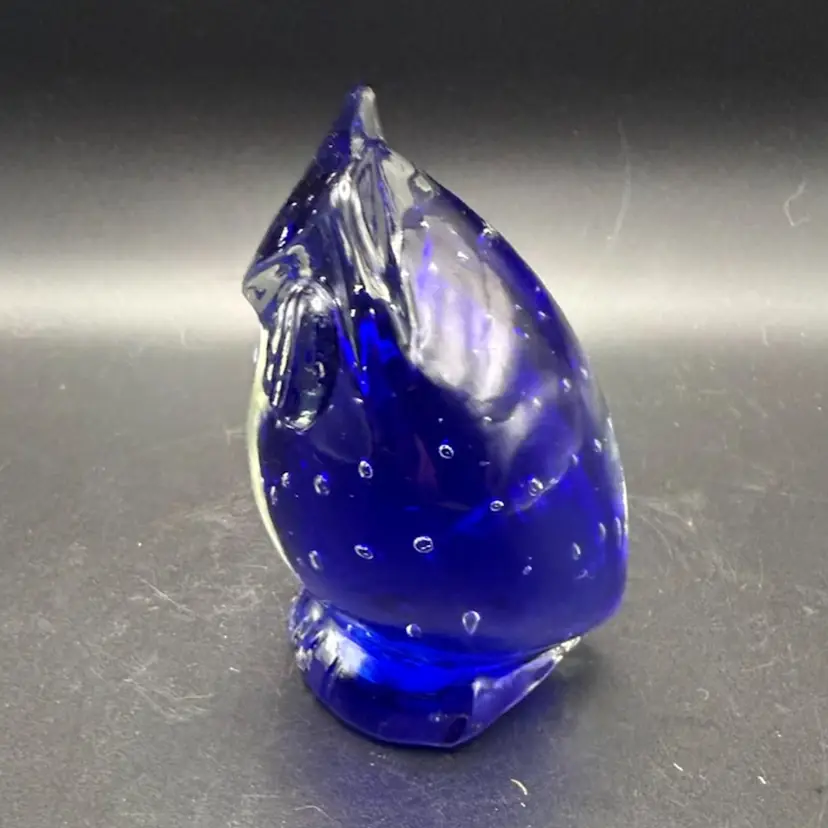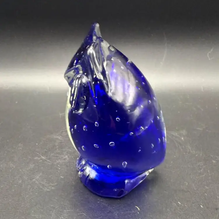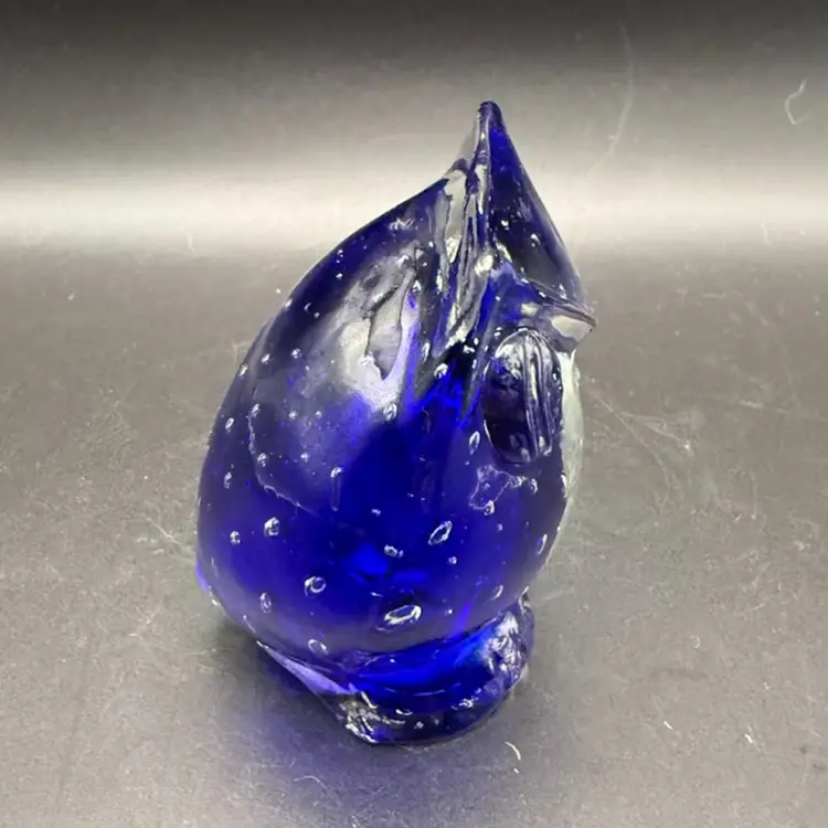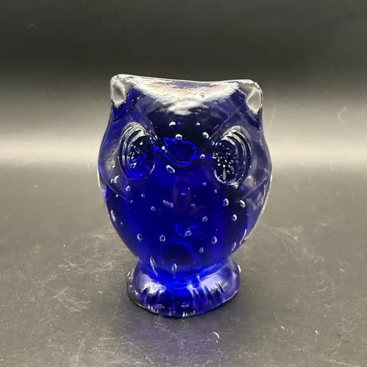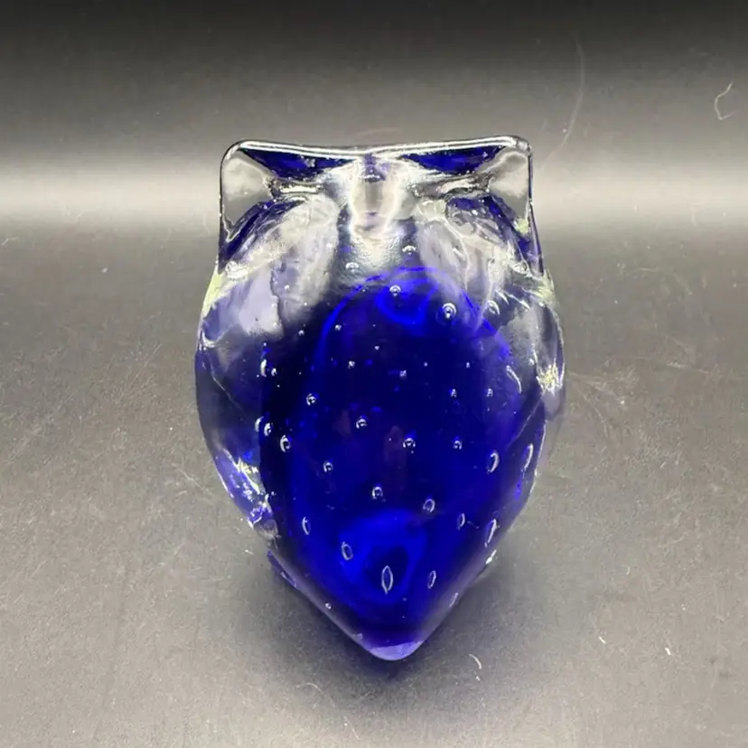Art glass figurines like this owl have been collected for decades, appreciated for their craftsmanship and decorative qualities. The use of vibrant colors, such as the cobalt blue seen here, and the inclusion of internal bubbles are characteristic of certain glassblowing styles from the mid-20th century. Such pieces are often sought after by collectors who appreciate vintage decorative arts and whimsical animal motifs.
