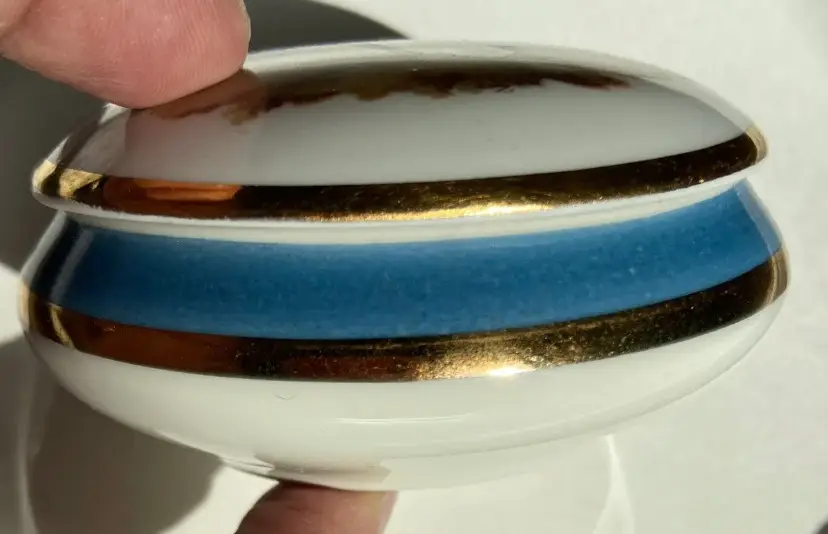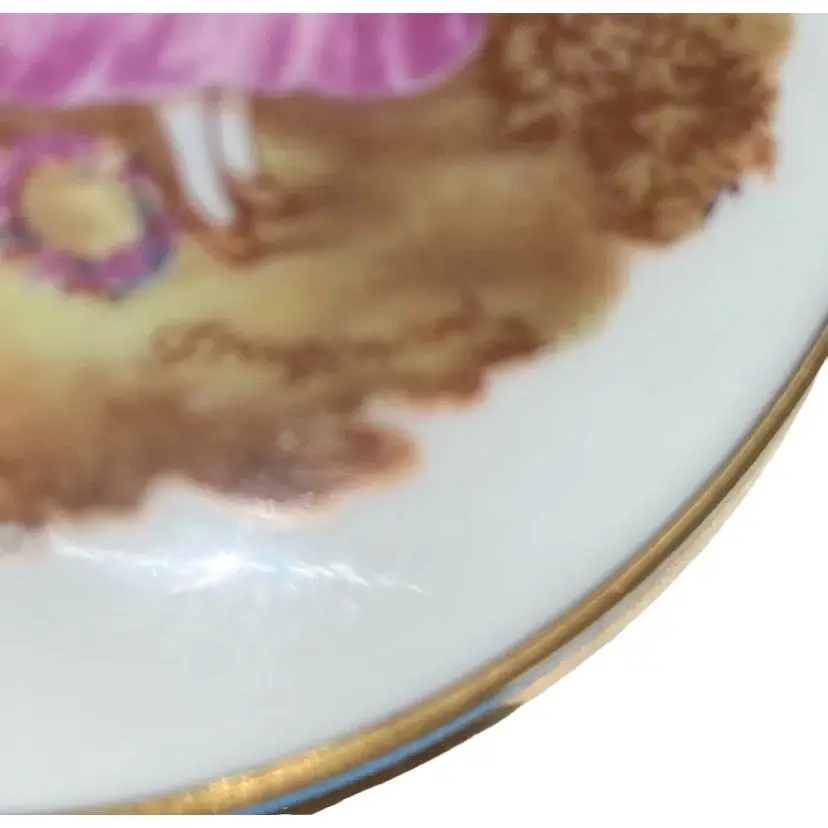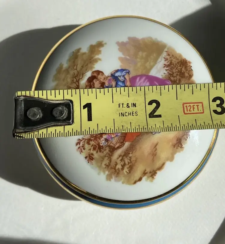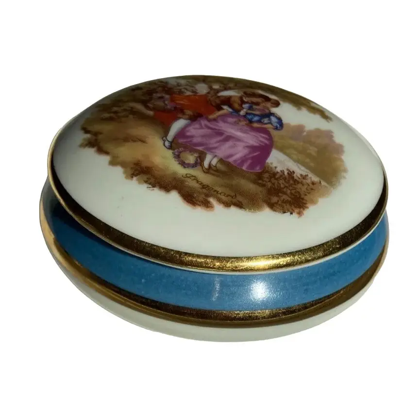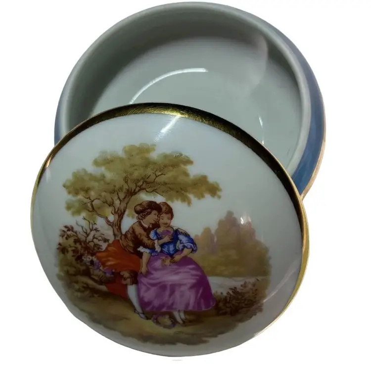 Vintage Limoges France Fragonard 3 1/2” Porcelain Trinket Pill Box- Gold trim. Beautiful piece of art depicting a courting couple!